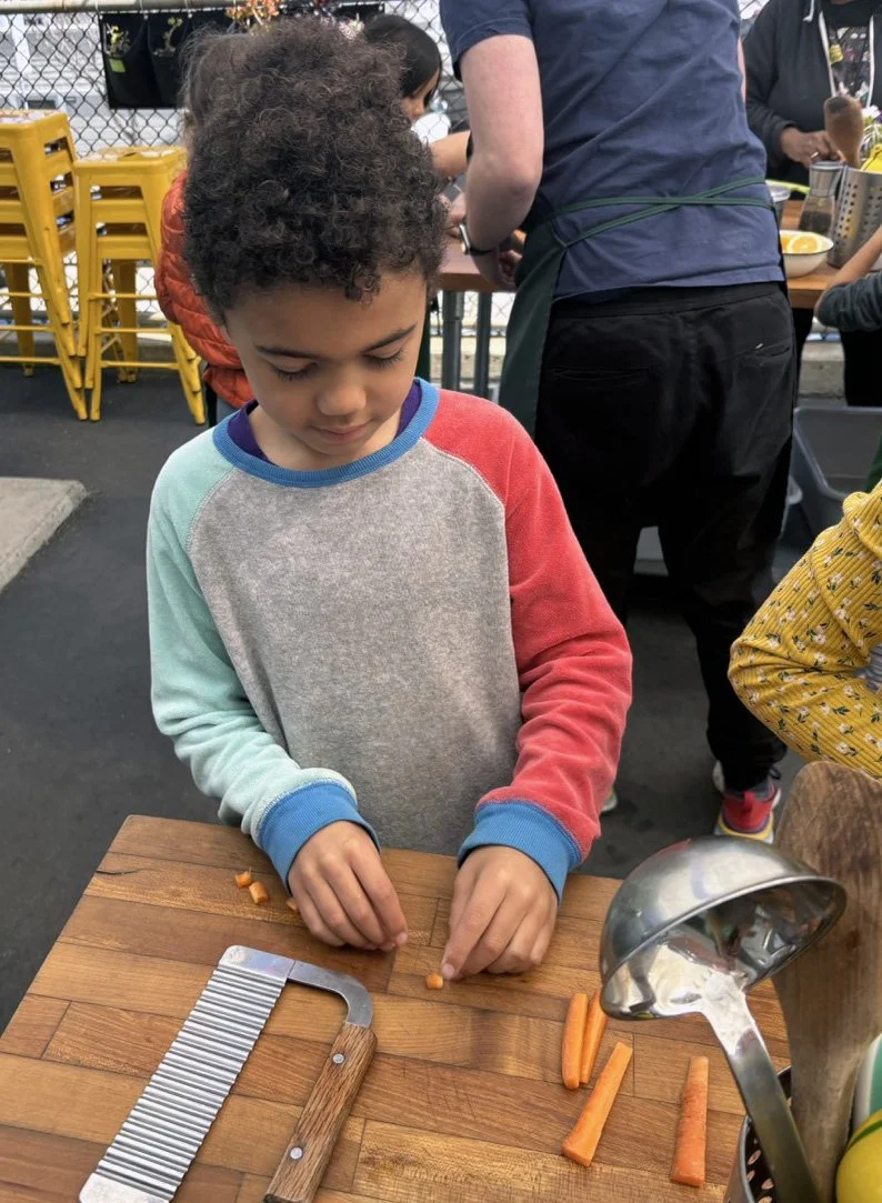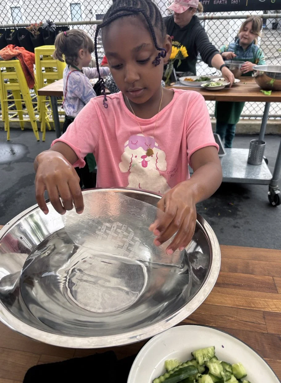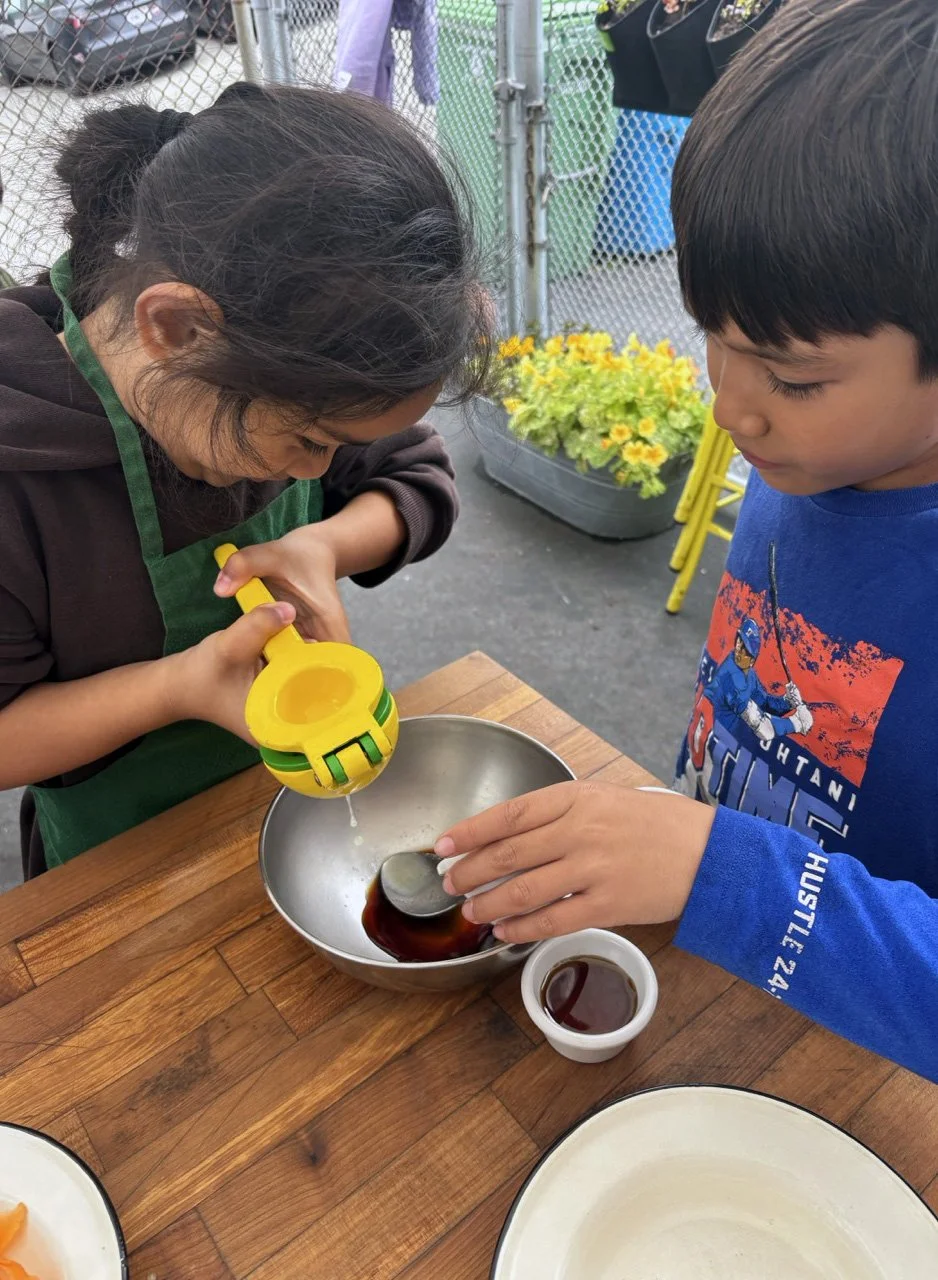 In the kitchen, the first grade chefs made a manoomin salad with several ingredients native to North America: wild rice, cranberries, squash, and pumpkin seeds. We learned to make a salad dressing by slowly drizzling in oil to form an emulsion with lemon juice. Wild rice is nutrient dense and high in protein and fiber. We are grateful we all had a chance to try this delicious ingredient produced by the Red Lake Band of Chippewa Indians via Red Lake Nation Foods and Rainbow Grocery in the Mission District.