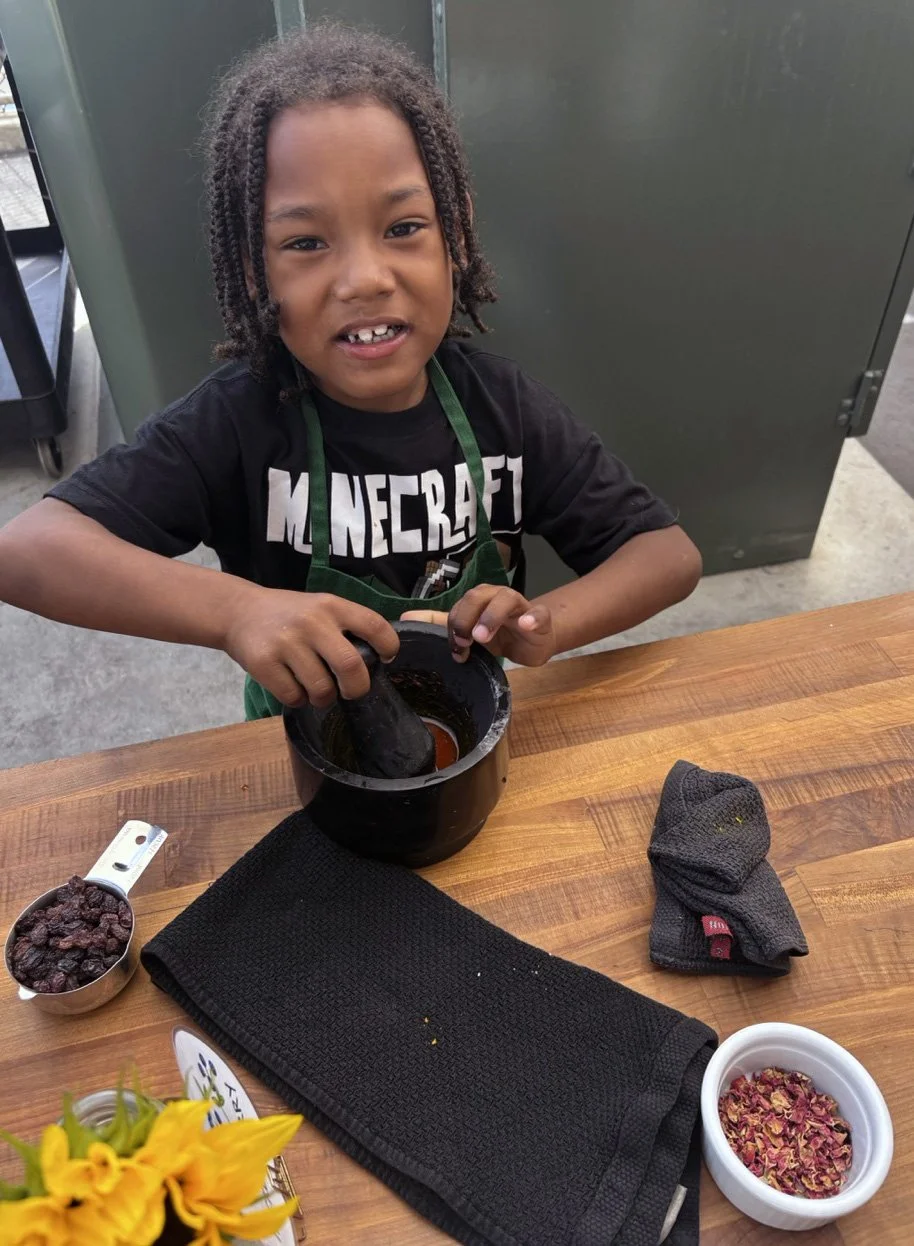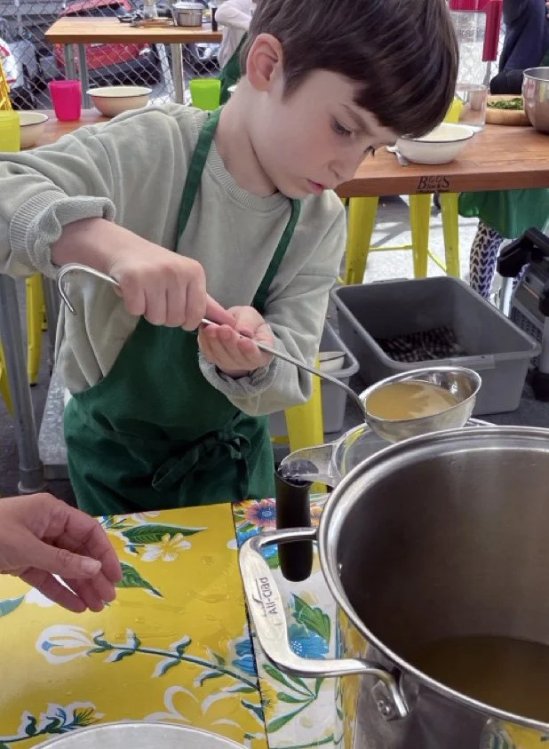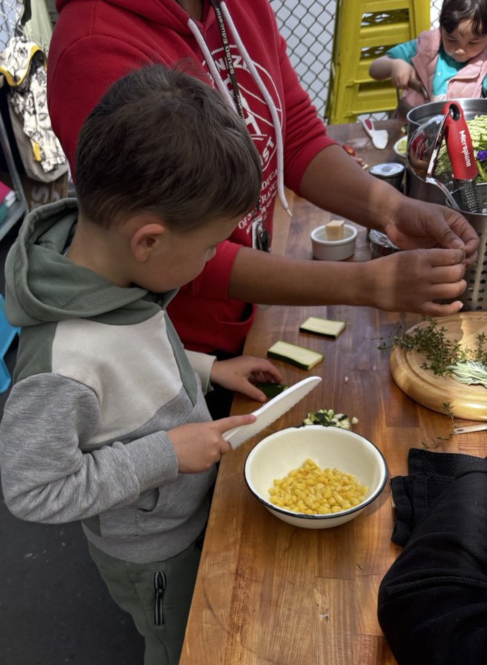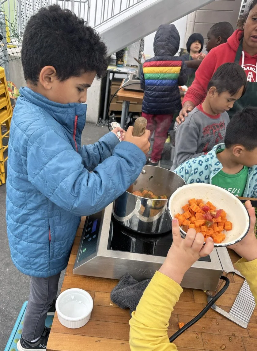 In the kitchen, the first grade chefs made a manoomin salad with several ingredients native to North America: wild rice, cranberries, squash, and pumpkin seeds. We learned to make a salad dressing by slowly drizzling in oil to form an emulsion with lemon juice. Wild rice is nutrient dense and high in protein and fiber. We are grateful we all had a chance to try this delicious ingredient produced by the Red Lake Band of Chippewa Indians via Red Lake Nation Foods and Rainbow Grocery in the Mission District.