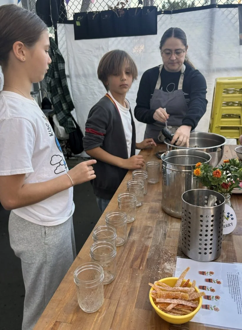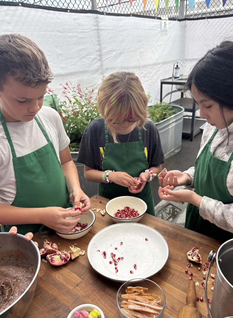 In the kitchen we made a salad highlighting present-day descendants of native Bay Area plants and animals: blackberries, huckleberries, amaranth, sunflowers, amaranth, quail, elderberry, and walnut. The second and third grade chefs used a mortar and pestle to make a simple dressing, connecting to ancient food traditions and technology human beings have employed for thousands of years.