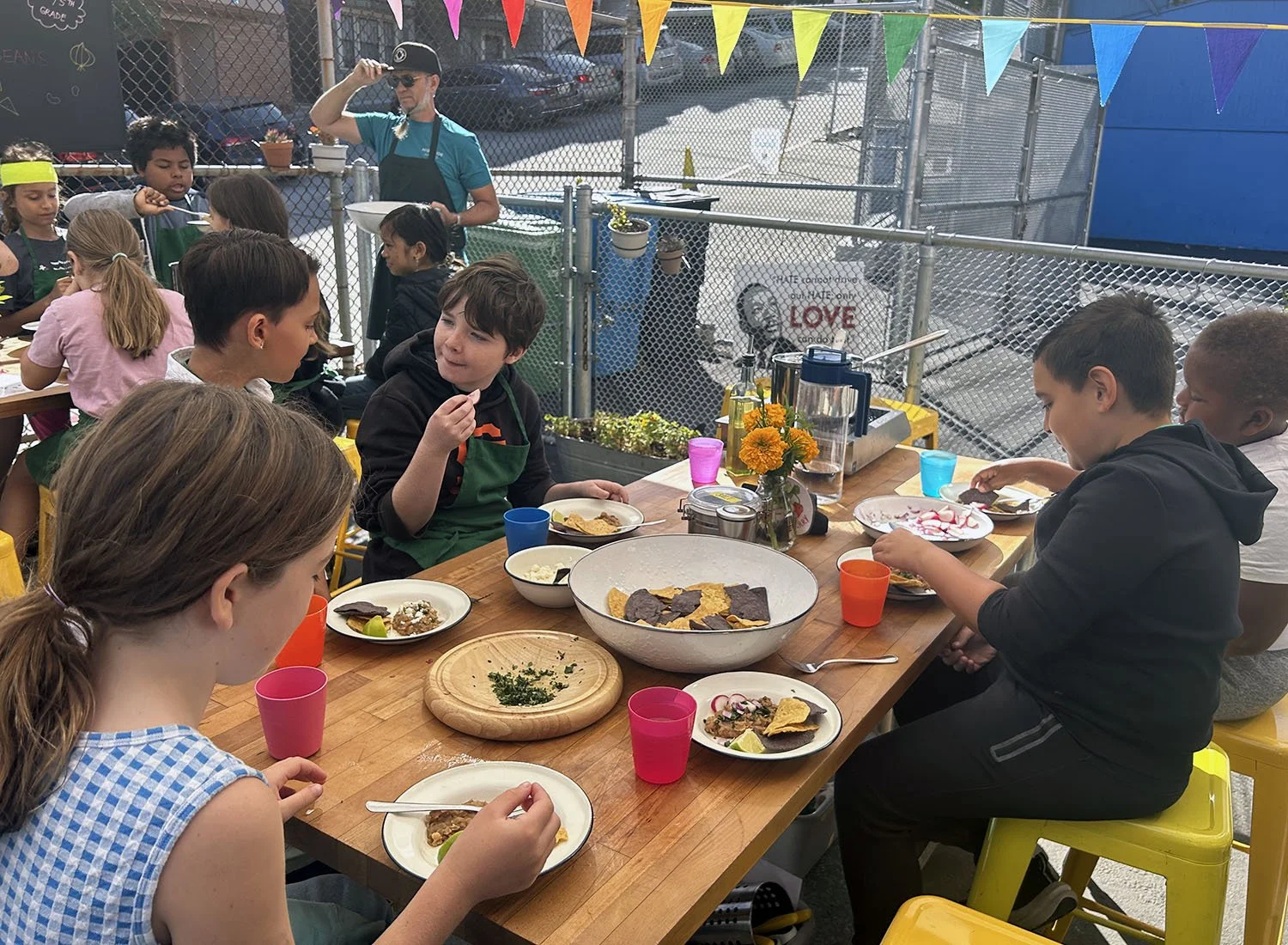 In the kitchen we made a vegan recipe of refried beans and enjoyed them with blue and yellow tortilla chips from Sabor Mexicano, queso fresco, cilantro and oregano from our school garden, red onion, radish, and fresh lime juice. Our closing circle question asked the chefs if they would choose beans over beef and a surprisingly high number of them responded “most of the time,” “definitely,” “maybe,” and “probably.”