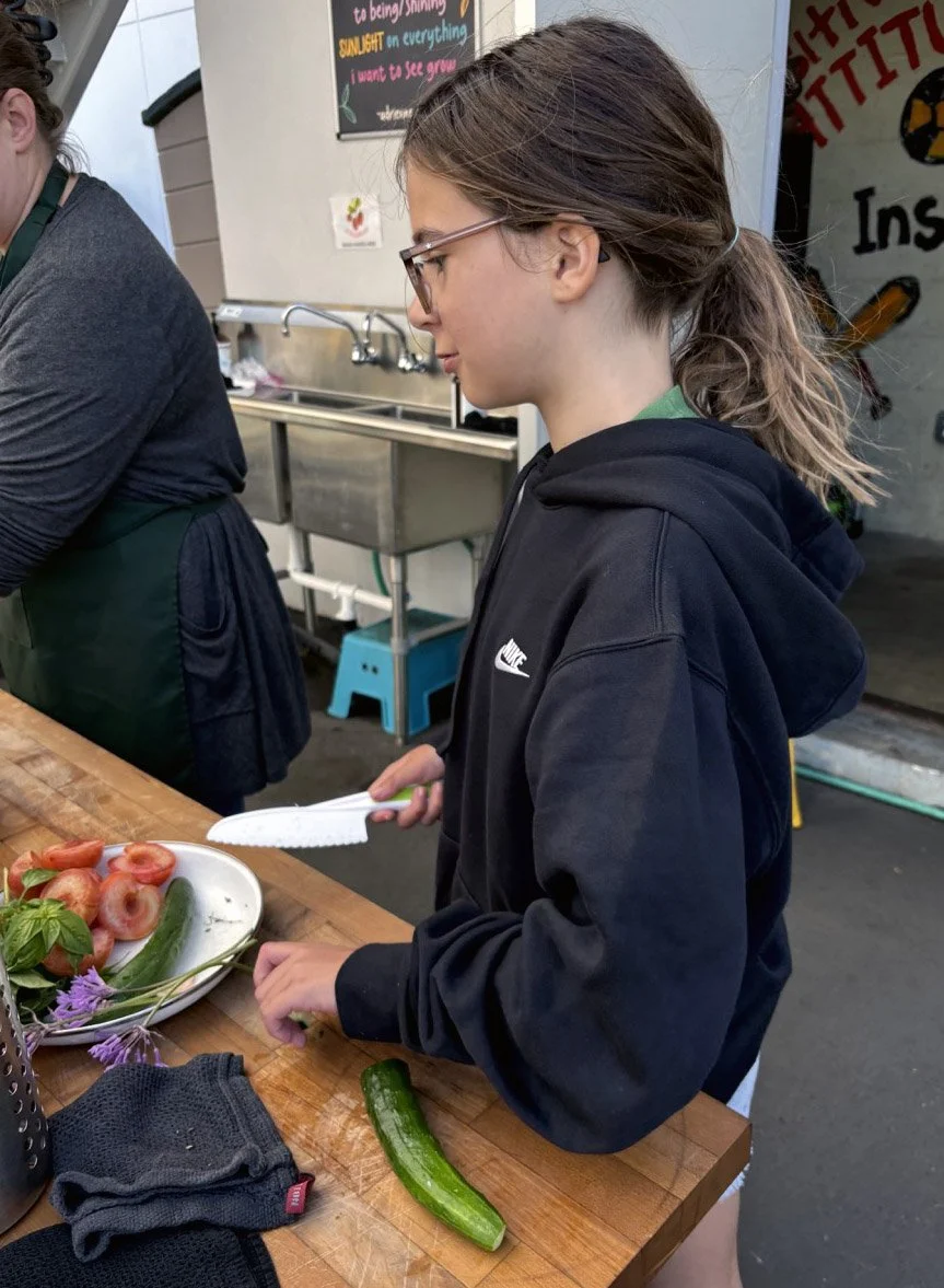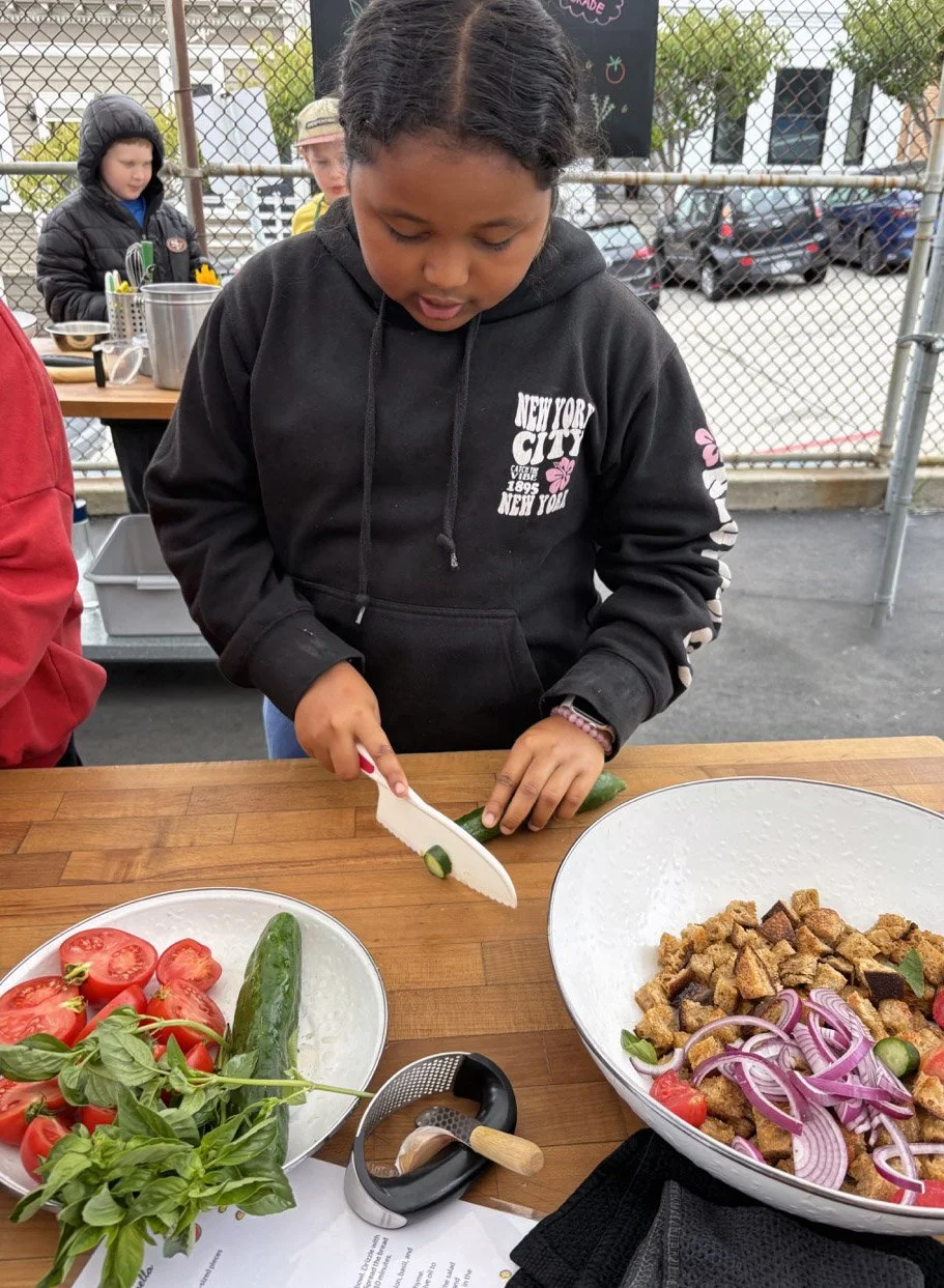 There was quite a bit of chopping involved in this salad, as well as making a salad dressing and adding in fresh herbs such as thyme (which we grew in our own school garden!) and basil. We added a little fresh mozzarella to the mix, and only wish there had been a bit more time for the bread pieces to soak up the dressing before we had to eat, though this didn’t stop some chefs from having four servings before our closing circle.