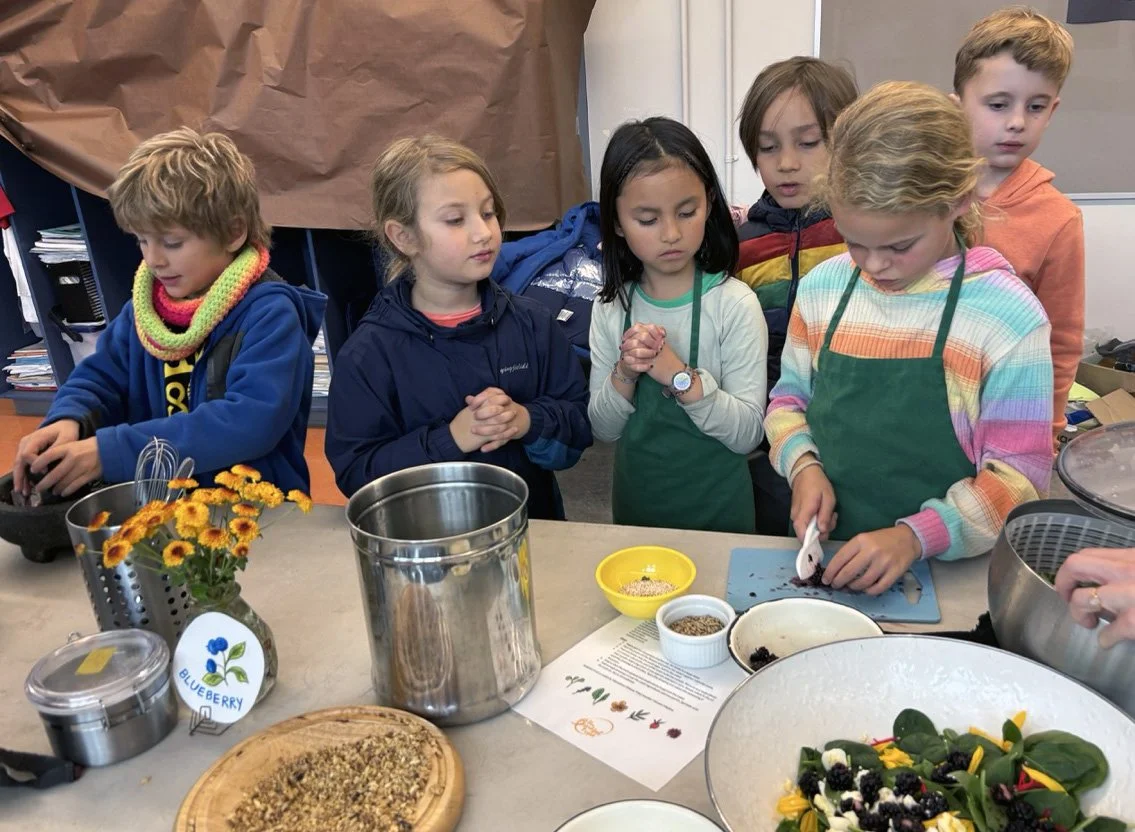In the kitchen we made a salad highlighting present-day descendants of native Bay Area plants and animals: blackberries, huckleberries, amaranth, sunflowers, amaranth, quail, elderberry, and walnut. The second and third grade chefs used a mortar and pestle to make a simple dressing, connecting to ancient food traditions and technology human beings have employed for thousands of years.