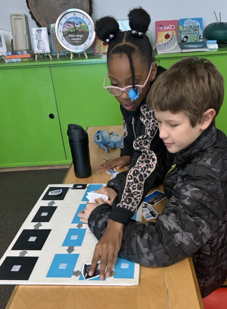 Both 4/5 classrooms had the chance this month to visit the Recology transfer station, where San Francisco’s green, blue, and grey/black bins arrive daily to be processed for compost, recycling, and landfill. Students first participated in two classroom activities involving sorting materials into the different bins and following a milk carton’s journey from the forest to either the grey/black bin or the blue bin. We learned that if we toss a milk carton into the bin destined for landfill, we create a linear system that needs to be restarted from a natural resource each time we need a new milk carton. In contrast, if we toss a milk carton into the bin destined for recycling, we create a circular system where the used cardboard can be remade into a new milk carton ad infinitum, which helps protect and sustain our natural resources.