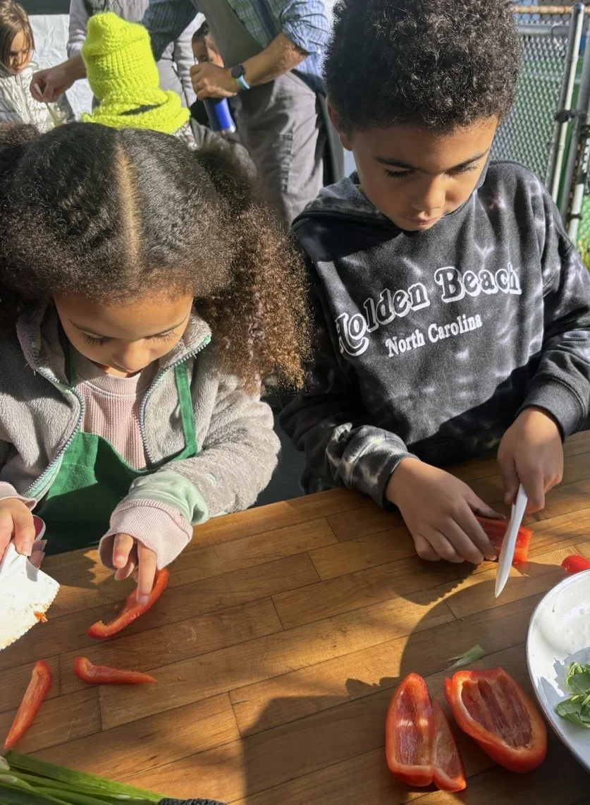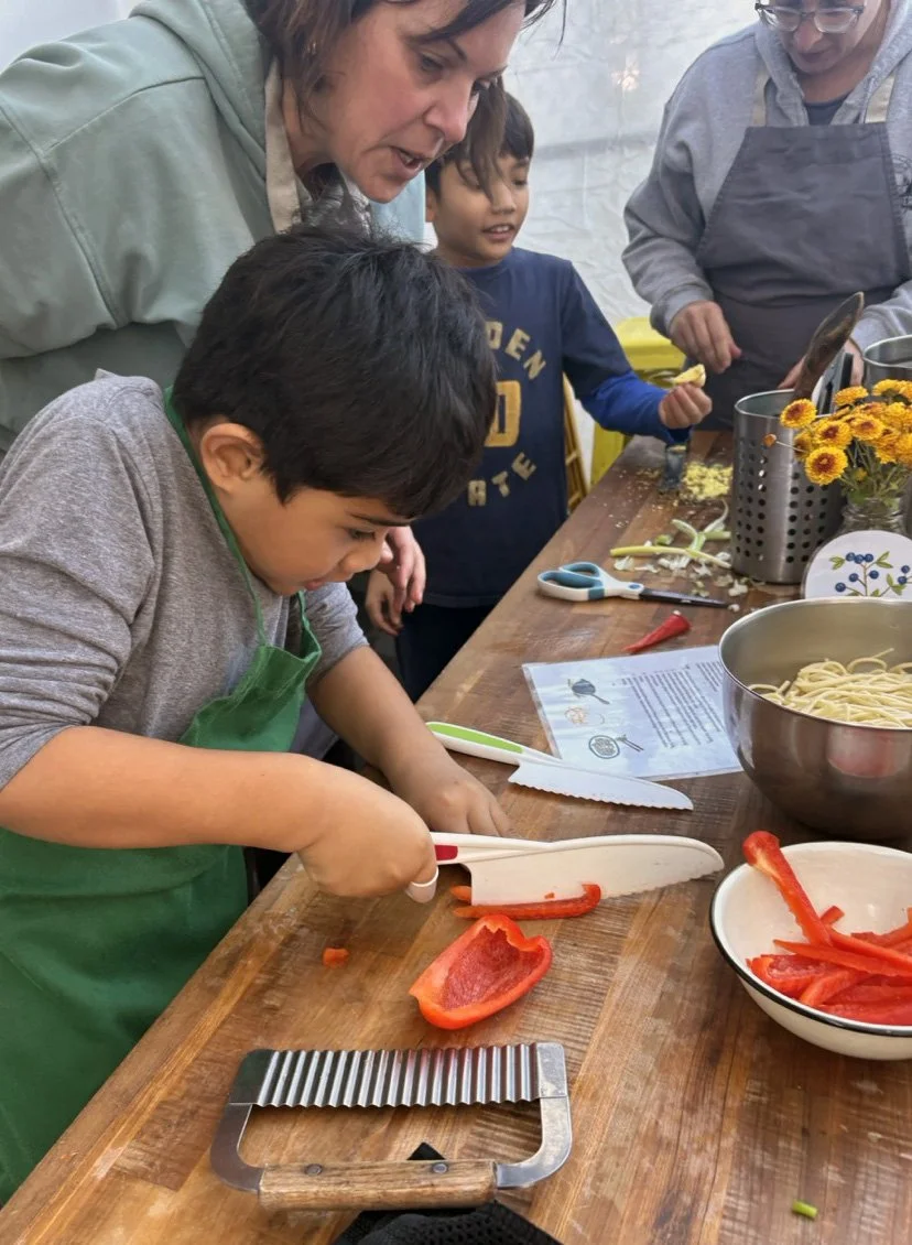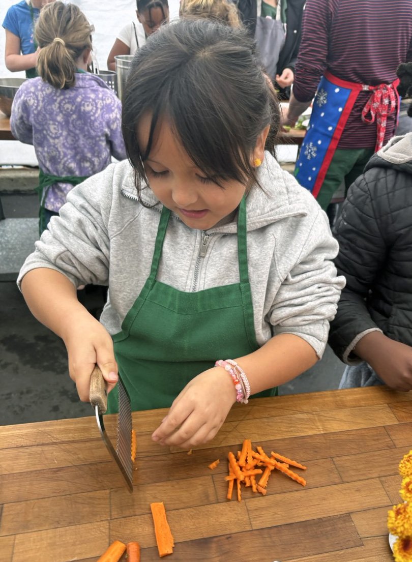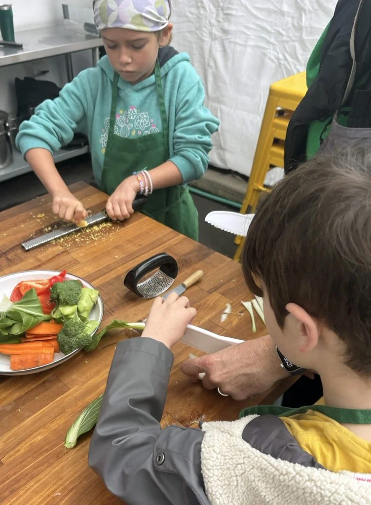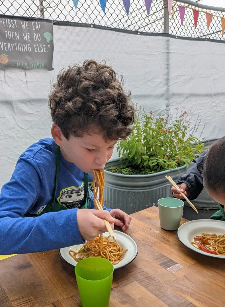 In the kitchen classroom we made lo mein with bok choy (a traditional Chinese vegetable named in the book we read) and lots of other delicious local vegetables. We learned that “lo” means to stir or toss and “mein” means noodles in Cantonese. Lo mein is a dish where the cooked noodles are tossed in a sauce as opposed to chow mein, where the noodles are fried. The second and third grade chefs enjoyed enjoyed practicing their chopstick skills once the table was set!