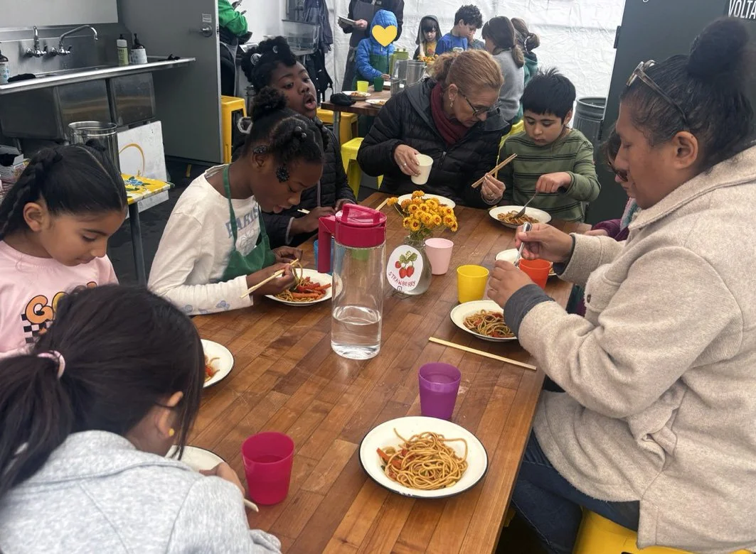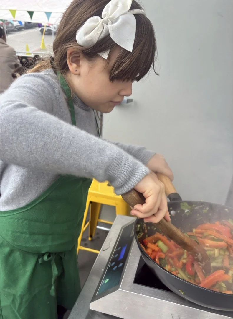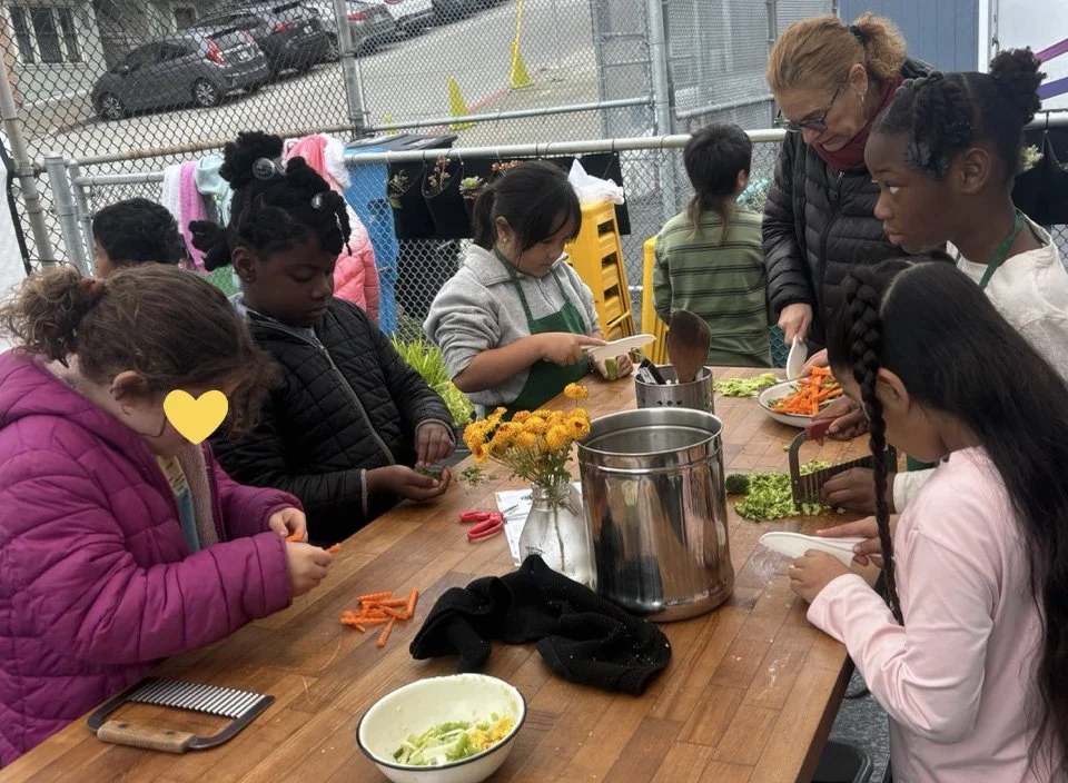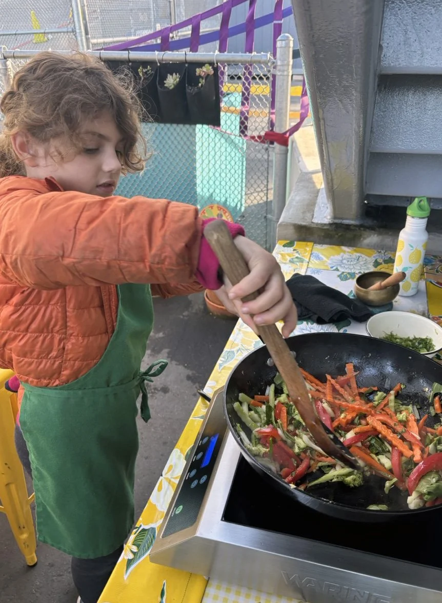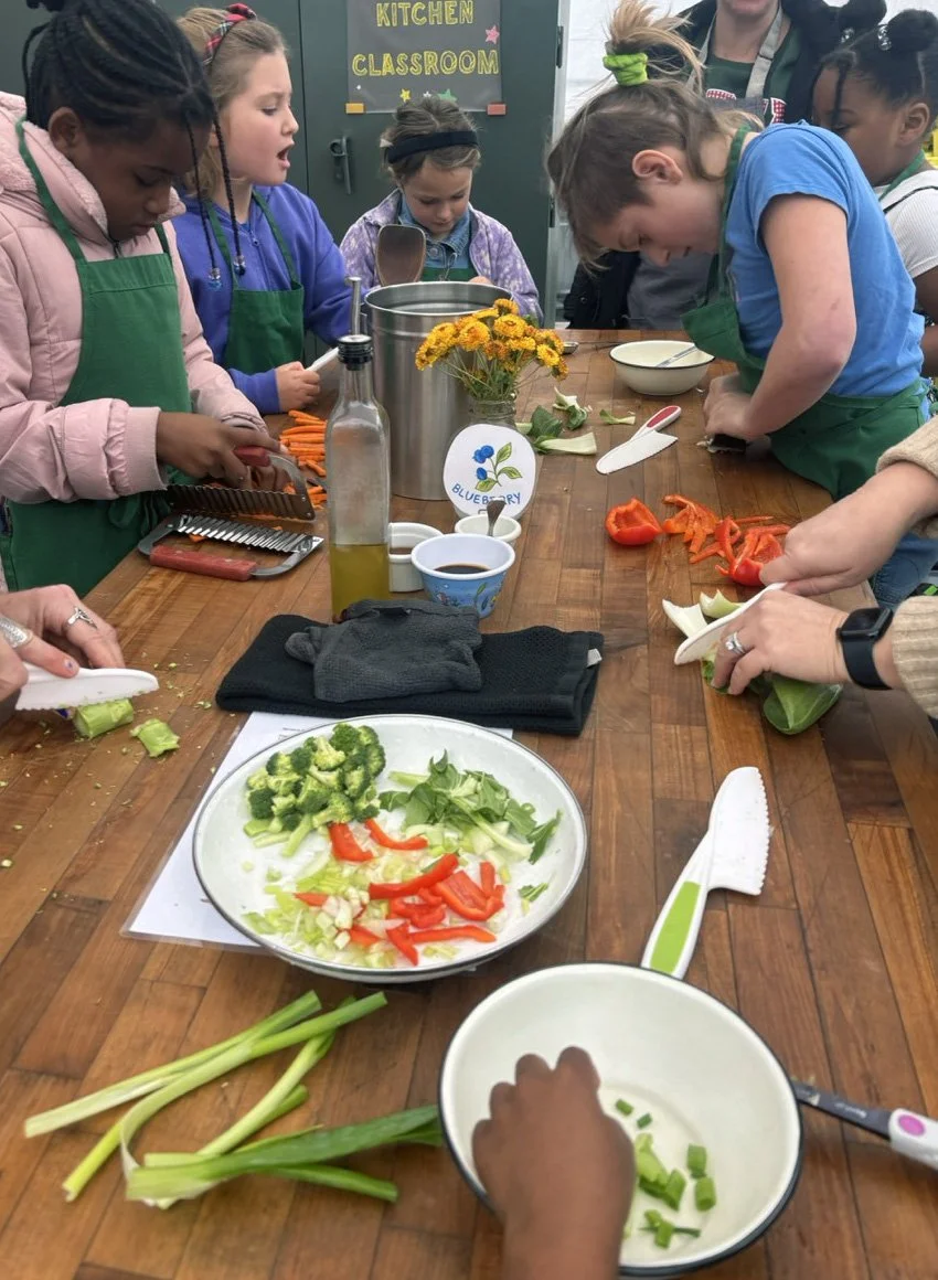 In the kitchen classroom we made lo mein with bok choy (a traditional Chinese vegetable named in the book we read) and lots of other delicious local vegetables. We learned that “lo” means to stir or toss and “mein” means noodles in Cantonese. Lo mein is a dish where the cooked noodles are tossed in a sauce as opposed to chow mein, where the noodles are fried. The second and third grade chefs enjoyed enjoyed practicing their chopstick skills once the table was set!