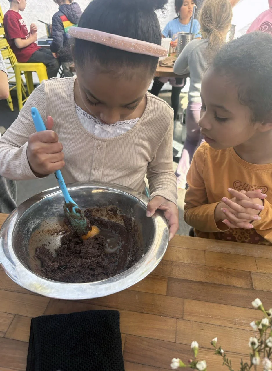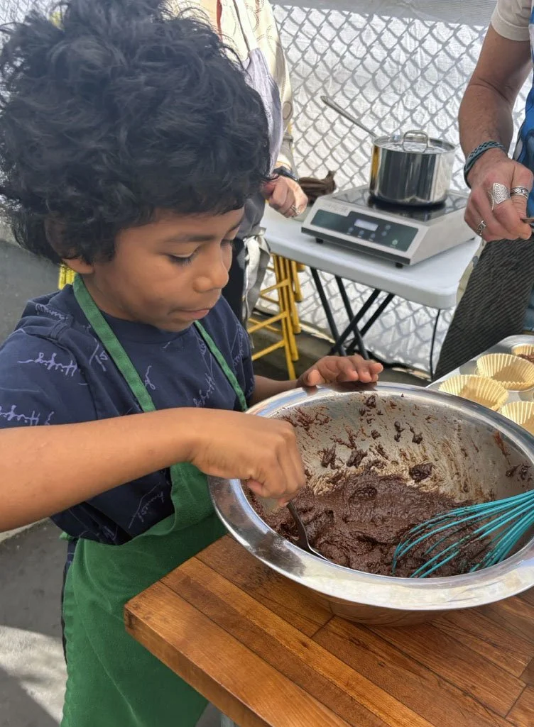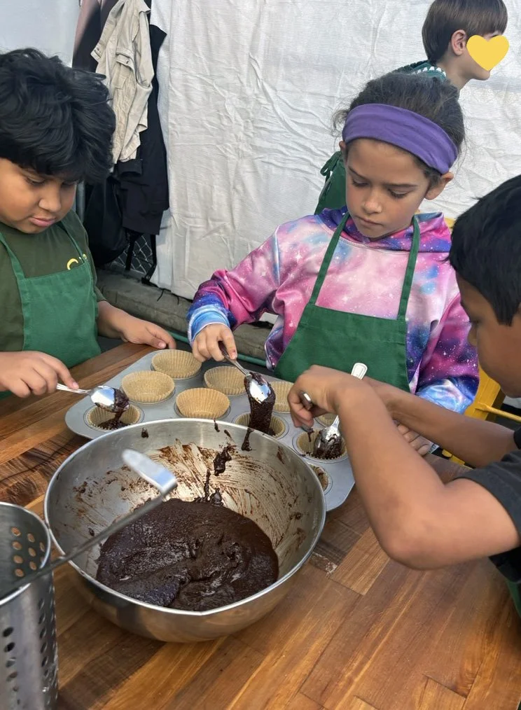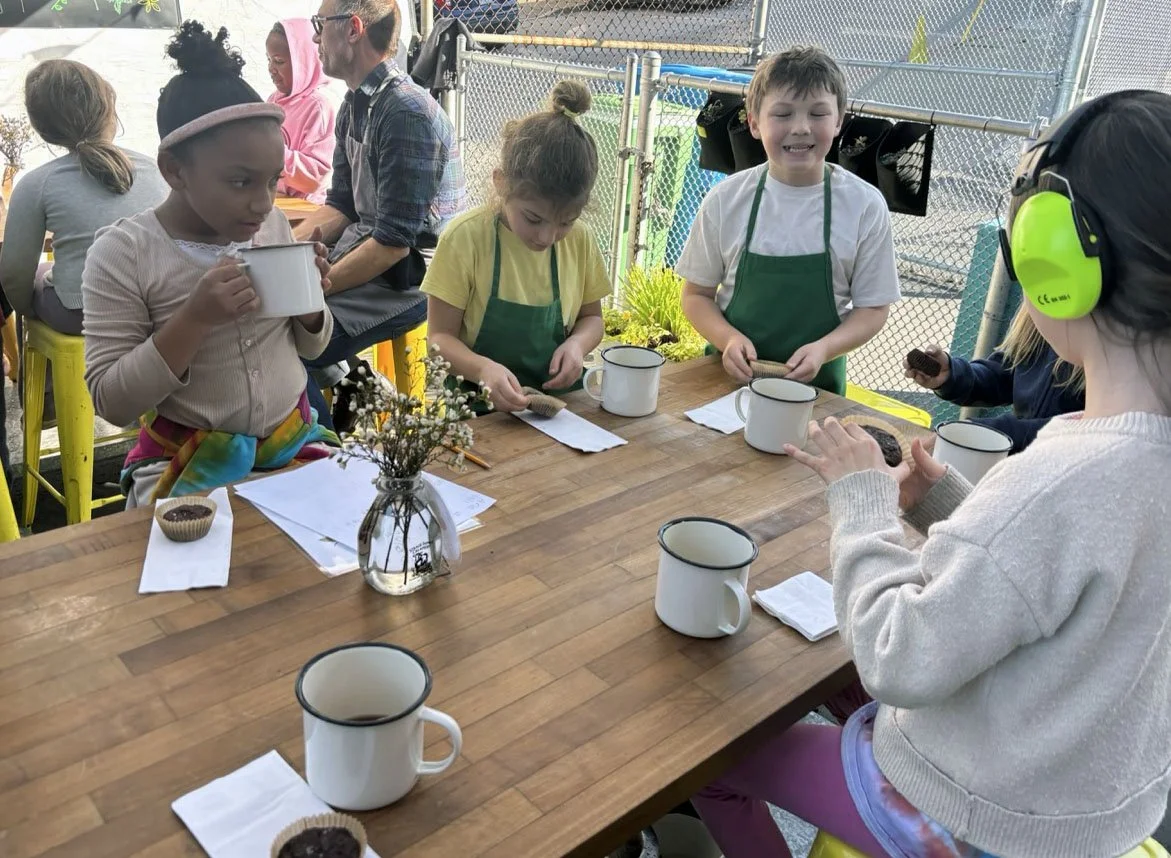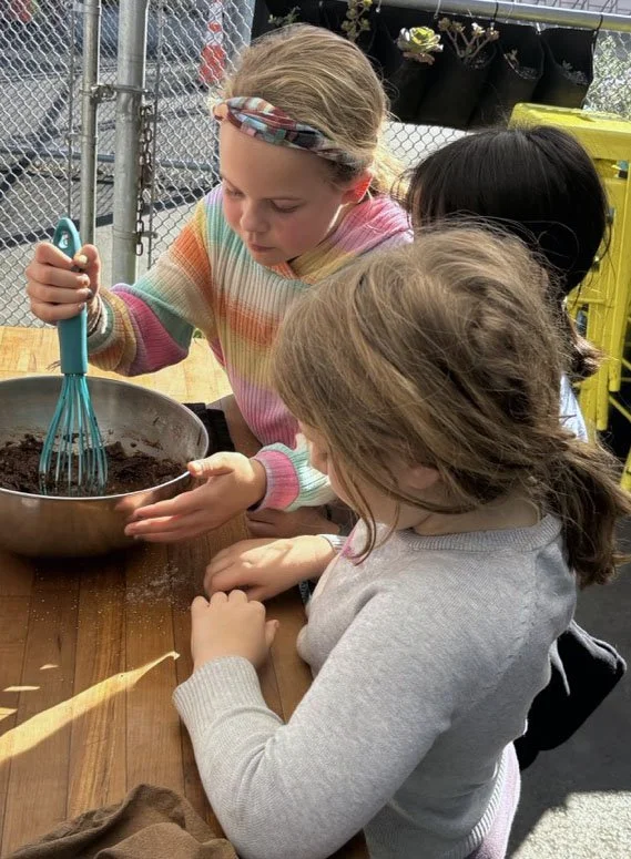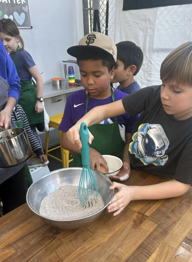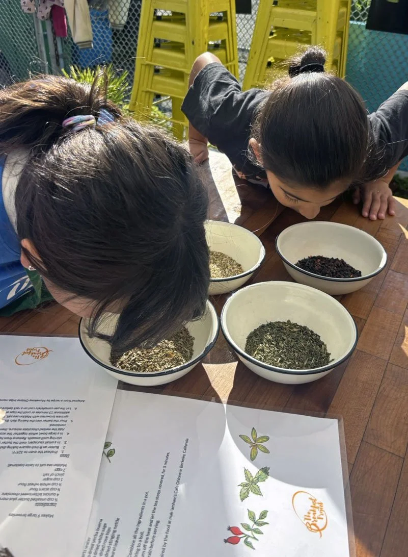 In the kitchen classroom, we made acorn brownies featuring acorn flour gathered and processed on Chumash land and a tea highlighing native plants. Weeks ago, the second and third graders learned that the Spanish named the territory that is now San Francisco “Yerba Buena” after the fragrant wild mint they found growing everywhere. We finally got to harvest our own kitchen classroom garden yerba buena for our tea!