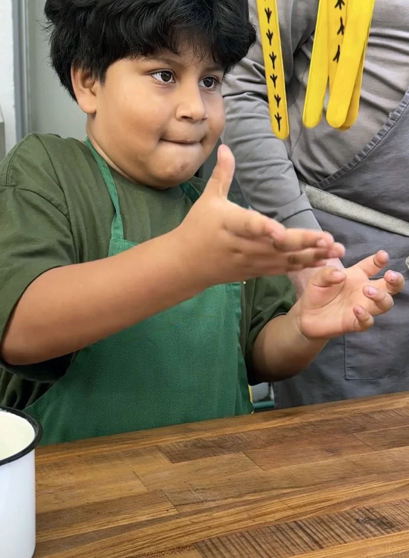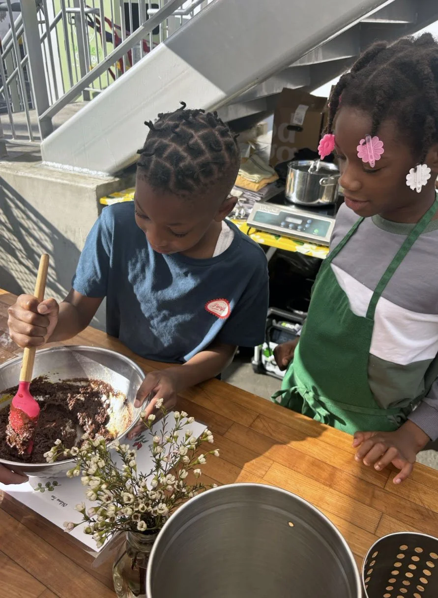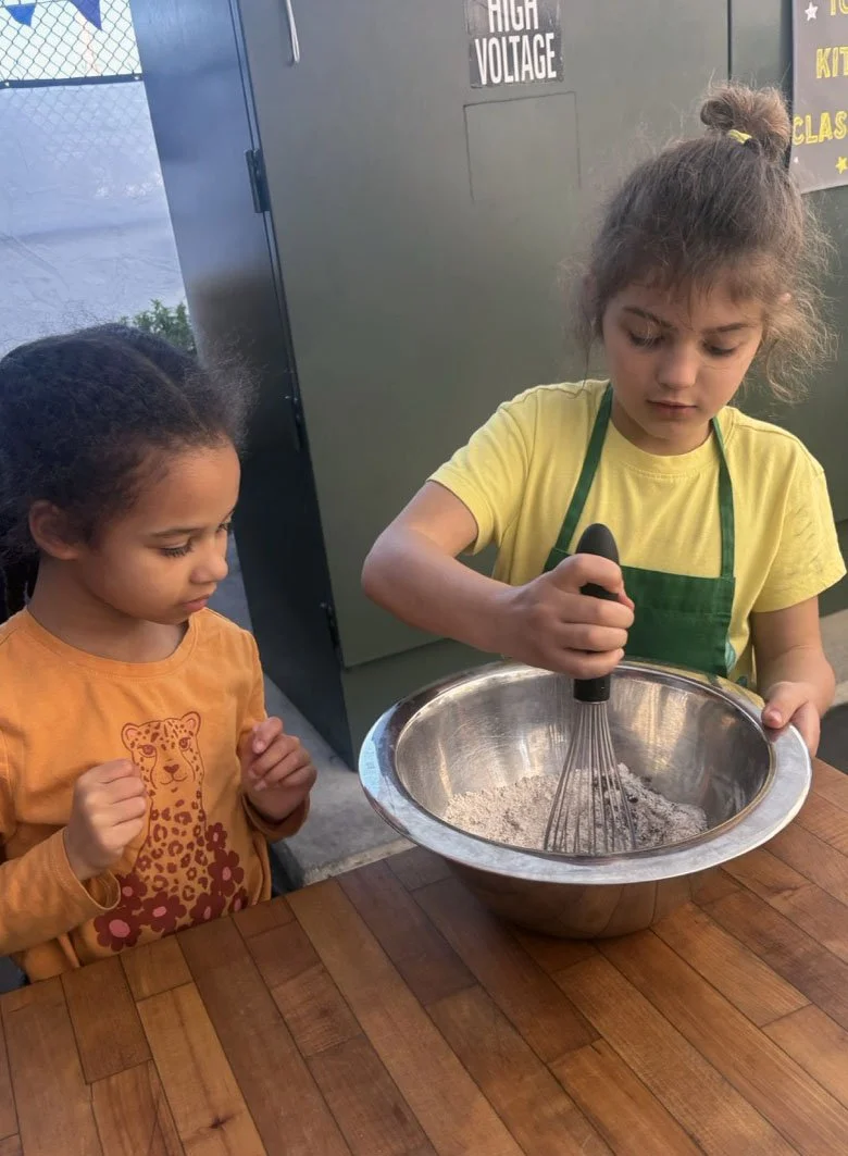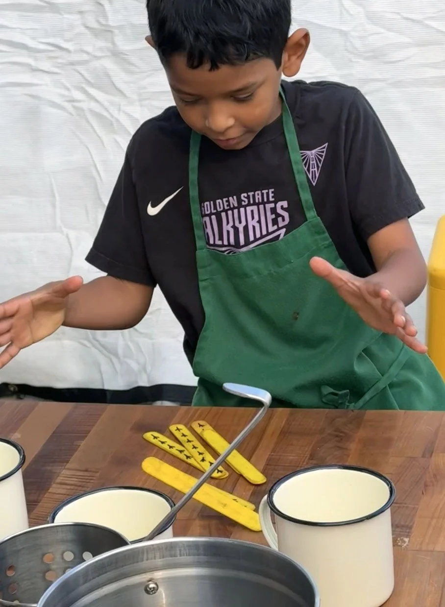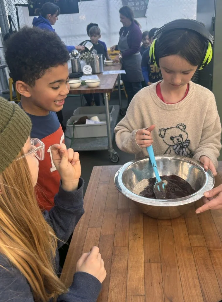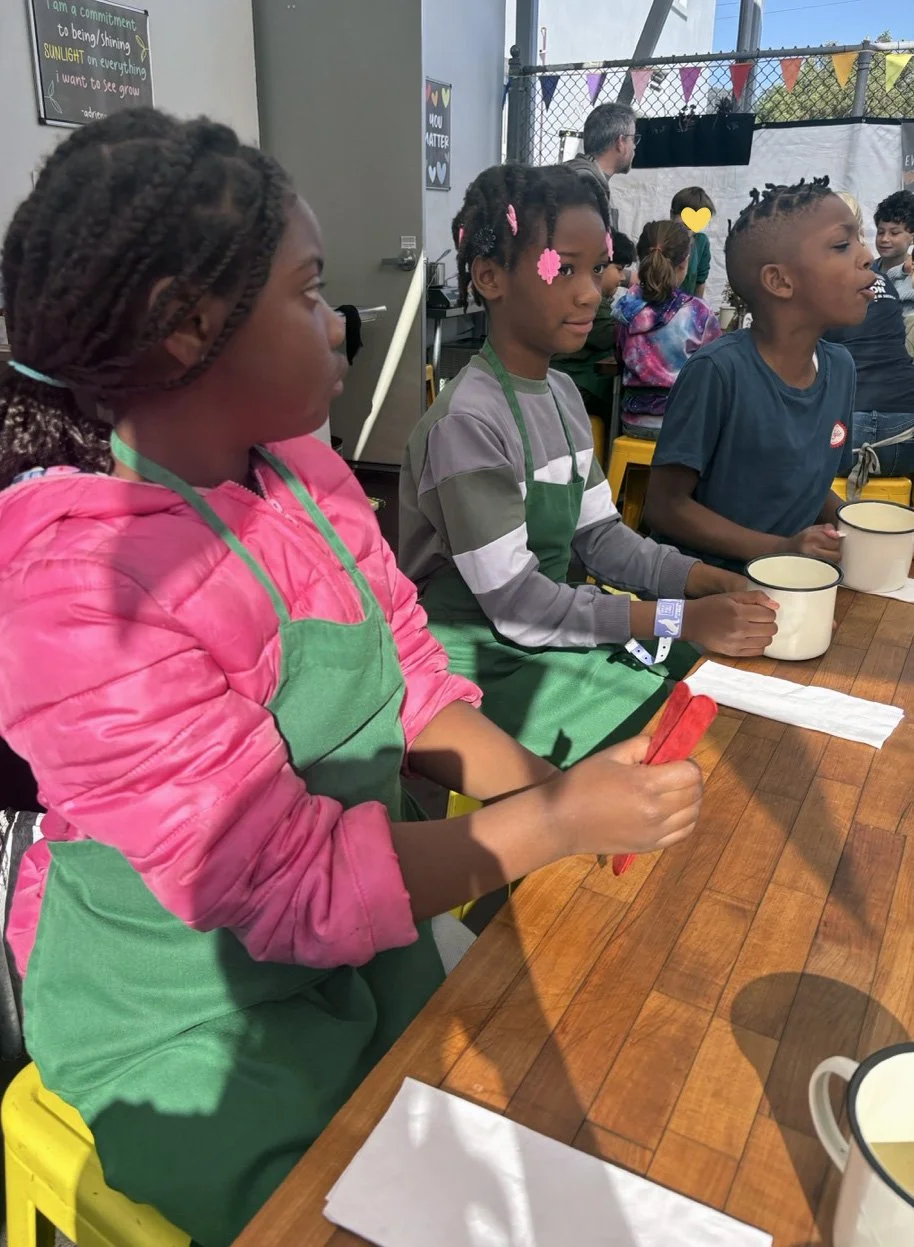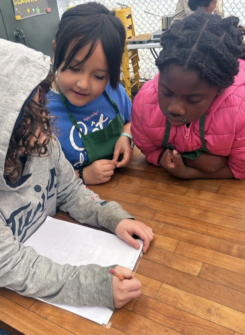 In the kitchen classroom, we made acorn brownies featuring acorn flour gathered and processed on Chumash land and a tea highlighing native plants. Weeks ago, the second and third graders learned that the Spanish named the territory that is now San Francisco “Yerba Buena” after the fragrant wild mint they found growing everywhere. We finally got to harvest our own kitchen classroom garden yerba buena for our tea!