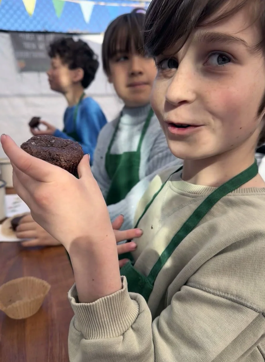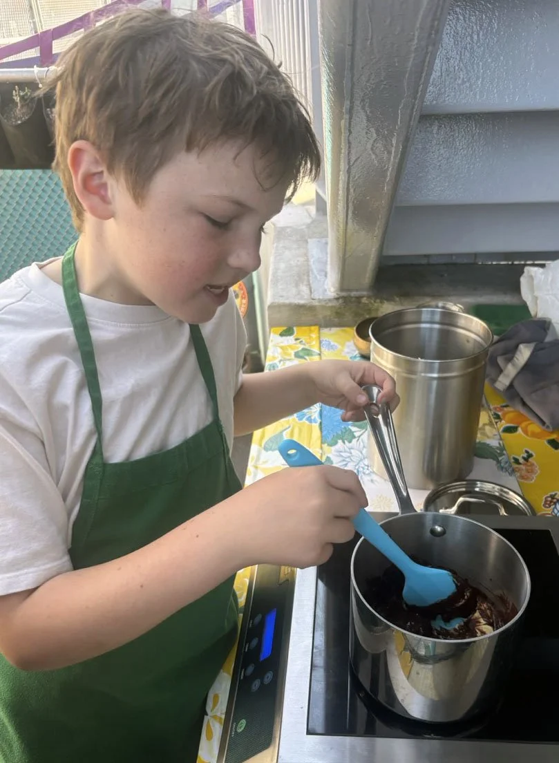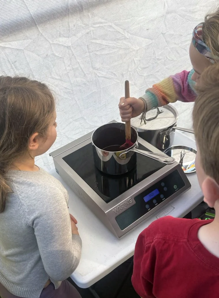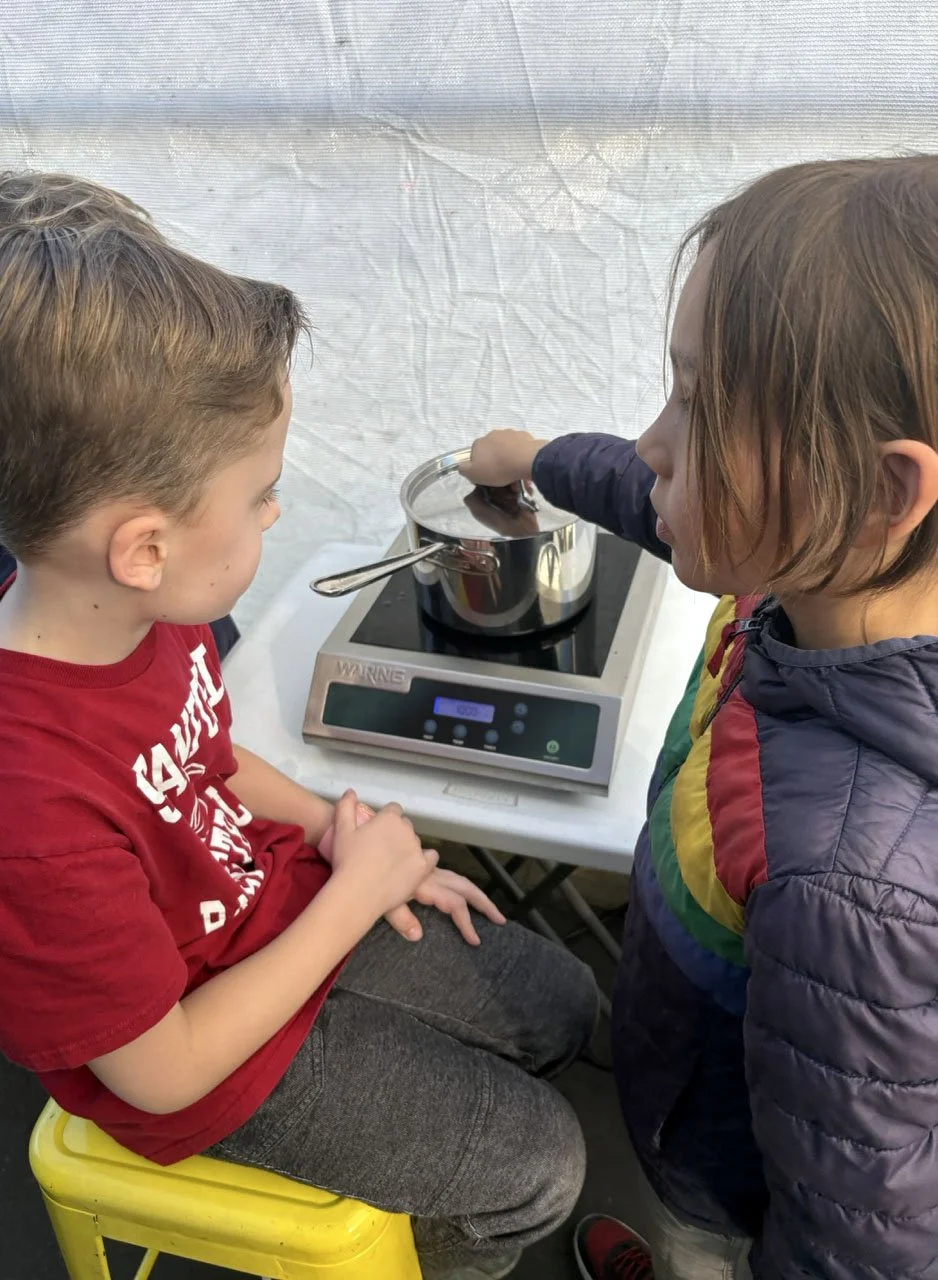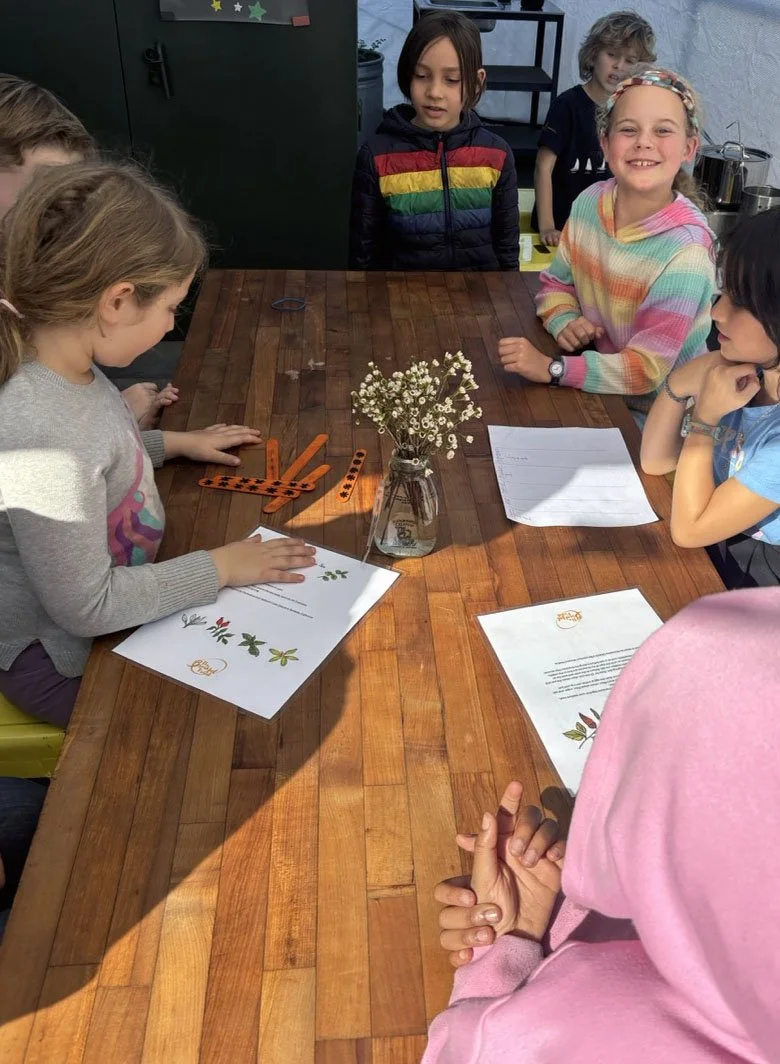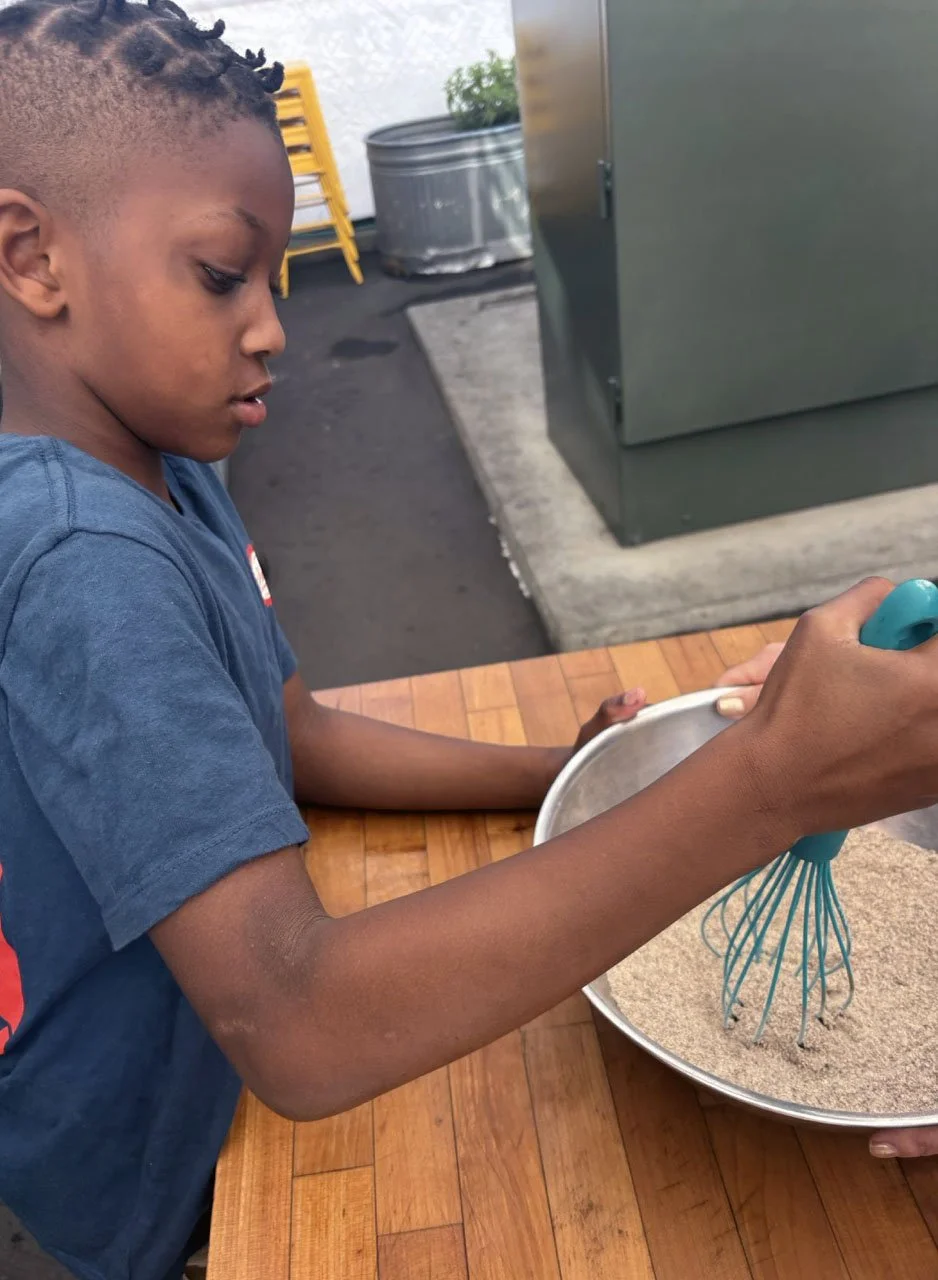 In the kitchen classroom, we made acorn brownies featuring acorn flour gathered and processed on Chumash land and a tea highlighing native plants. Weeks ago, the second and third graders learned that the Spanish named the territory that is now San Francisco “Yerba Buena” after the fragrant wild mint they found growing everywhere. We finally got to harvest our own kitchen classroom garden yerba buena for our tea!