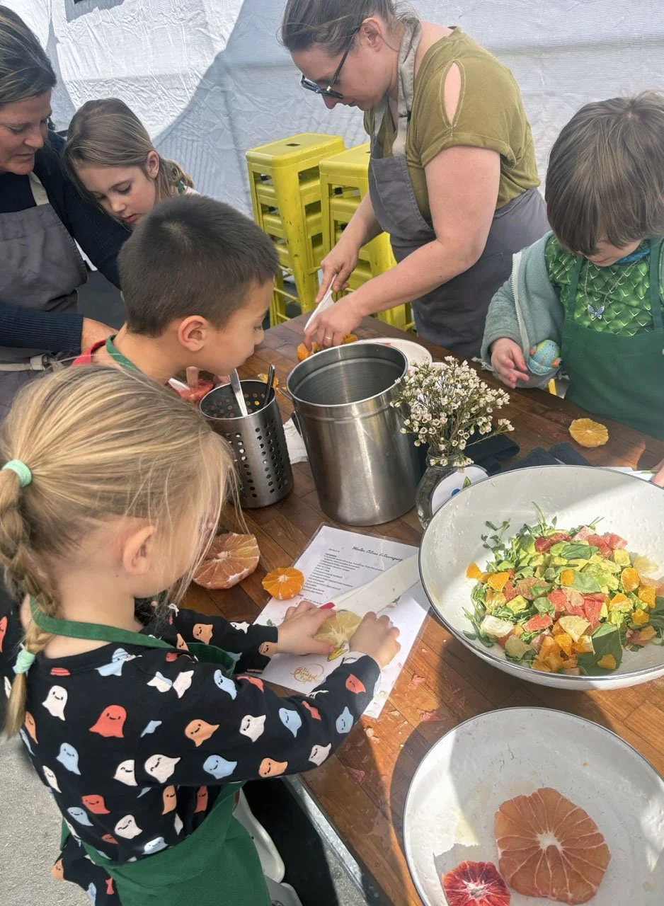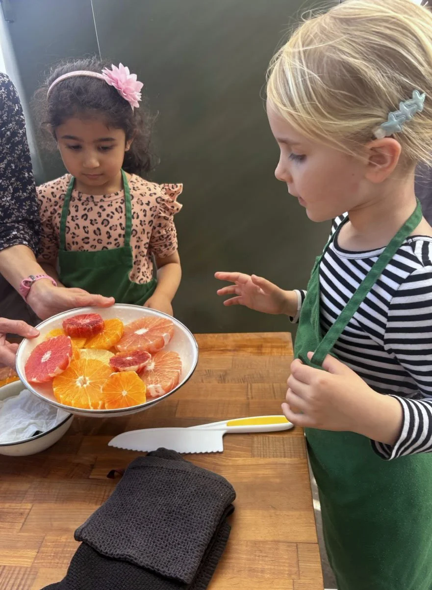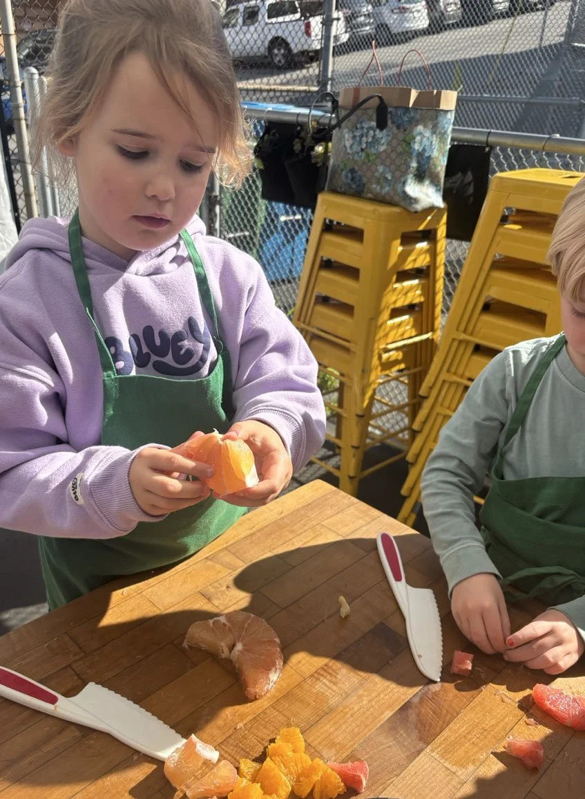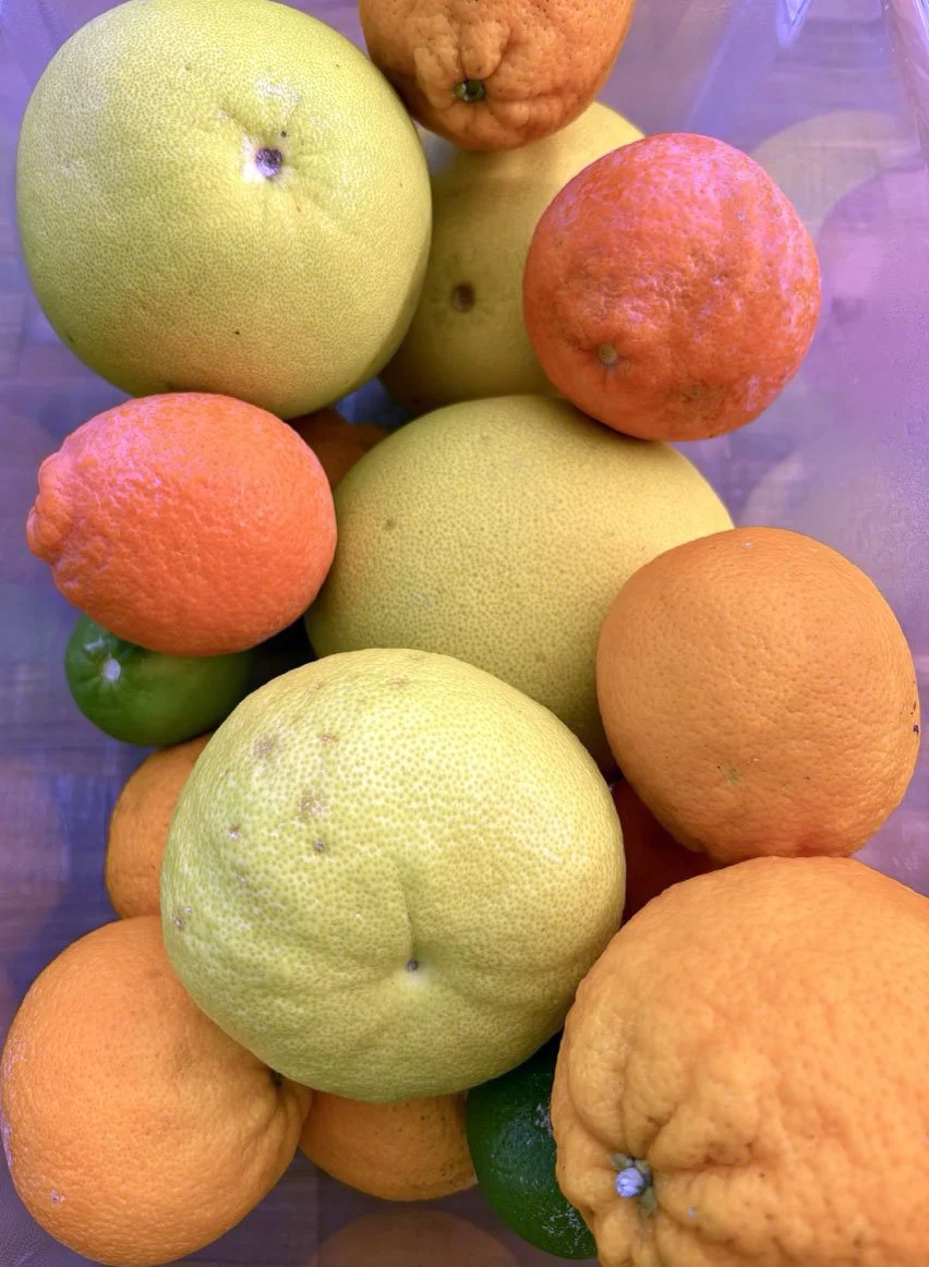 In February, we are celebrating all things citrus! In the classroom we introduced the seven types of citrus in our recipe: shiranui or sumo mandarins (originally developed in Japan), Moro blood oranges (originally developed in Italy), Chandler pomelo (originally developed in California at UC Riverside), oro blanco grapefruit (also from UC Riverside), Rio red grapefruit (originally developed in Texas), Minneola tangelo (a cross between tangerine and pomelo originally developed in Florida), and lime.