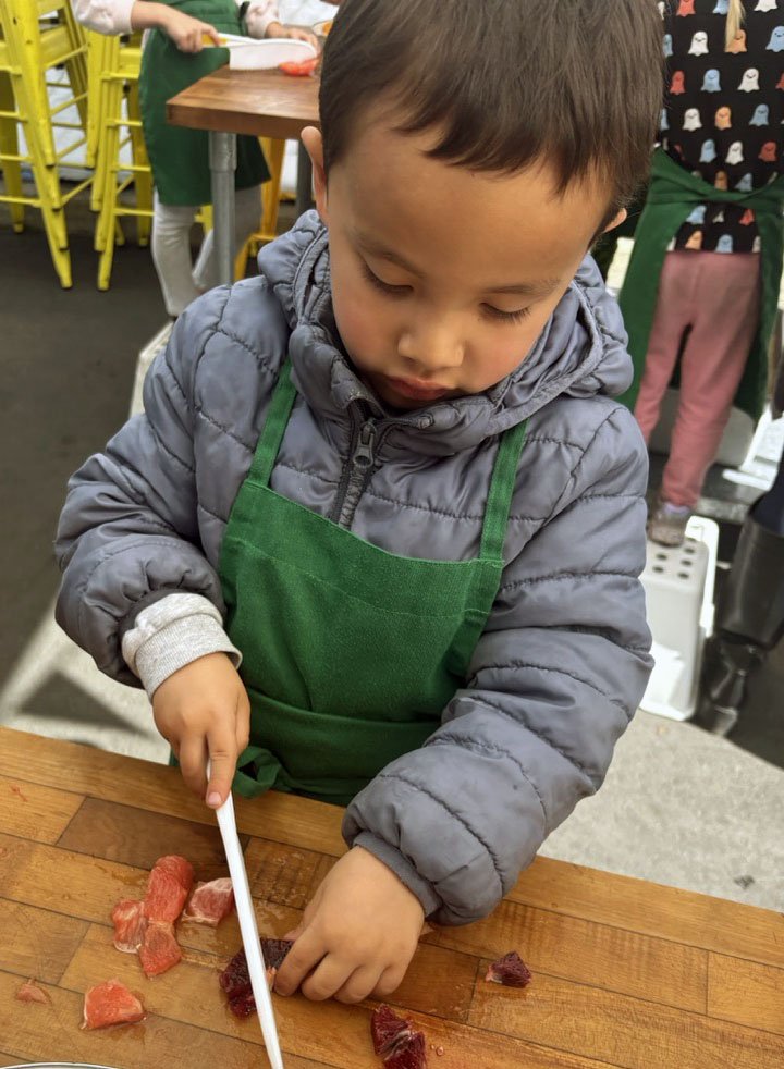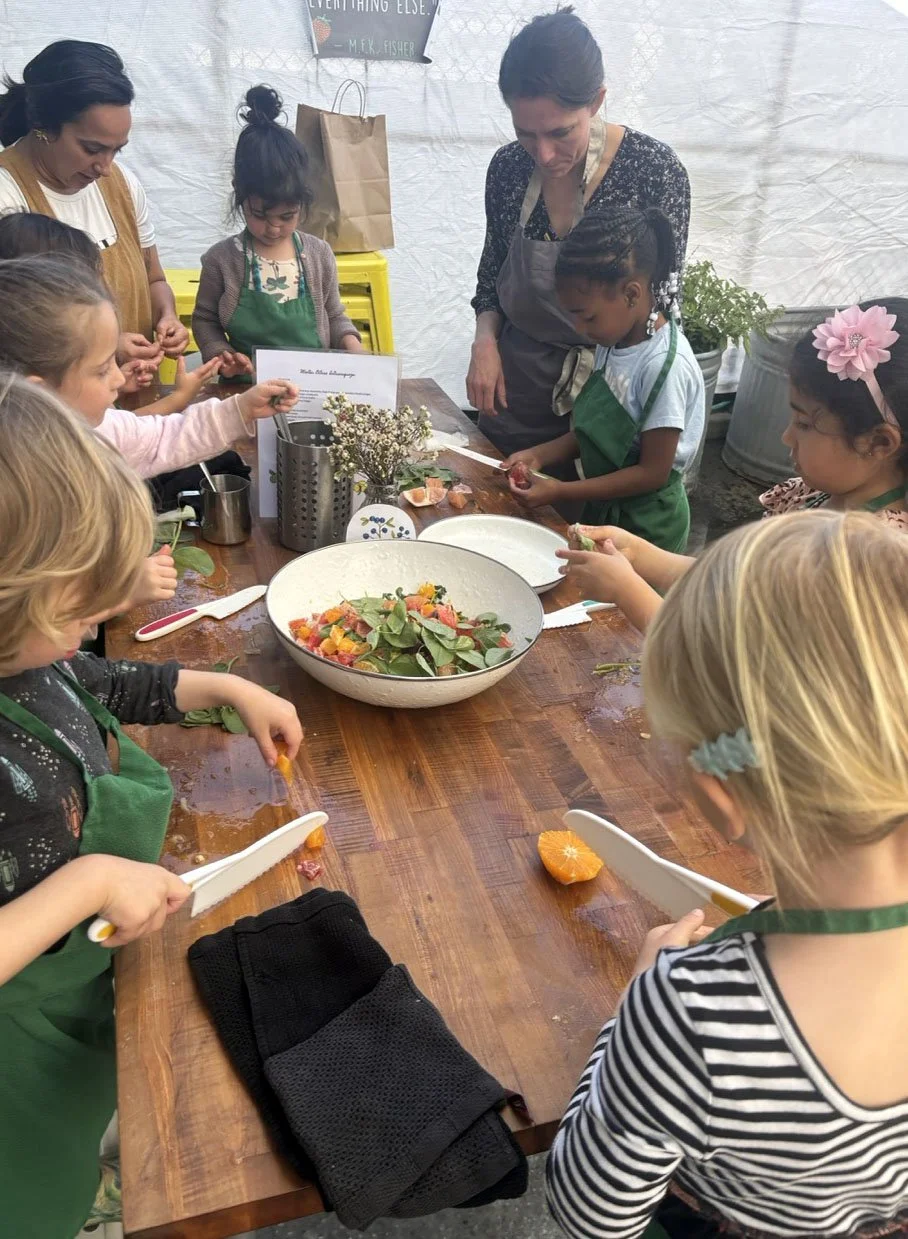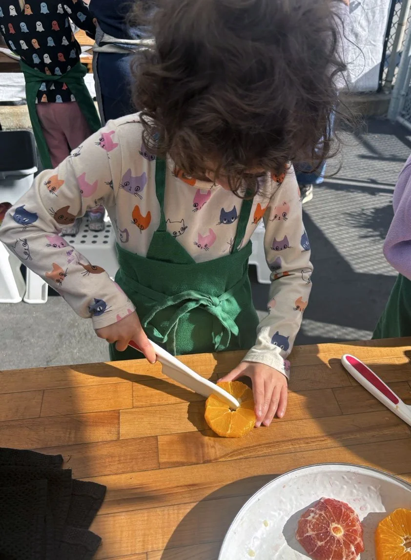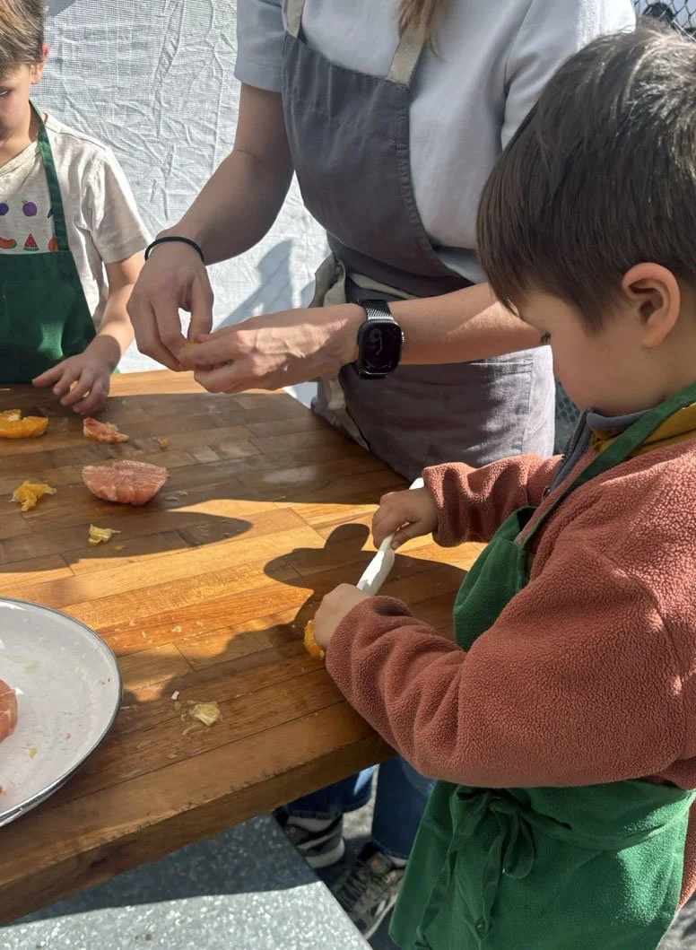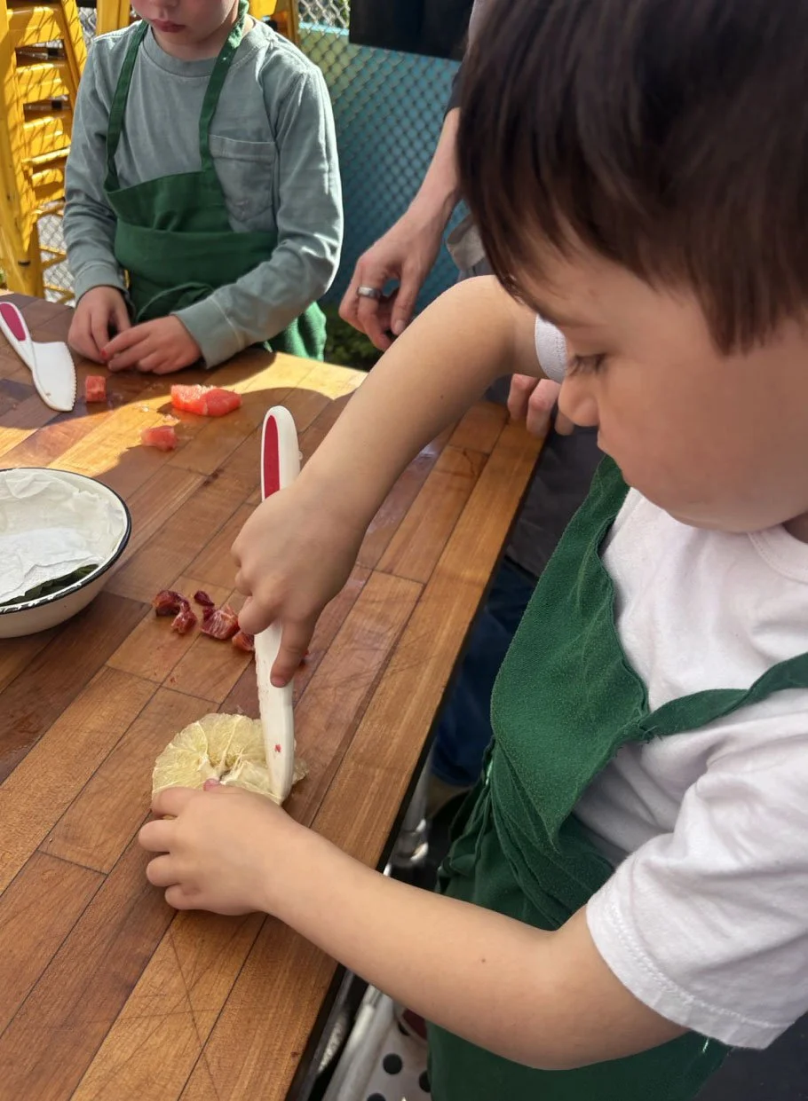 In February, we are celebrating all things citrus! In the classroom we introduced the seven types of citrus in our recipe: shiranui or sumo mandarins (originally developed in Japan), Moro blood oranges (originally developed in Italy), Chandler pomelo (originally developed in California at UC Riverside), oro blanco grapefruit (also from UC Riverside), Rio red grapefruit (originally developed in Texas), Minneola tangelo (a cross between tangerine and pomelo originally developed in Florida), and lime.