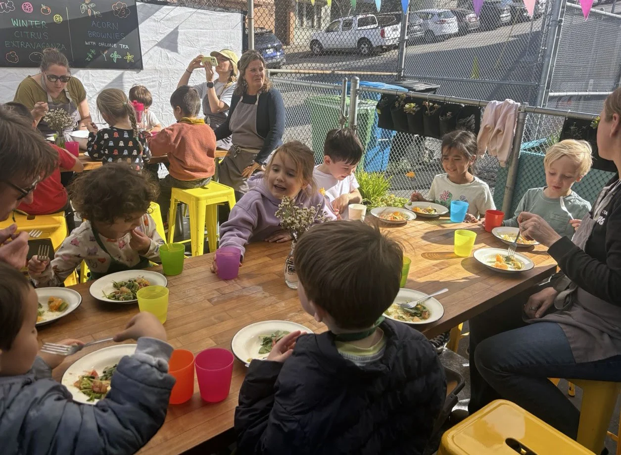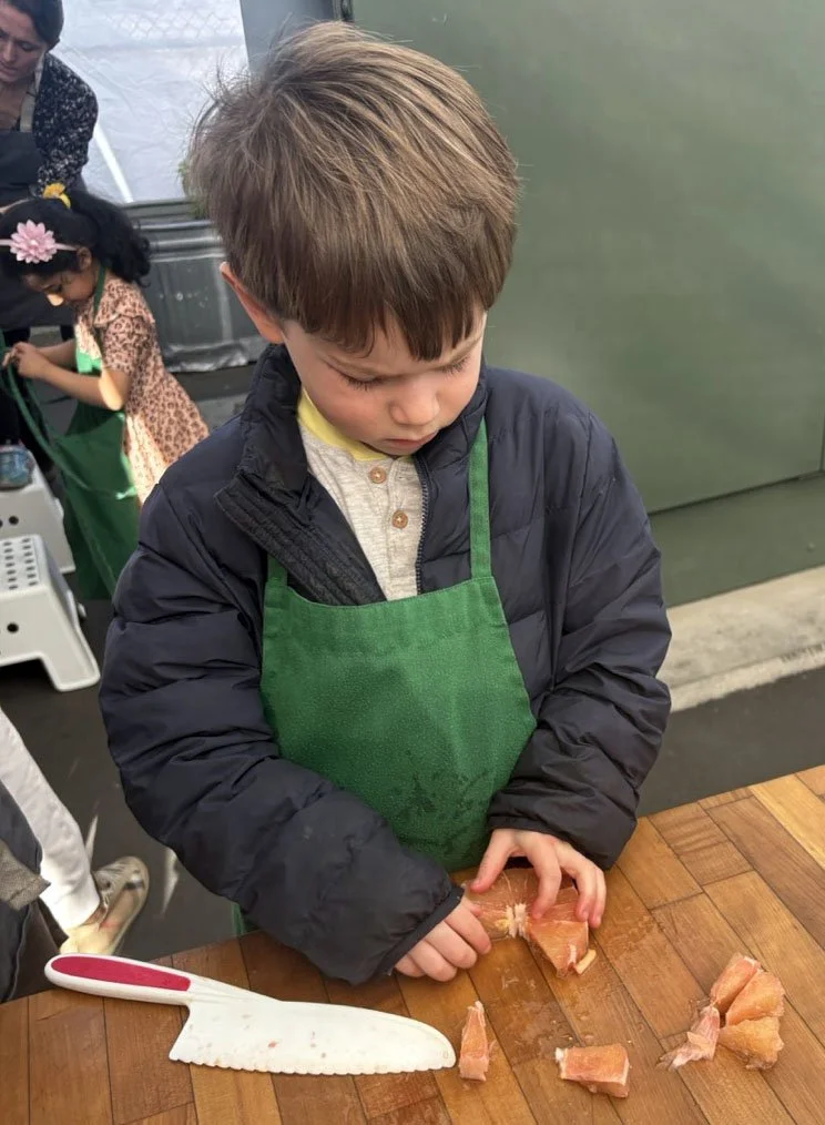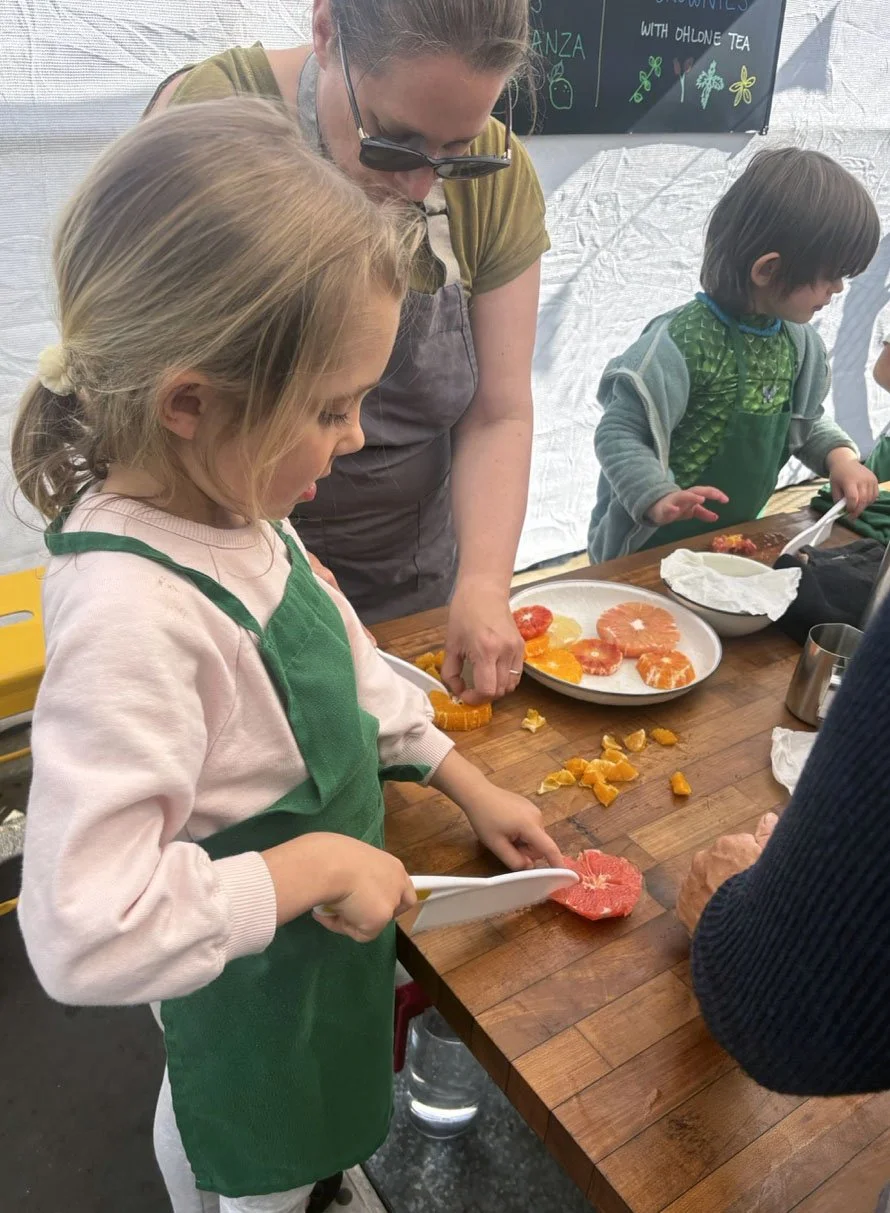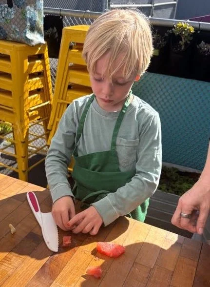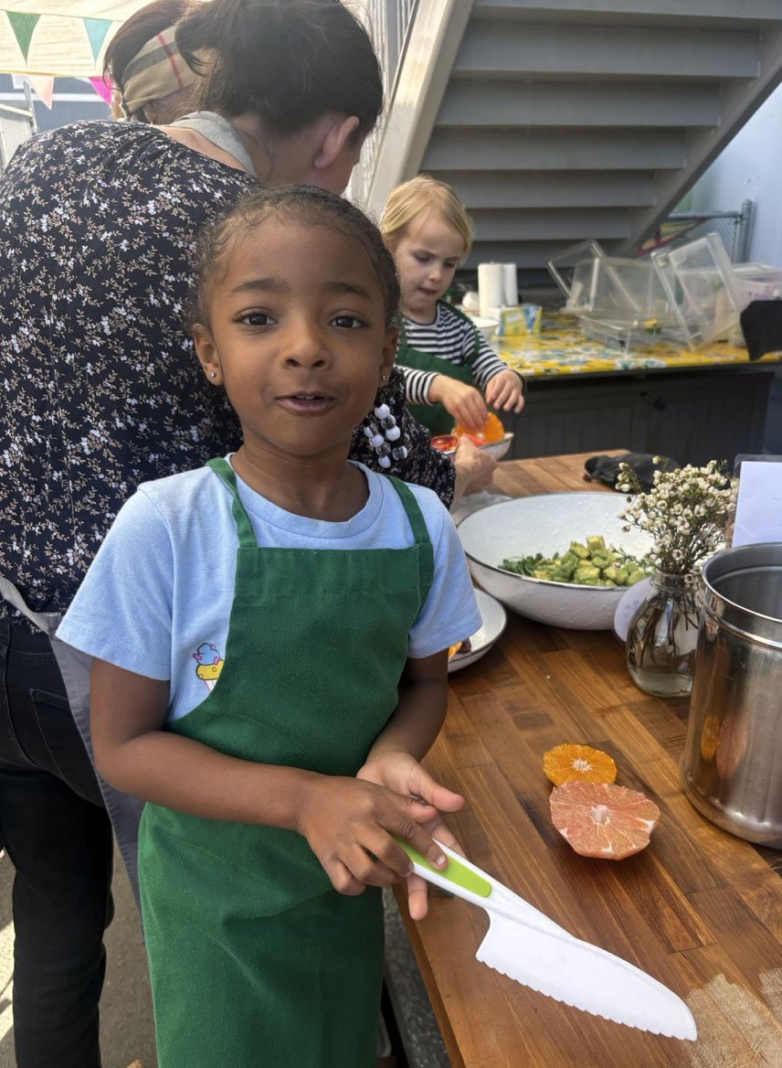 In February, we are celebrating all things citrus! In the classroom we introduced the seven types of citrus in our recipe: shiranui or sumo mandarins (originally developed in Japan), Moro blood oranges (originally developed in Italy), Chandler pomelo (originally developed in California at UC Riverside), oro blanco grapefruit (also from UC Riverside), Rio red grapefruit (originally developed in Texas), Minneola tangelo (a cross between tangerine and pomelo originally developed in Florida), and lime.