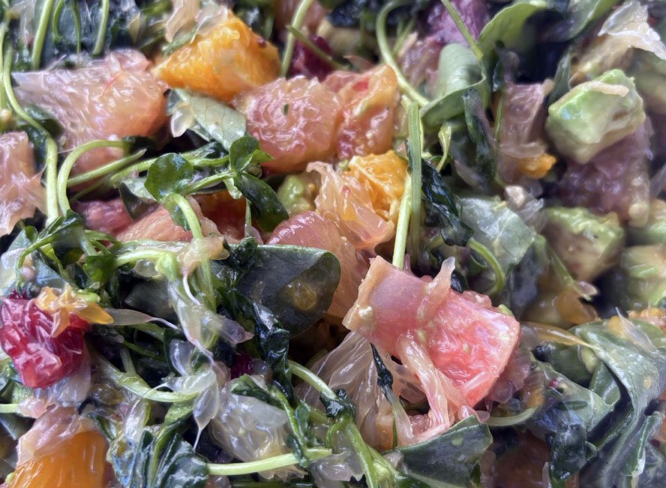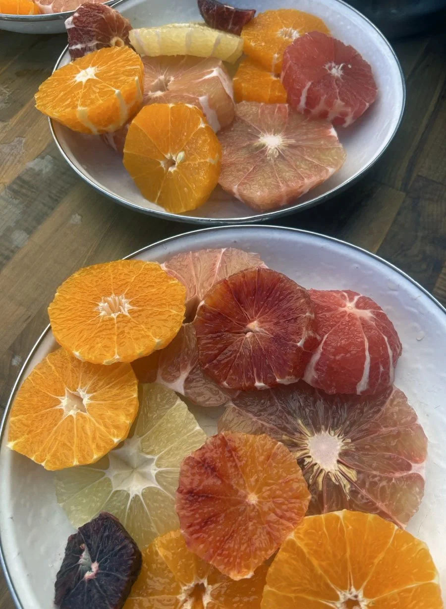 In the kitchen we had a winter citrus extravaganza, making a salad with loads of multi-colored citrus as well as the first signs of spring, fava greens and pea shoots.
