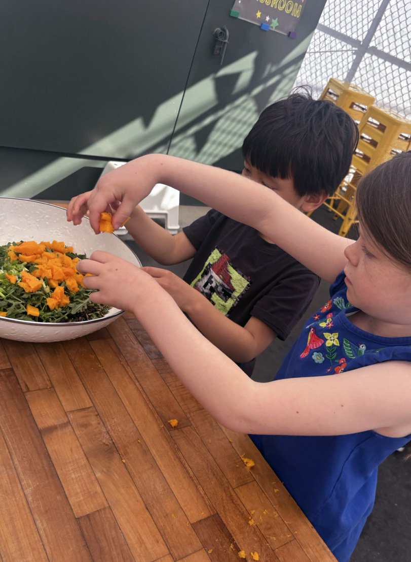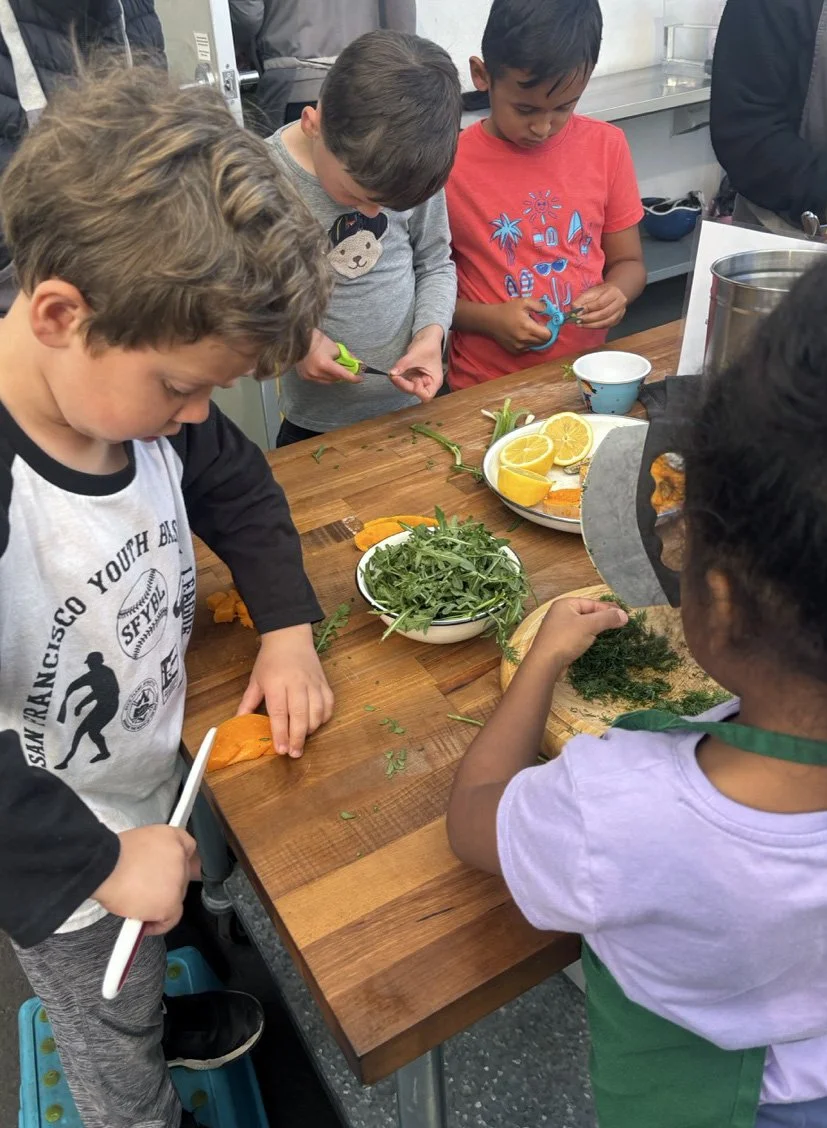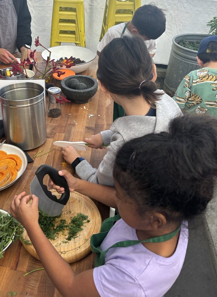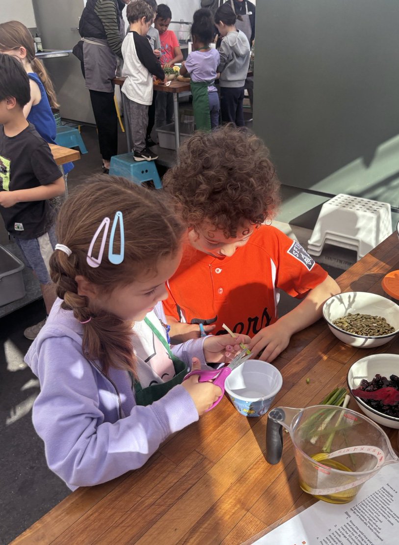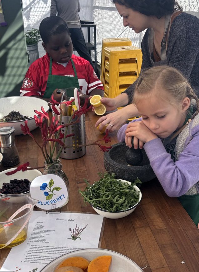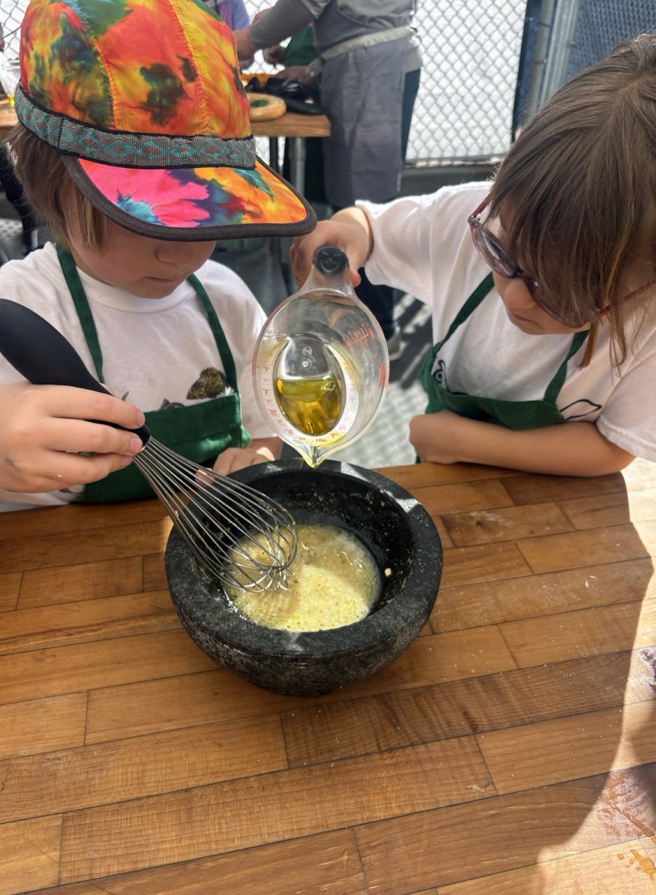 In the kitchen, the first grade chefs made a manoomin salad with several ingredients native to North America: wild rice, cranberries, squash, and pumpkin seeds. We learned to make a salad dressing by slowly drizzling in oil to form an emulsion with lemon juice. Wild rice is nutrient dense and high in protein and fiber. We are grateful we all had a chance to try this delicious ingredient produced by the Red Lake Band of Chippewa Indians via Red Lake Nation Foods and Rainbow Grocery in the Mission District.