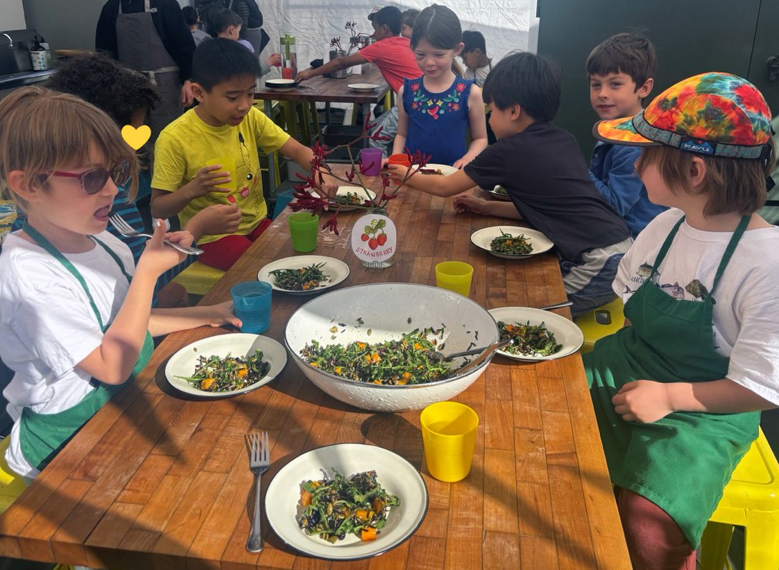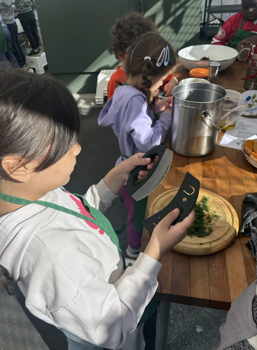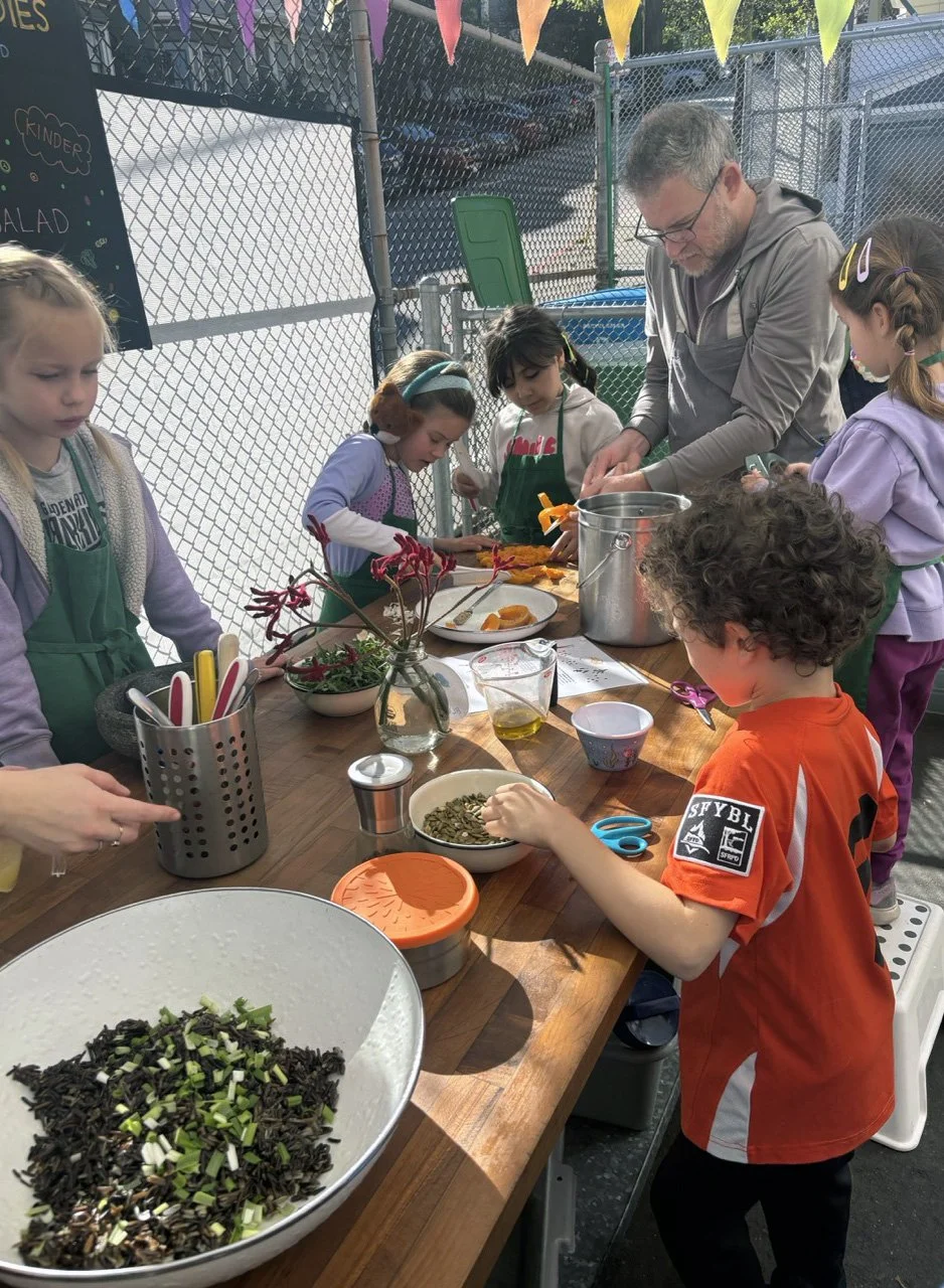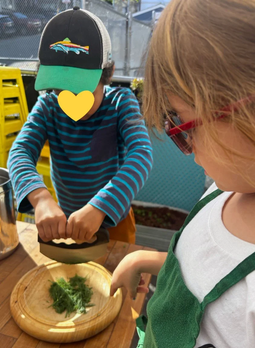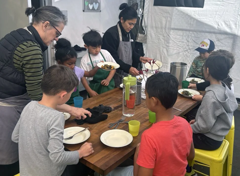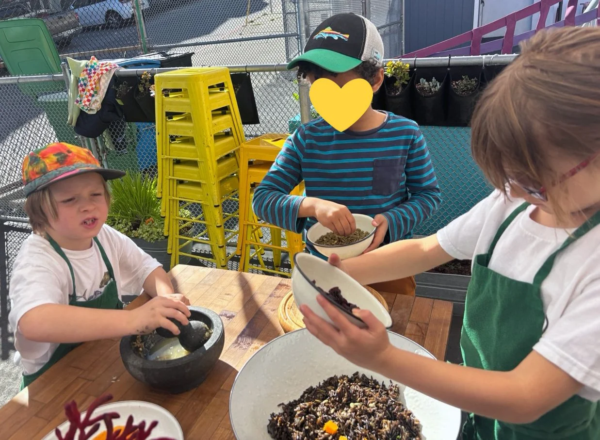 In the kitchen, the first grade chefs made a manoomin salad with several ingredients native to North America: wild rice, cranberries, squash, and pumpkin seeds. We learned to make a salad dressing by slowly drizzling in oil to form an emulsion with lemon juice. Wild rice is nutrient dense and high in protein and fiber. We are grateful we all had a chance to try this delicious ingredient produced by the Red Lake Band of Chippewa Indians via Red Lake Nation Foods and Rainbow Grocery in the Mission District.
