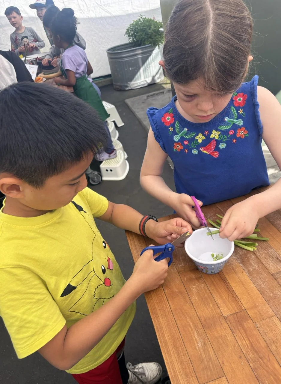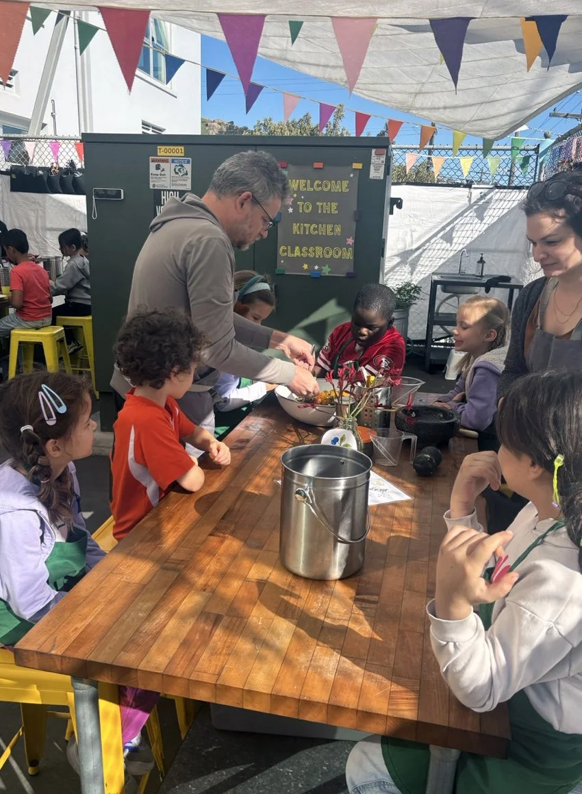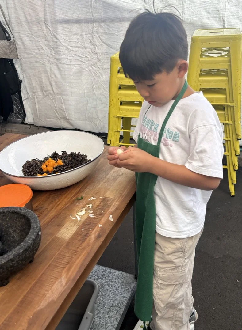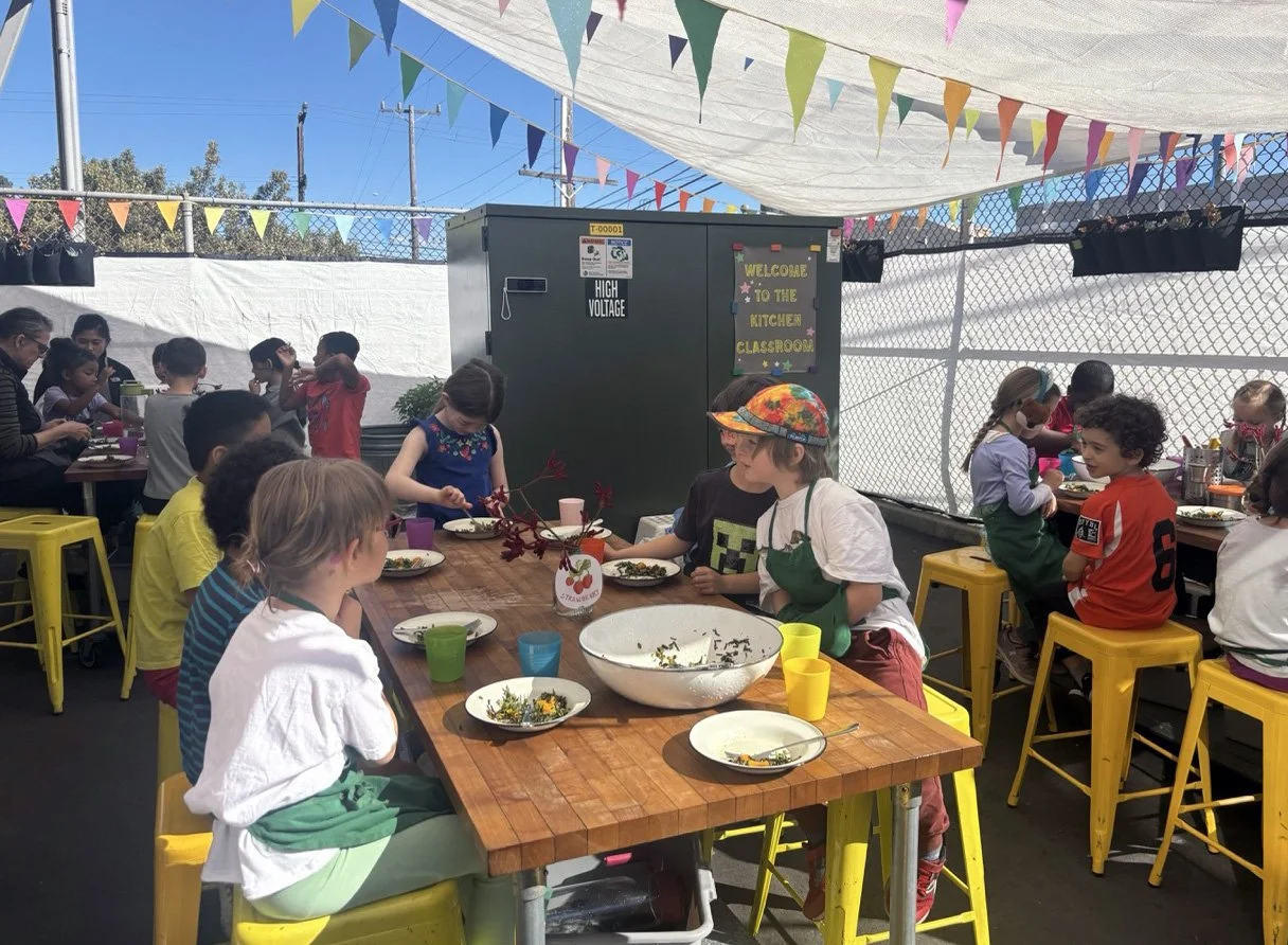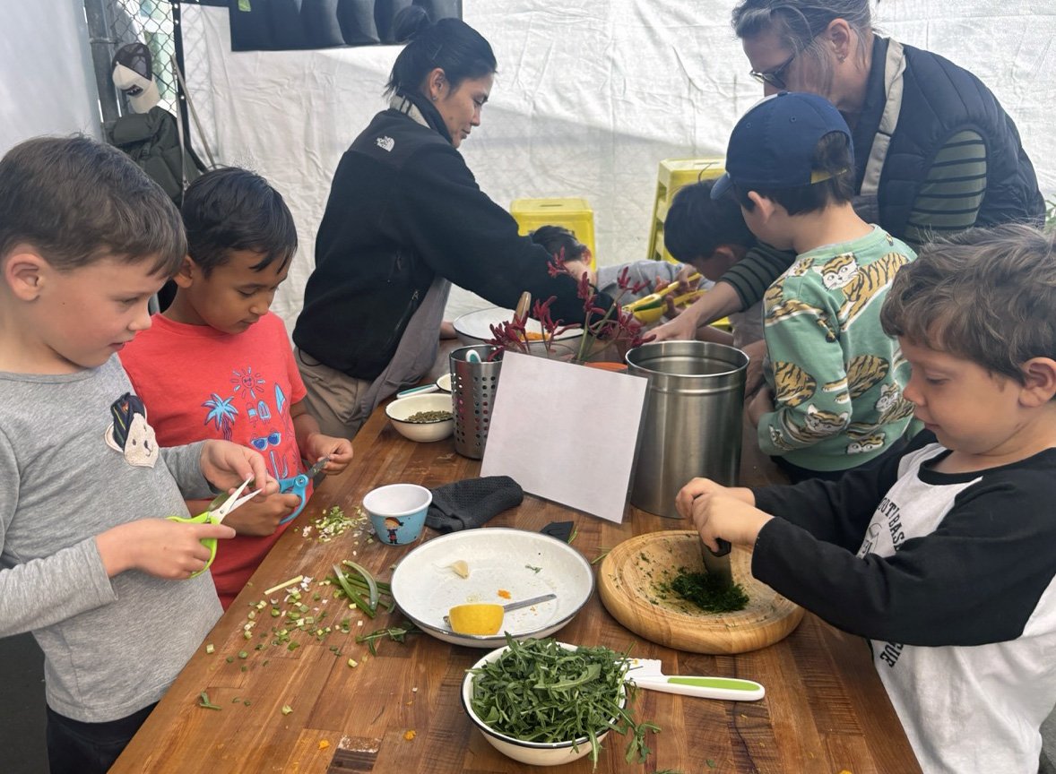 In the kitchen, the first grade chefs made a manoomin salad with several ingredients native to North America: wild rice, cranberries, squash, and pumpkin seeds. We learned to make a salad dressing by slowly drizzling in oil to form an emulsion with lemon juice. Wild rice is nutrient dense and high in protein and fiber. We are grateful we all had a chance to try this delicious ingredient produced by the Red Lake Band of Chippewa Indians via Red Lake Nation Foods and Rainbow Grocery in the Mission District.