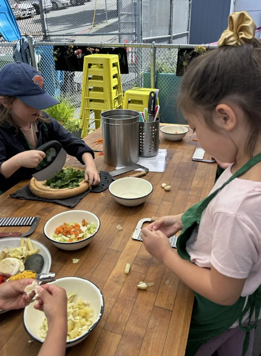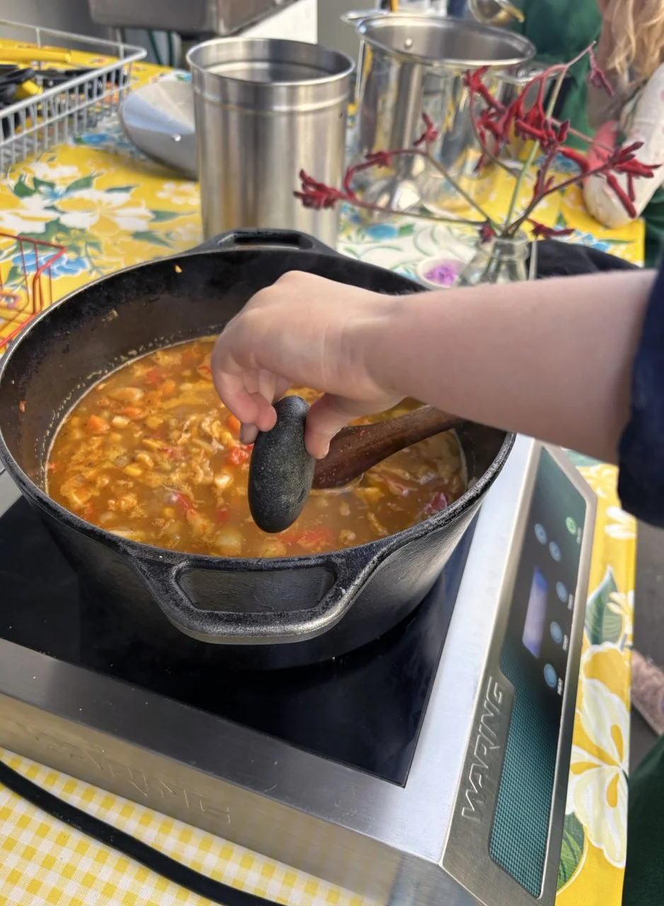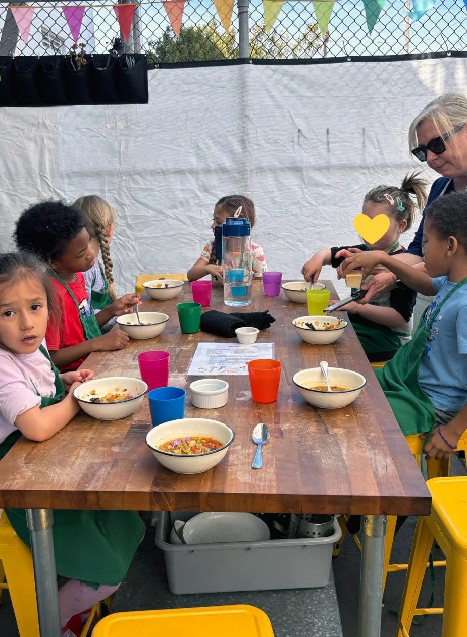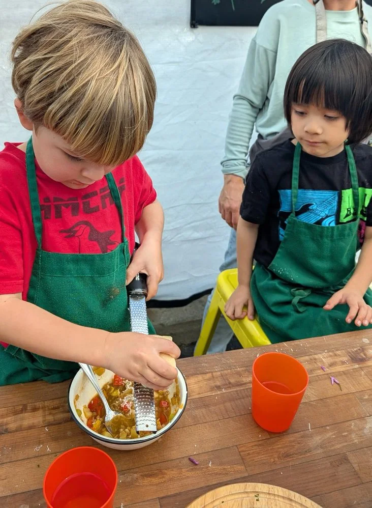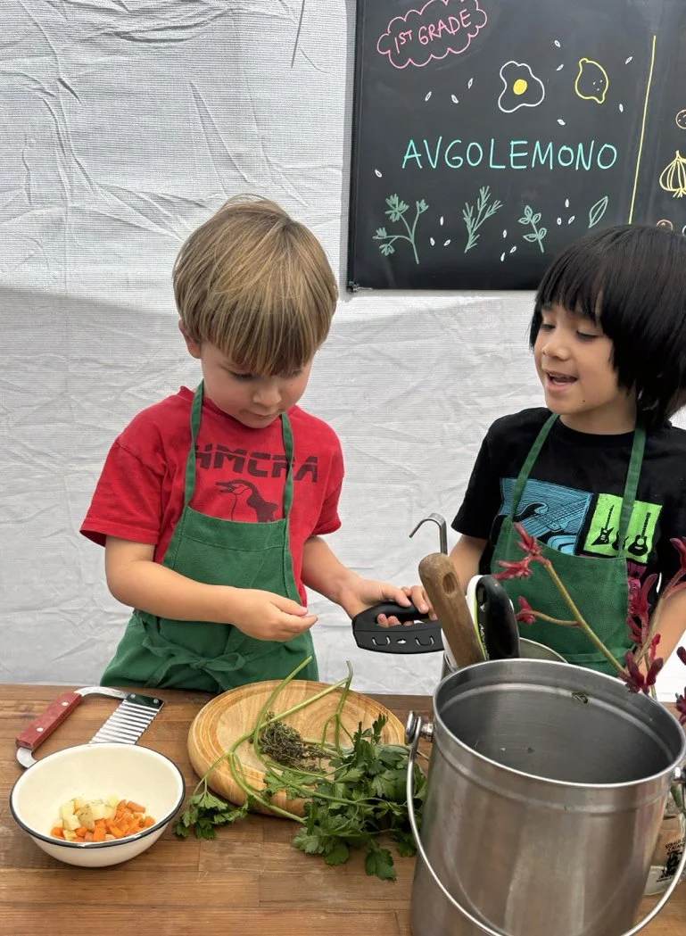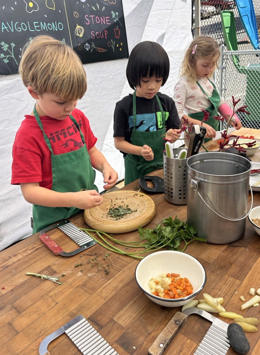 In the kitchen we made our own version of stone soup with many of the same ingredients highlighted in Brown’s book. The kindergarten chefs prepped so many fruits and vegetables, including bell peppers, potatoes, cabbage, carrots, and fresh herbs. Of course, we had to include a stone in each pot, and enjoyed each other’s company as we prepared and ate the meal together.