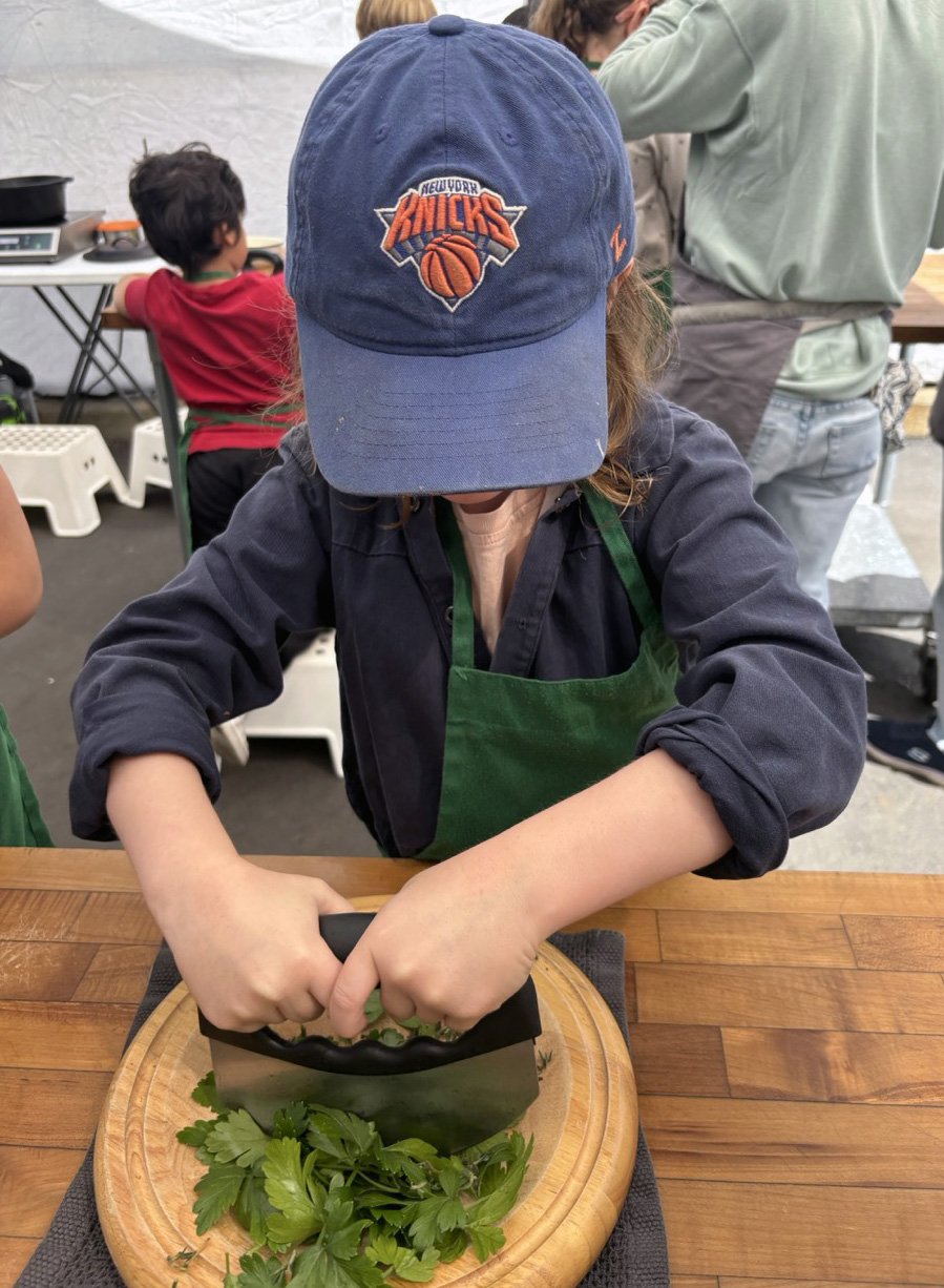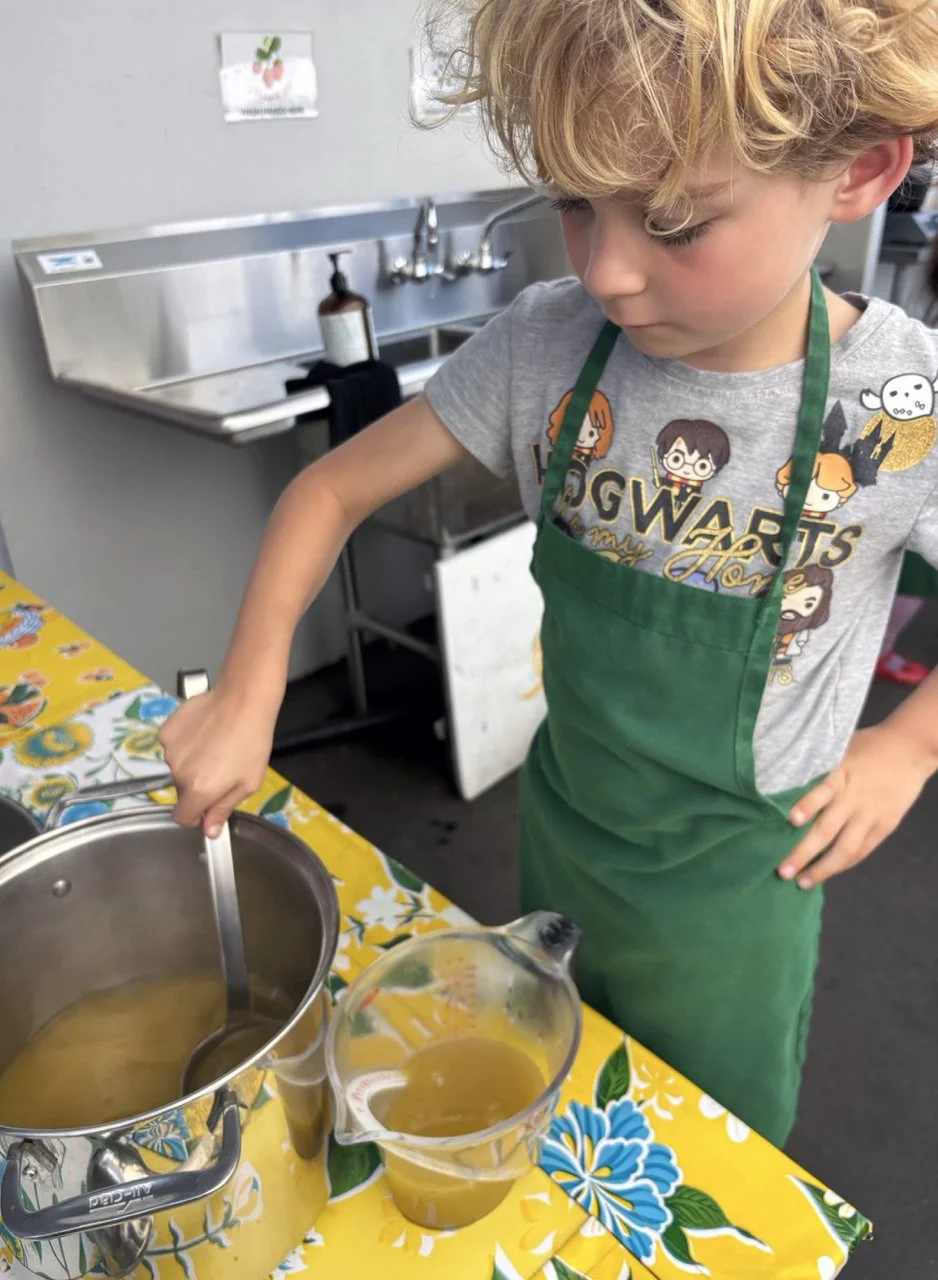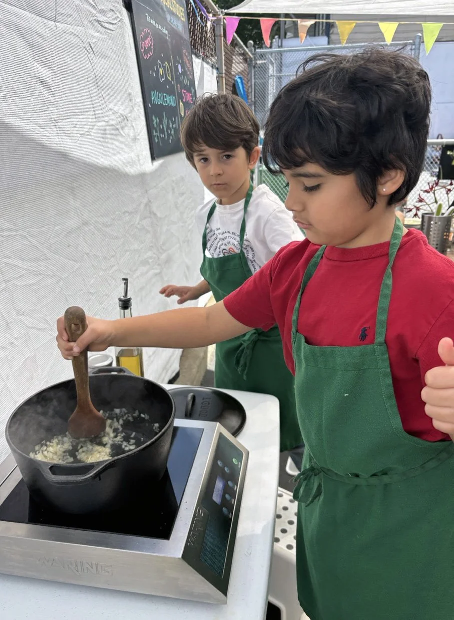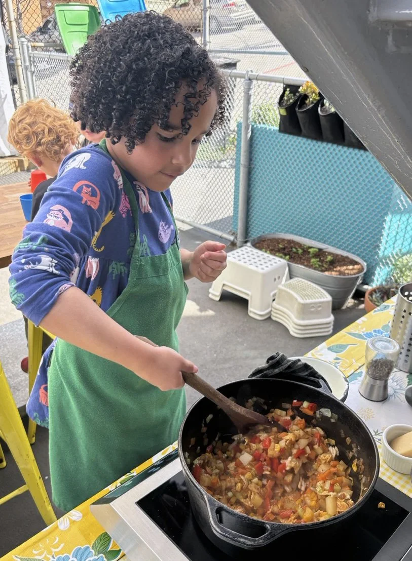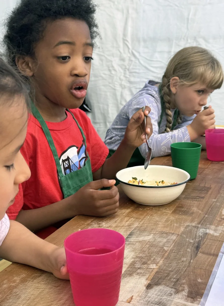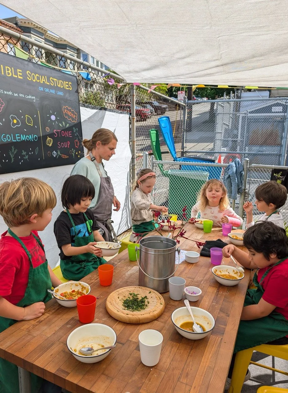 In the kitchen we made our own version of stone soup with many of the same ingredients highlighted in Brown’s book. The kindergarten chefs prepped so many fruits and vegetables, including bell peppers, potatoes, cabbage, carrots, and fresh herbs. Of course, we had to include a stone in each pot, and enjoyed each other’s company as we prepared and ate the meal together.