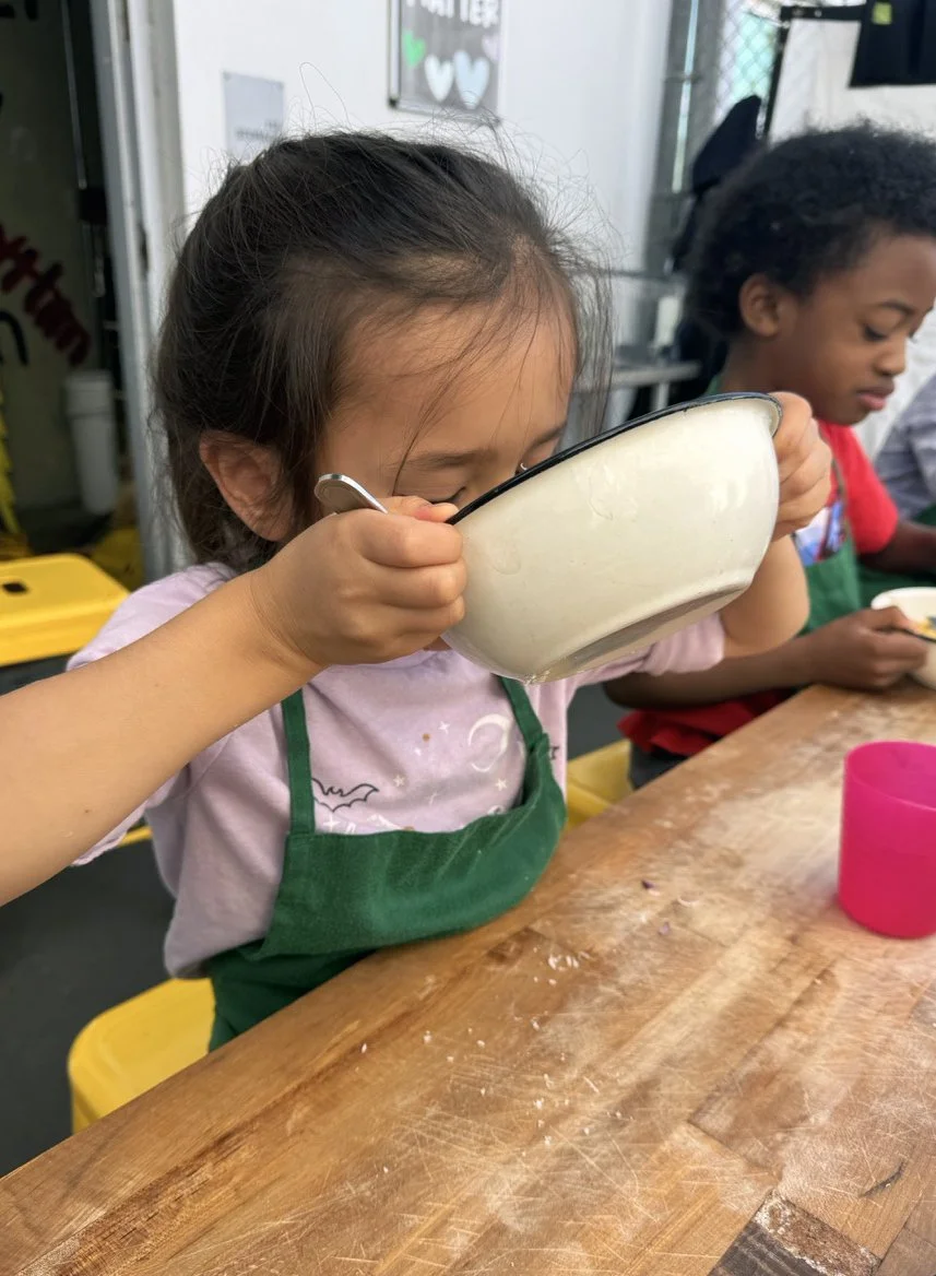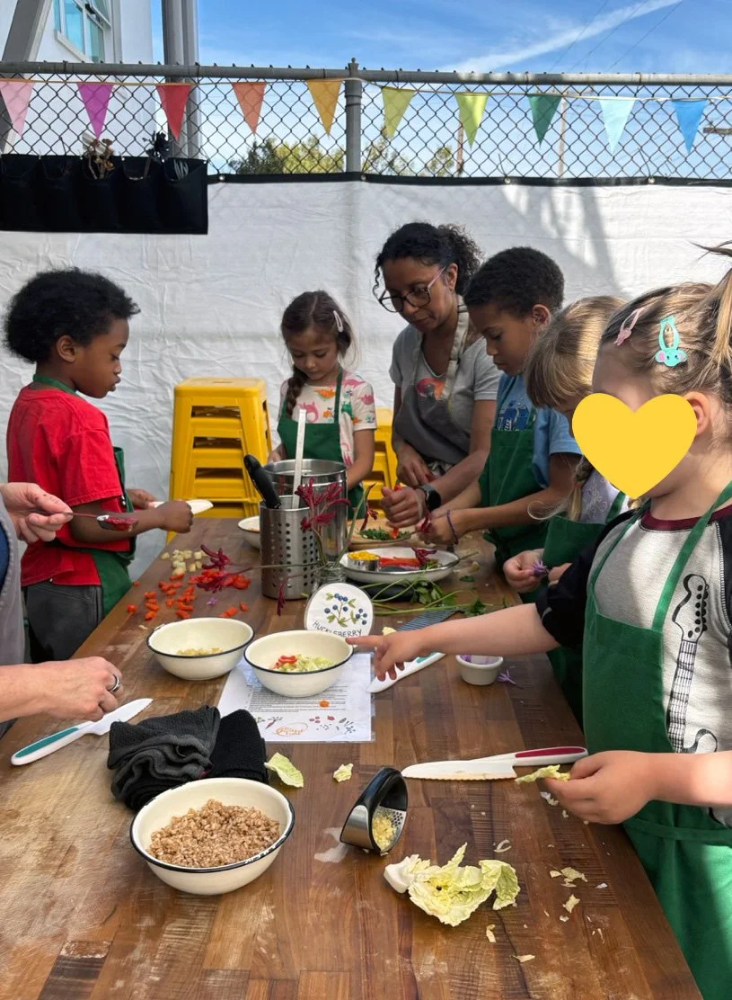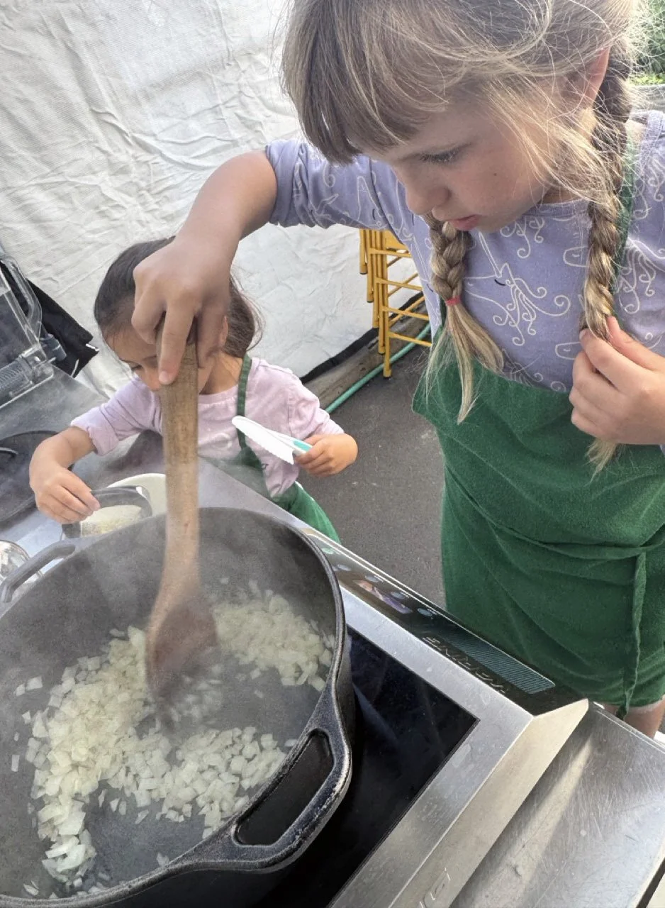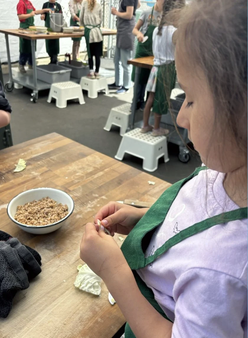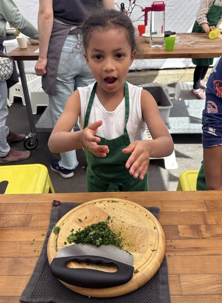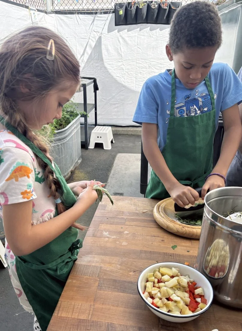 In the kitchen we made our own version of stone soup with many of the same ingredients highlighted in Brown’s book. The kindergarten chefs prepped so many fruits and vegetables, including bell peppers, potatoes, cabbage, carrots, and fresh herbs. Of course, we had to include a stone in each pot, and enjoyed each other’s company as we prepared and ate the meal together.