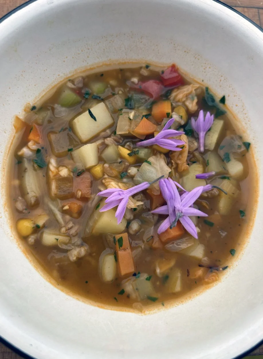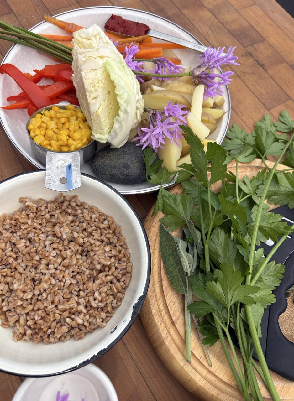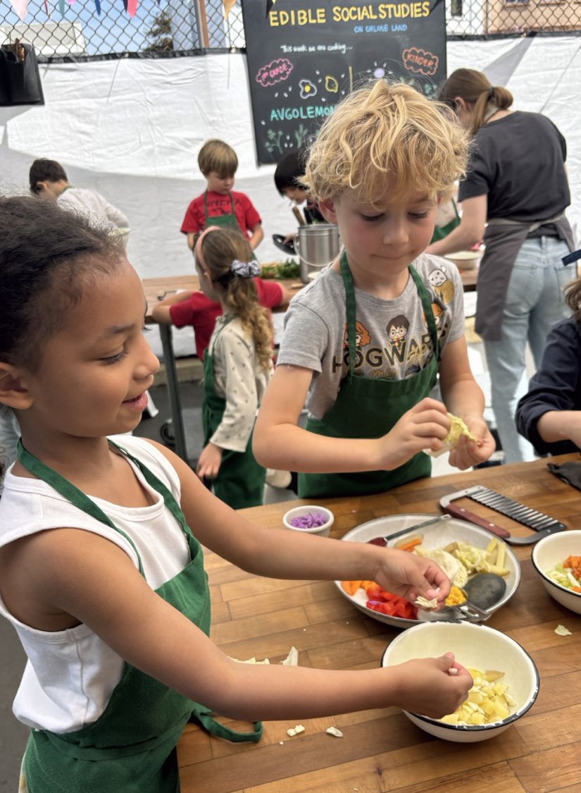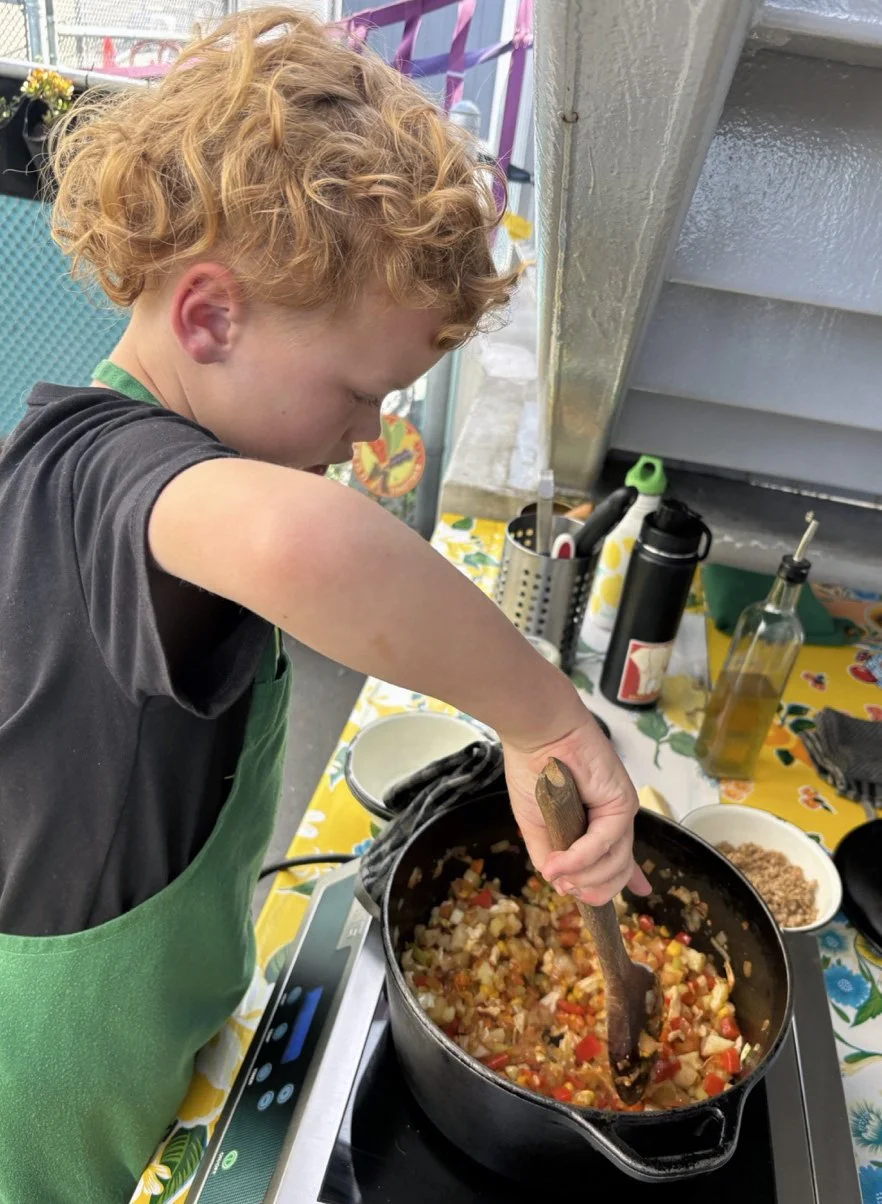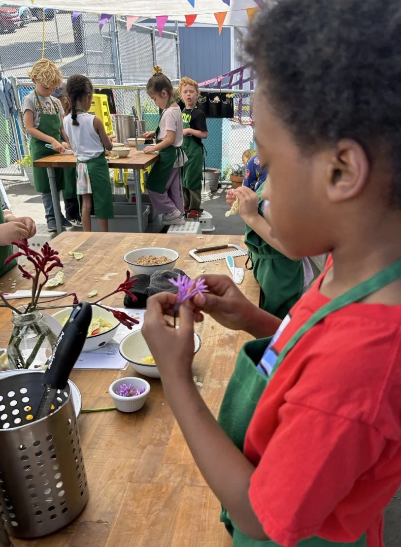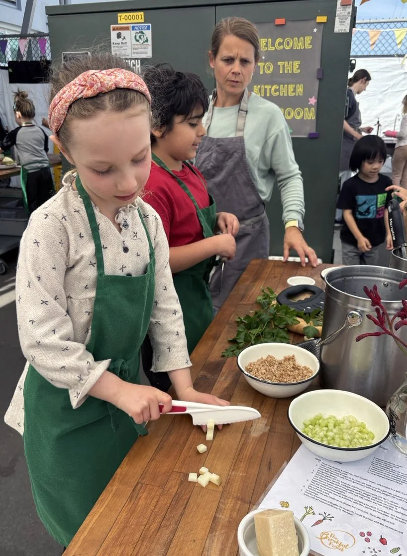In the kitchen we made our own version of stone soup with many of the same ingredients highlighted in Brown’s book. The kindergarten chefs prepped so many fruits and vegetables, including bell peppers, potatoes, cabbage, carrots, and fresh herbs. Of course, we had to include a stone in each pot, and enjoyed each other’s company as we prepared and ate the meal together.