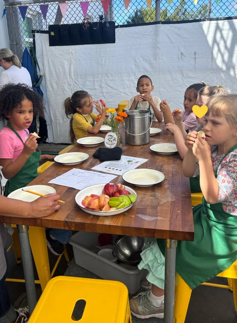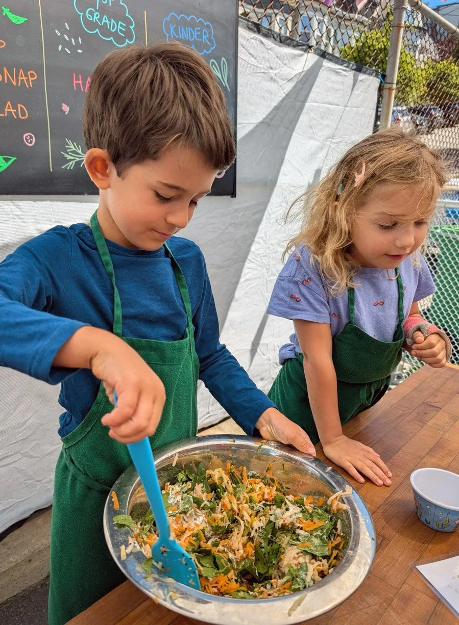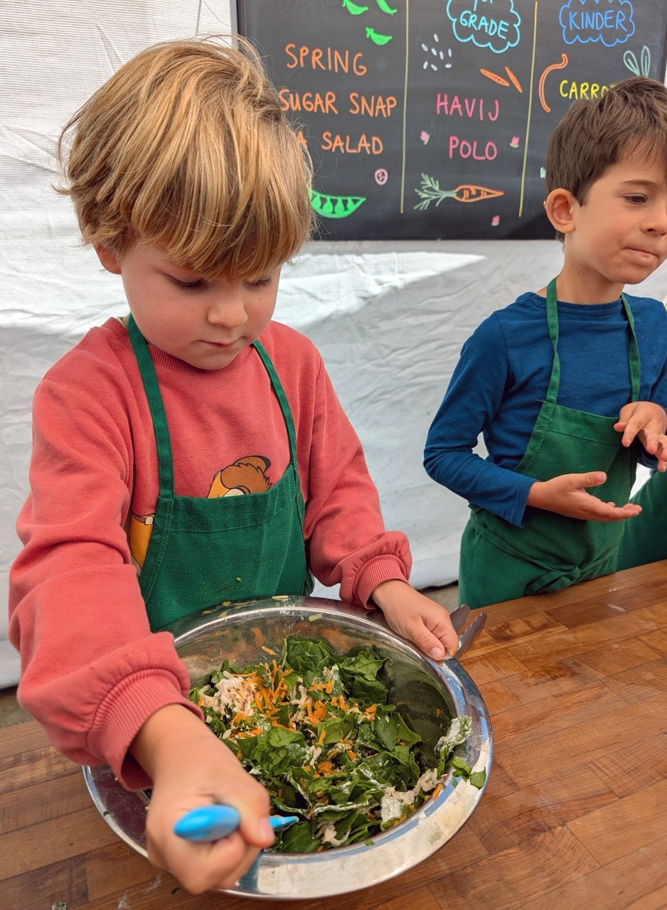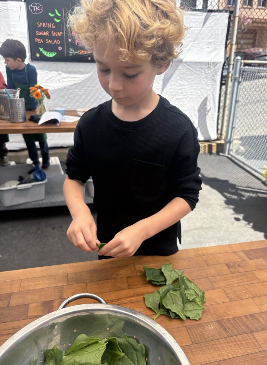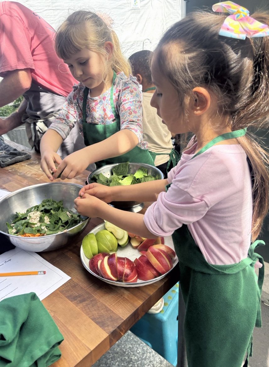 In the the kitchen the kindergarten chefs ripped up New Zealand spinach to add to a batter for carrot and spinach latkes. While the latkes were frying, they participated in a mindful tasting of four varieties of apple: Cosmic Crisp, Fuji, Granny Smith, and Pink Lady. We smelled the apples, listened to them, noticed many had speckles and contained multiple colors, chewed them thoughtfully, and observed all the juicy, tart, sweet flavors. Then we enjoyed the latkes with a homemade applesauce made from the same four varieties of apples we tasted. When we practiced mindfully eating our meal together, some chefs noticed that the latkes had the same aroma as sausage or that the applesauce contained lemon. Mindfulness is a practice we can continue to employ throughout our lives to keep our bodies and our communities strong and healthy.