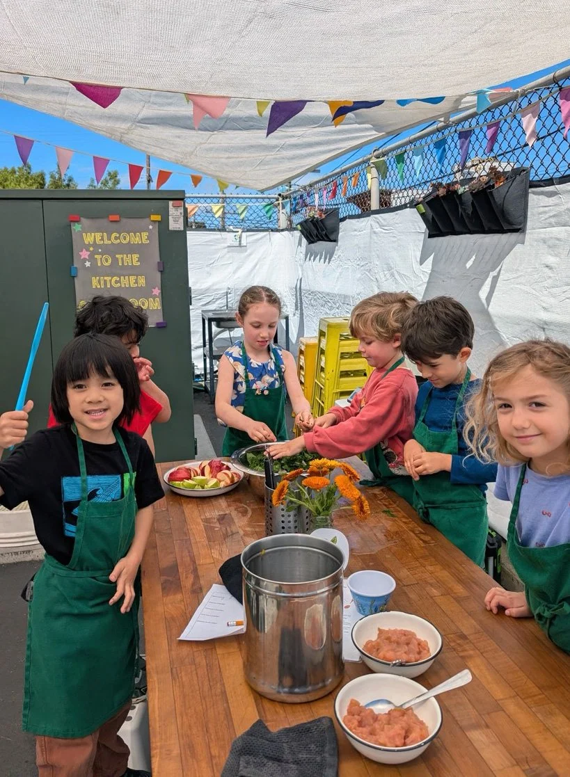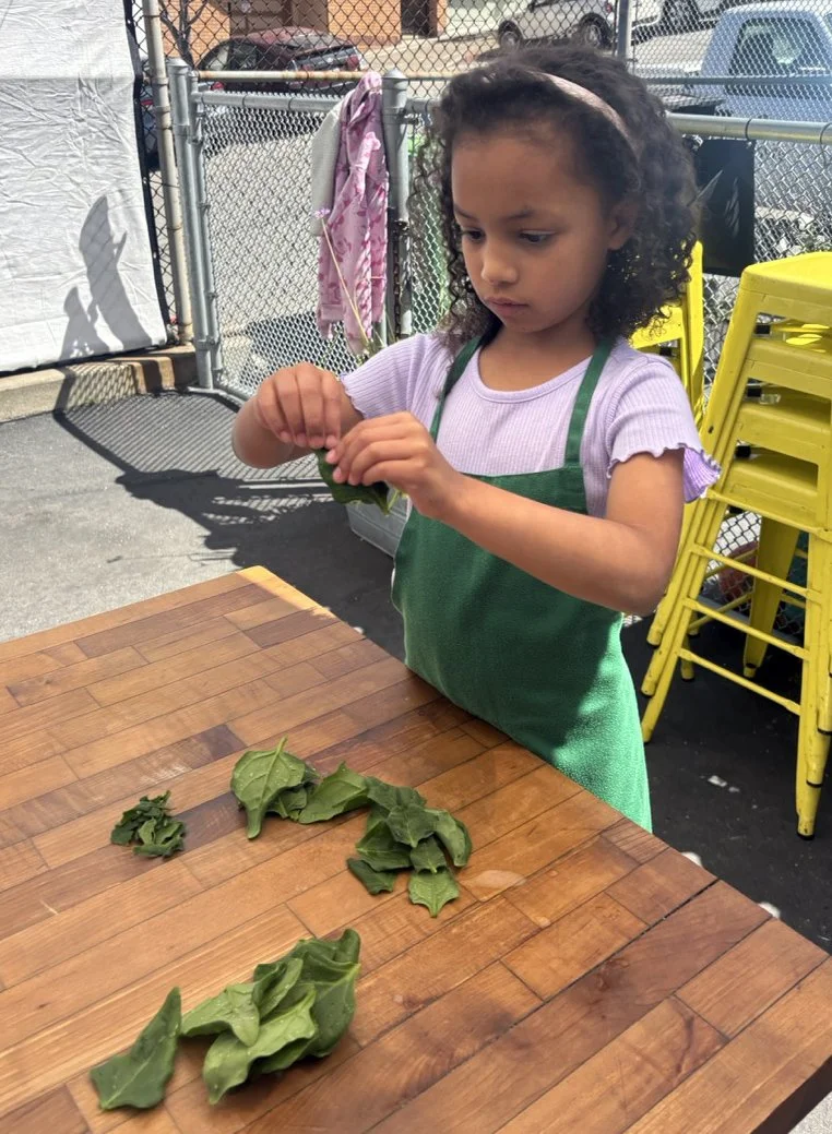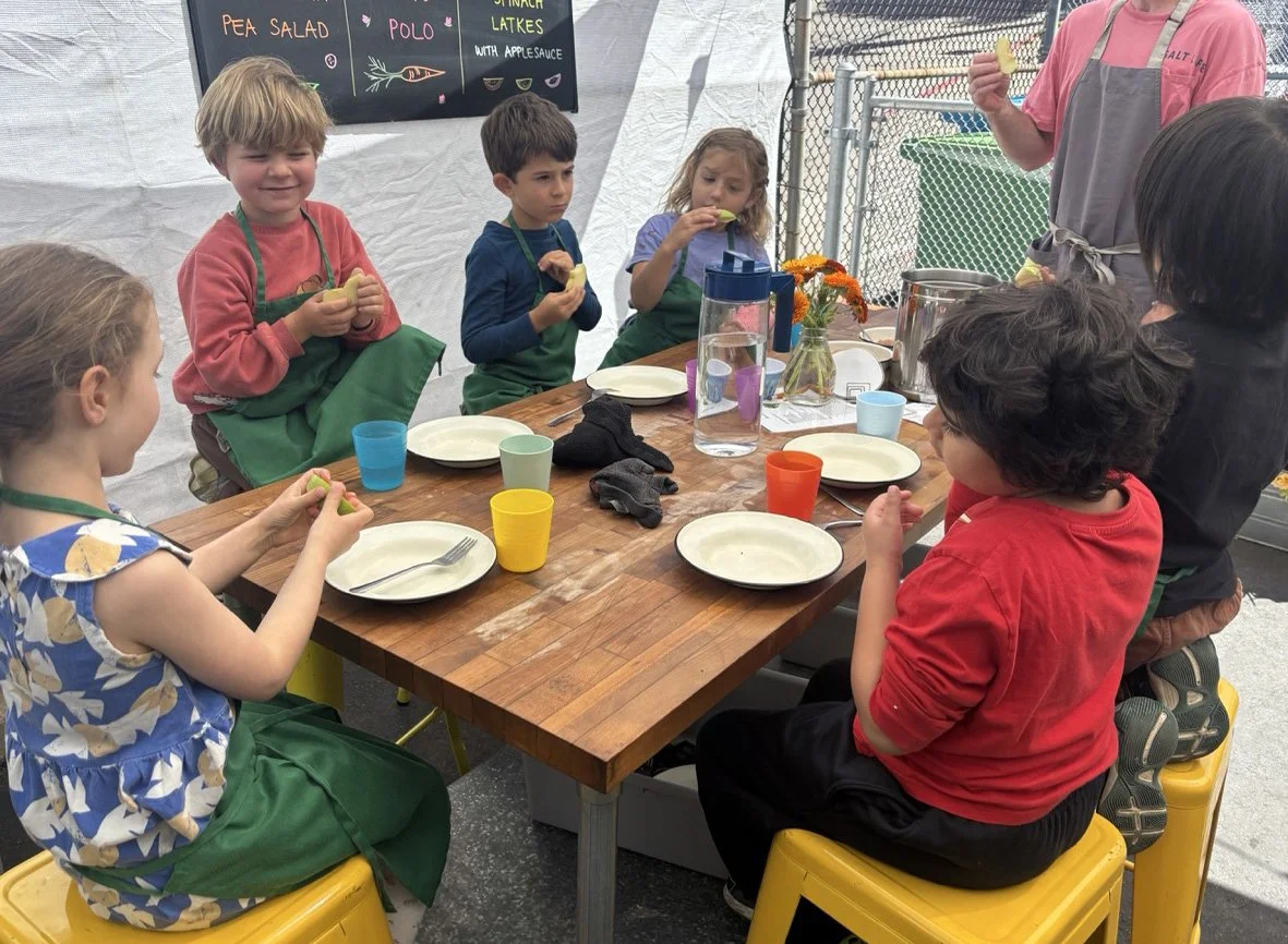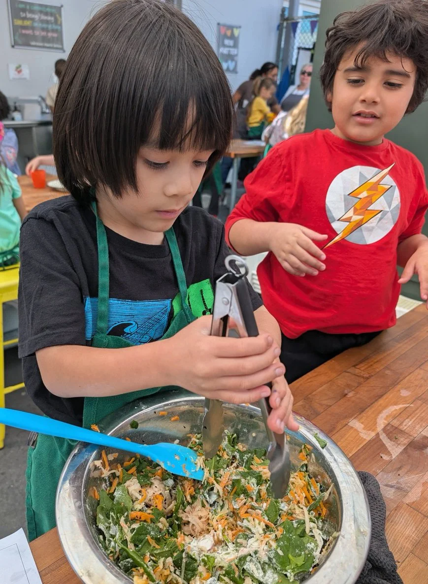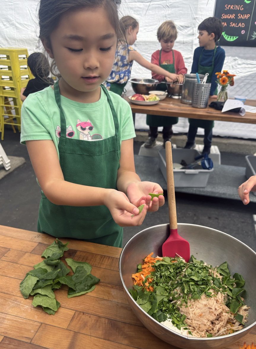In the the kitchen the kindergarten chefs ripped up New Zealand spinach to add to a batter for carrot and spinach latkes. While the latkes were frying, they participated in a mindful tasting of four varieties of apple: Cosmic Crisp, Fuji, Granny Smith, and Pink Lady. We smelled the apples, listened to them, noticed many had speckles and contained multiple colors, chewed them thoughtfully, and observed all the juicy, tart, sweet flavors. Then we enjoyed the latkes with a homemade applesauce made from the same four varieties of apples we tasted. When we practiced mindfully eating our meal together, some chefs noticed that the latkes had the same aroma as sausage or that the applesauce contained lemon. Mindfulness is a practice we can continue to employ throughout our lives to keep our bodies and our communities strong and healthy.
