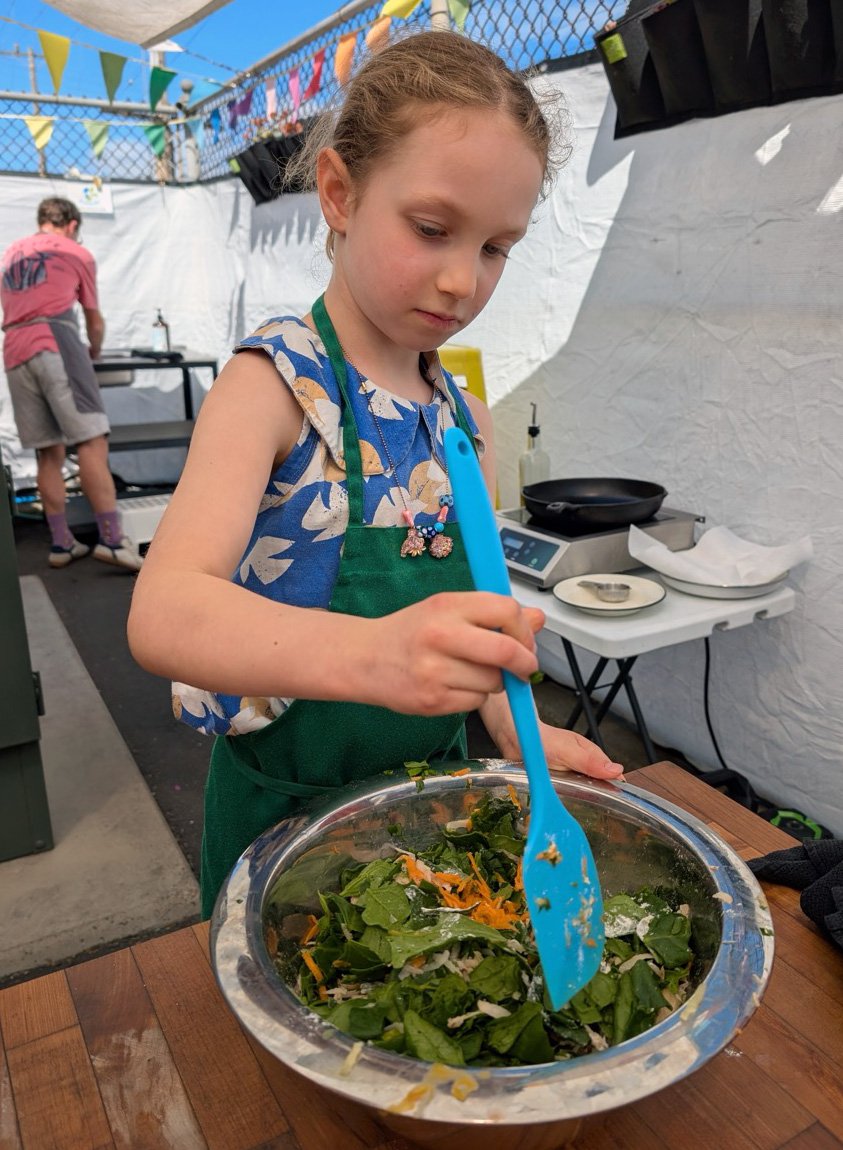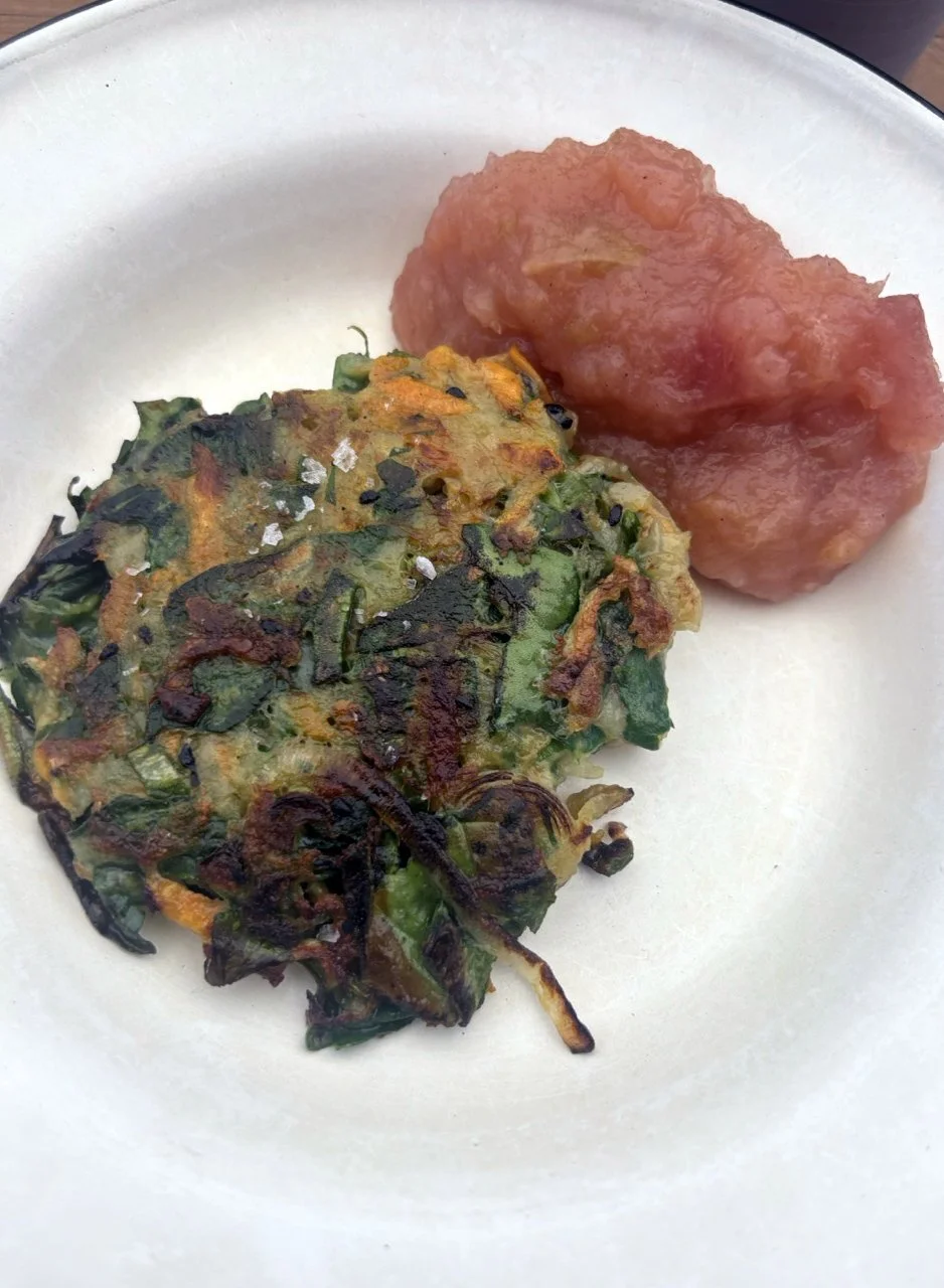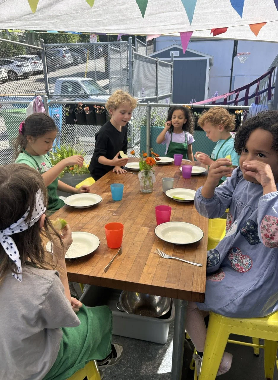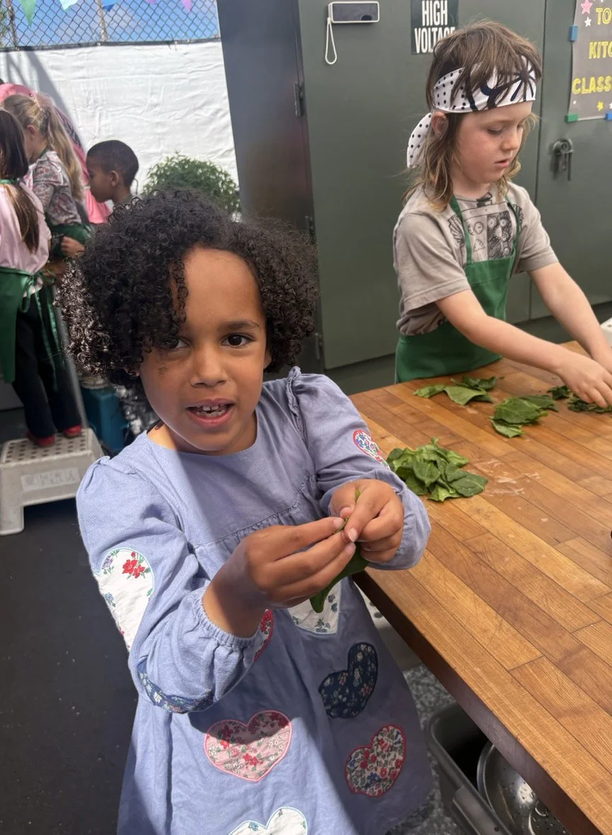 In the the kitchen the kindergarten chefs ripped up New Zealand spinach to add to a batter for carrot and spinach latkes. While the latkes were frying, they participated in a mindful tasting of four varieties of apple: Cosmic Crisp, Fuji, Granny Smith, and Pink Lady. We smelled the apples, listened to them, noticed many had speckles and contained multiple colors, chewed them thoughtfully, and observed all the juicy, tart, sweet flavors. Then we enjoyed the latkes with a homemade applesauce made from the same four varieties of apples we tasted. When we practiced mindfully eating our meal together, some chefs noticed that the latkes had the same aroma as sausage or that the applesauce contained lemon. Mindfulness is a practice we can continue to employ throughout our lives to keep our bodies and our communities strong and healthy.