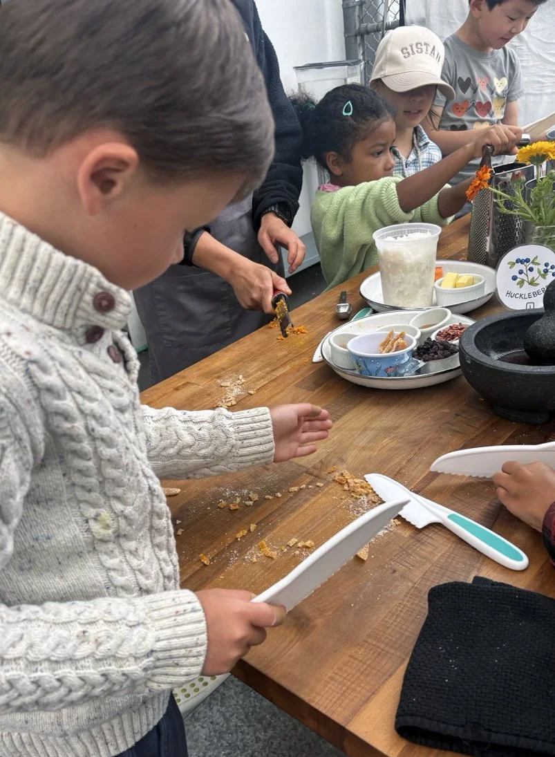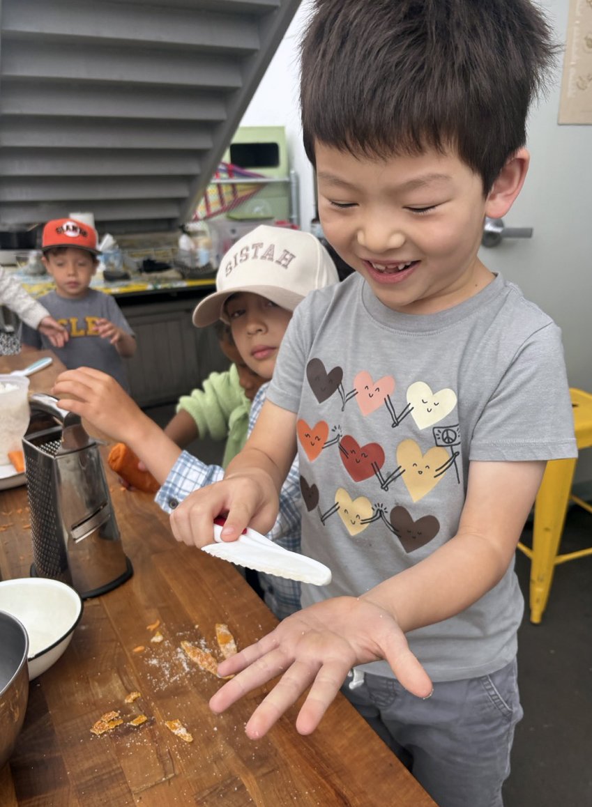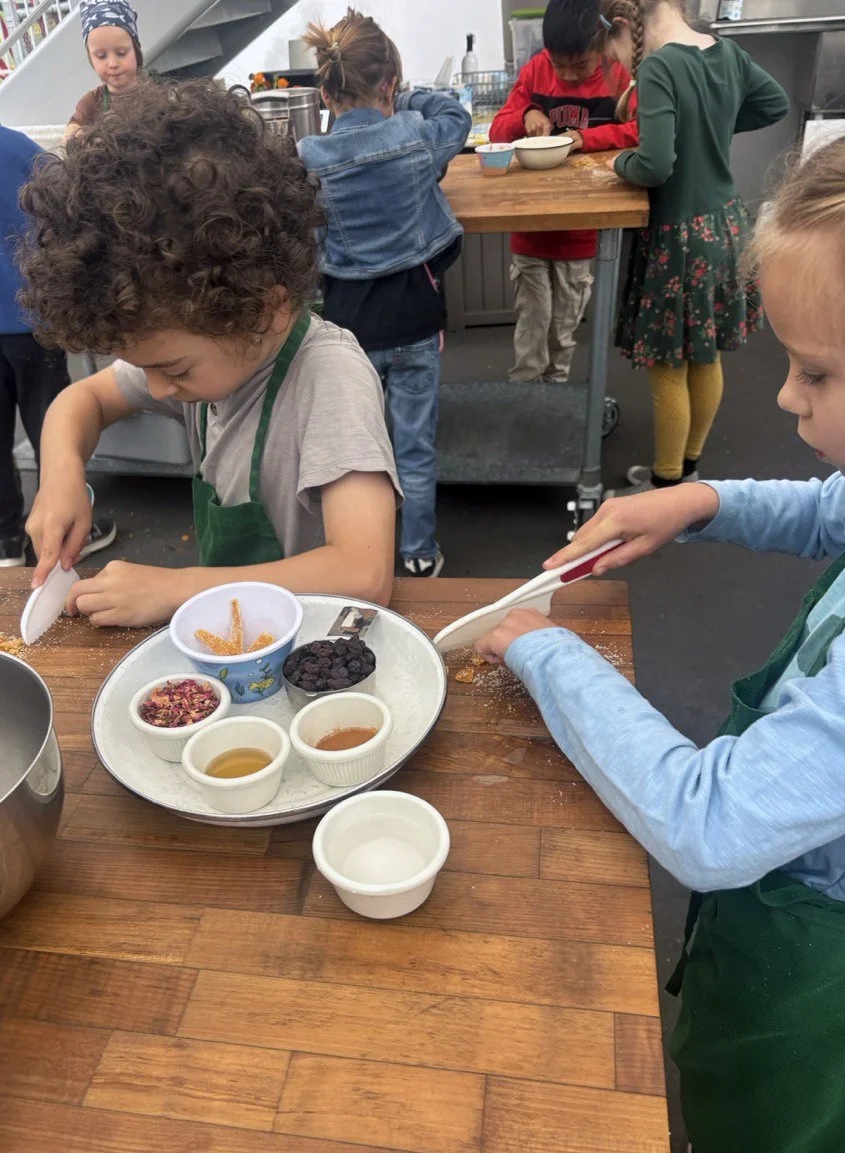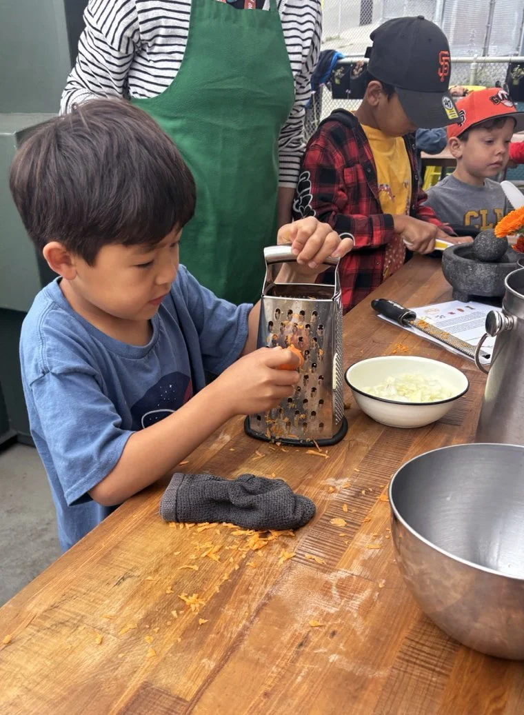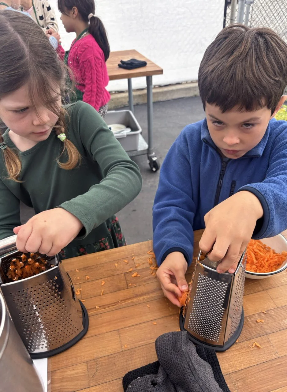 In the kitchen we made a Persian carrot rice dish, havij polo, featuring many flavors we may not have regular exposure to such as saffron, turmeric, candied orange peel, rose petals, and the use of cinnamon in a savory dish. The first grade chefs truly demonstrated their comfort and skill in the kitchen classroom and used a variety of tools to create a fragrant, colorful, and deeply tasty rice preparation from the Middle East.