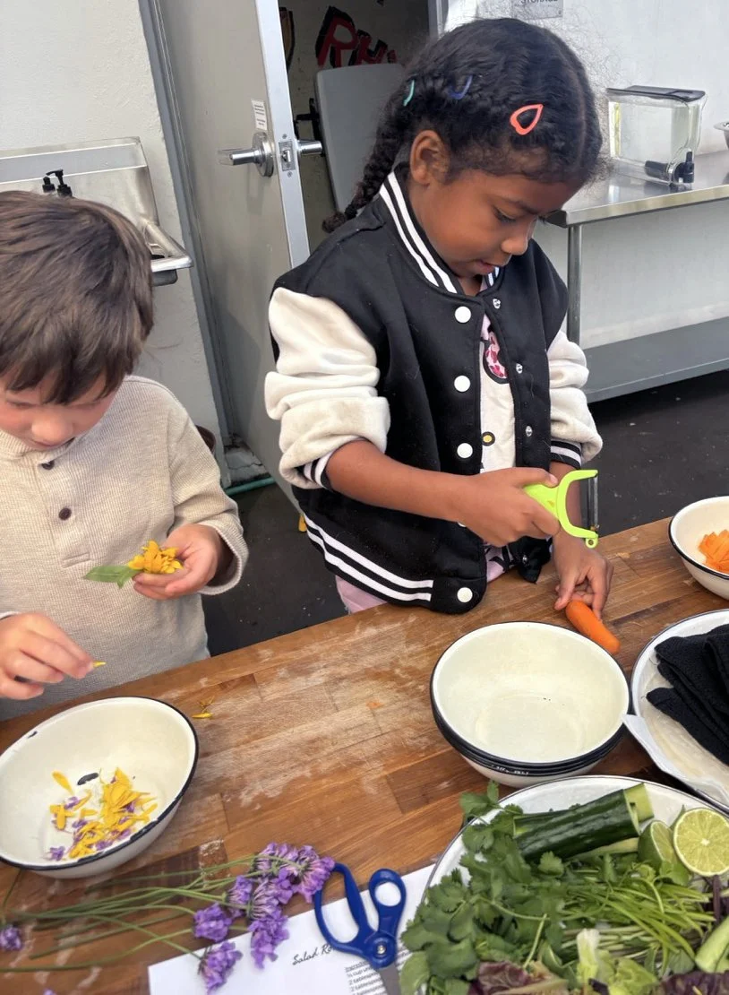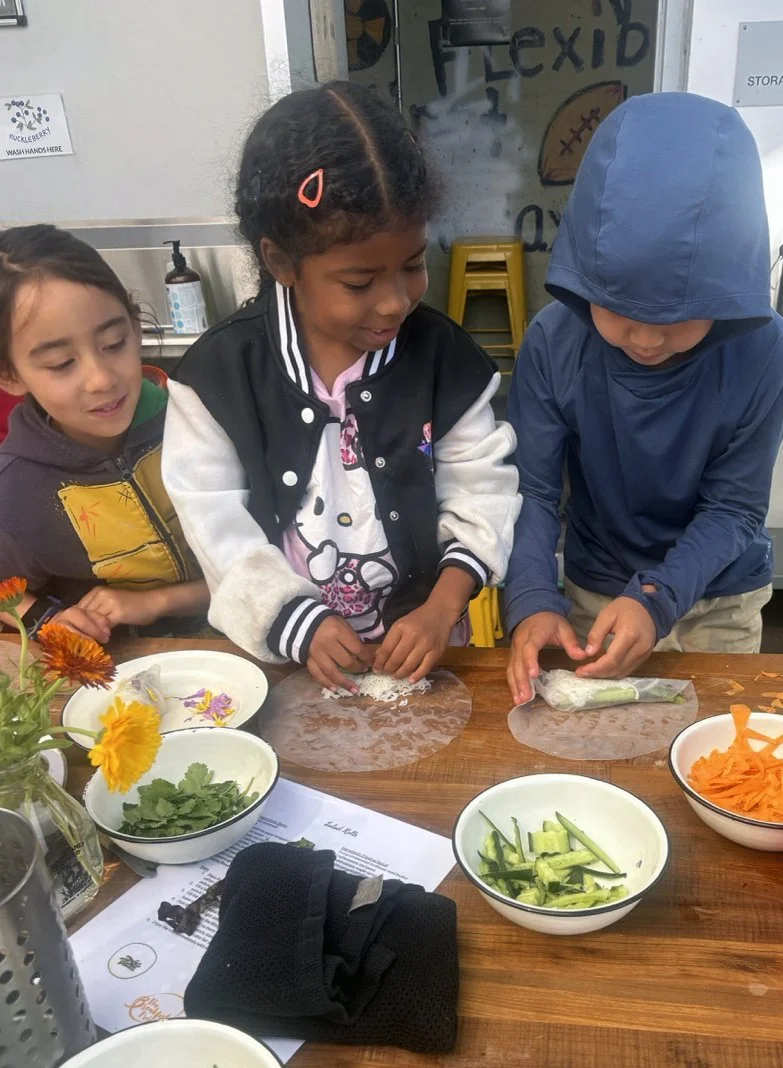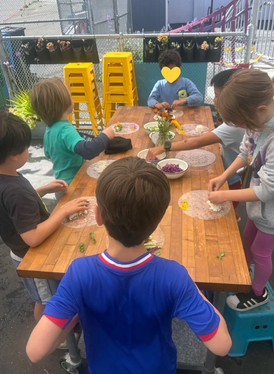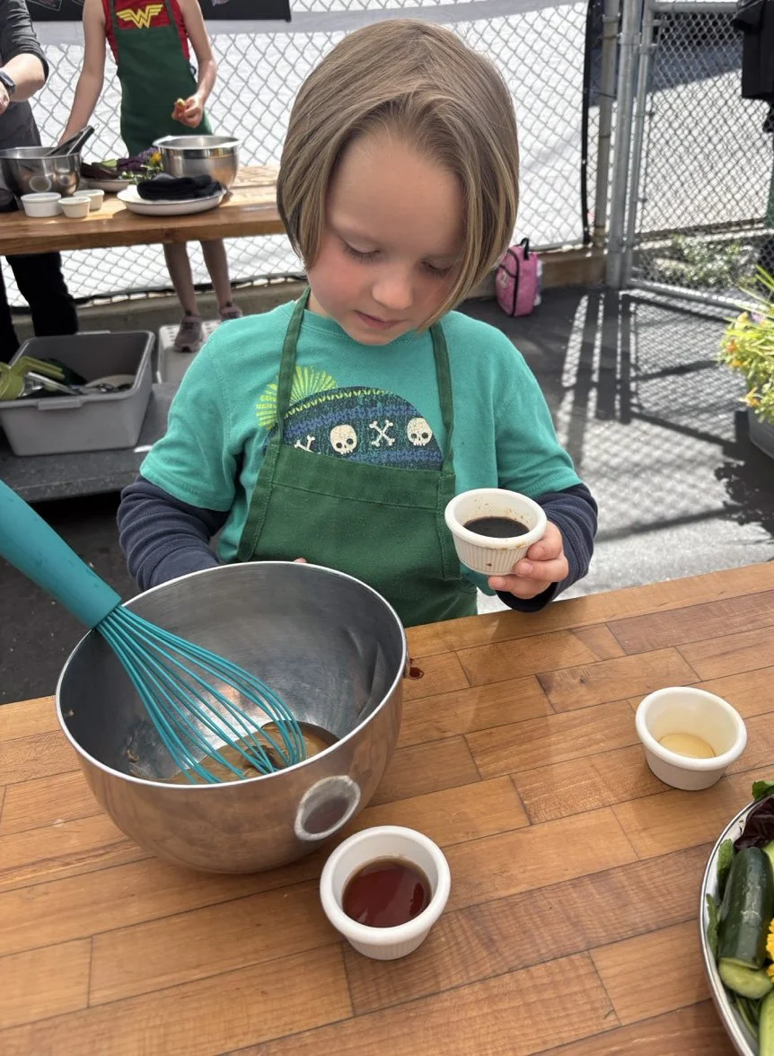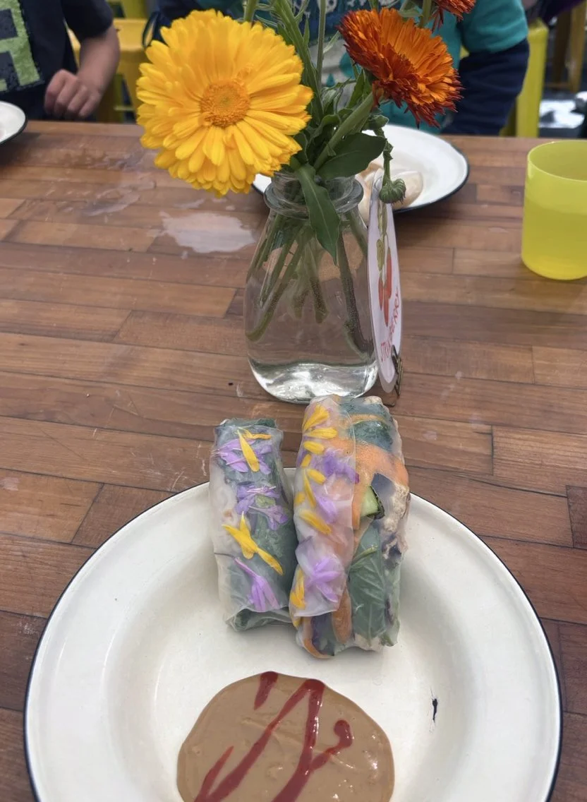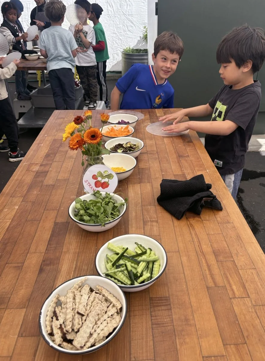 In the kitchen the first grade chefs made salad rolls featuring edible rice paper and rice vermicelli. Everyone got to make their own rolls filled with loads of colorful ingredients and enjoyed them with a nut-free dipping sauce. The edible flowers (calendula, society garlic, and pincushion flowers) were grown at the Dearborn Community Garden, which most of the first graders visited on a field trip last spring!