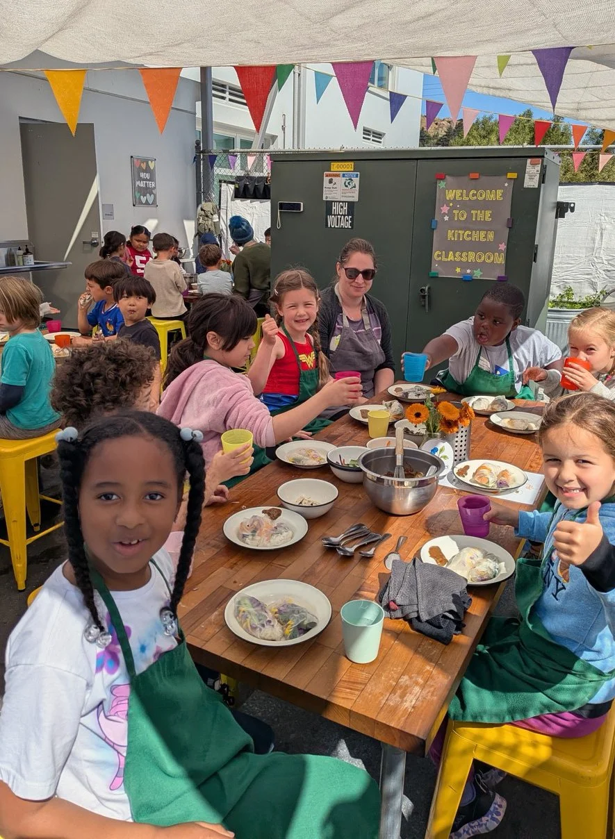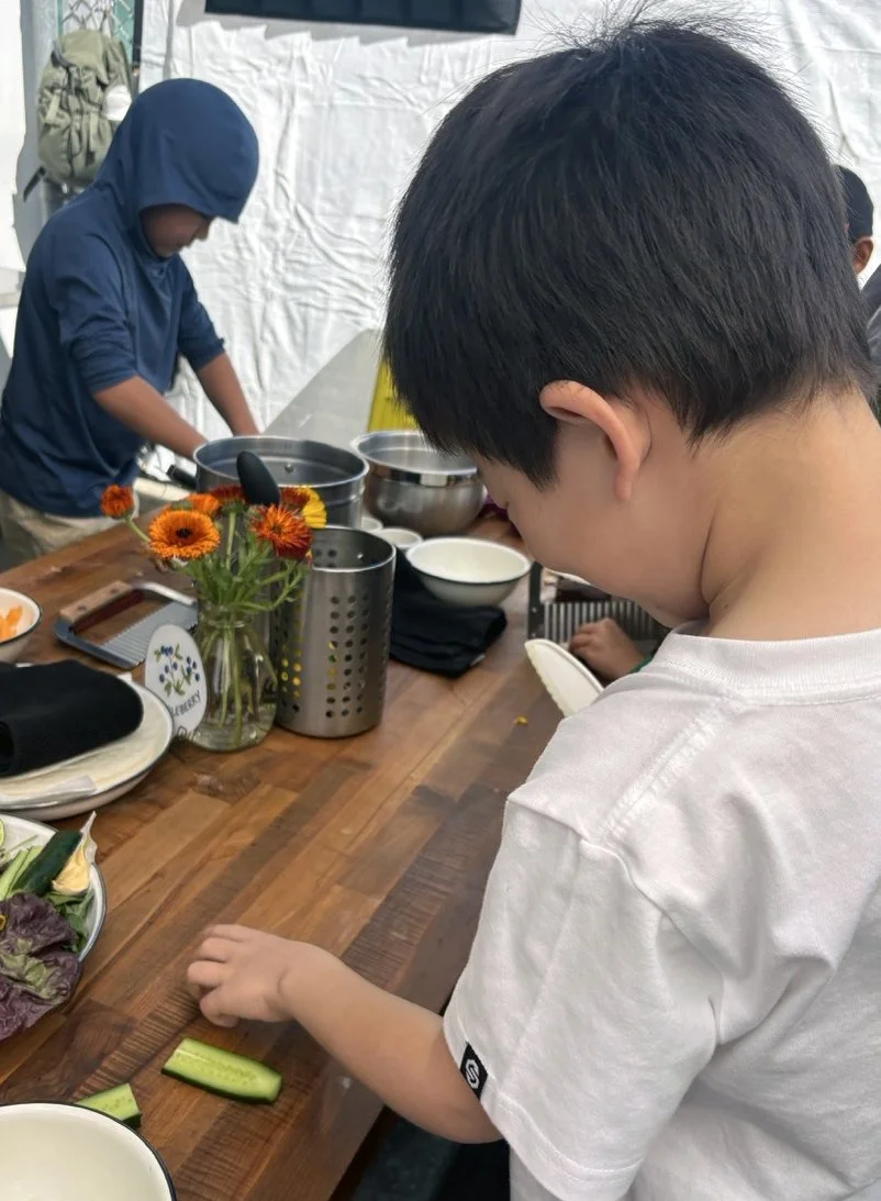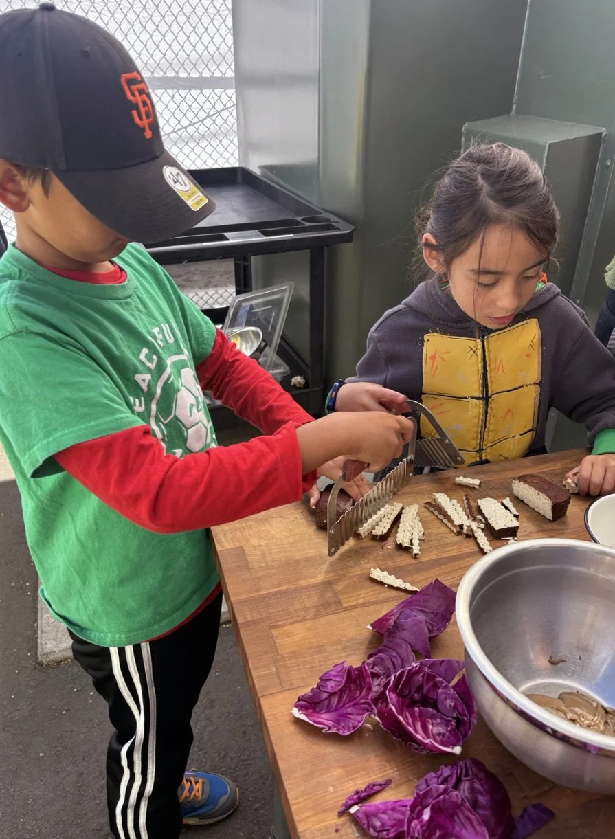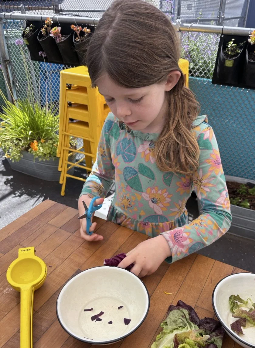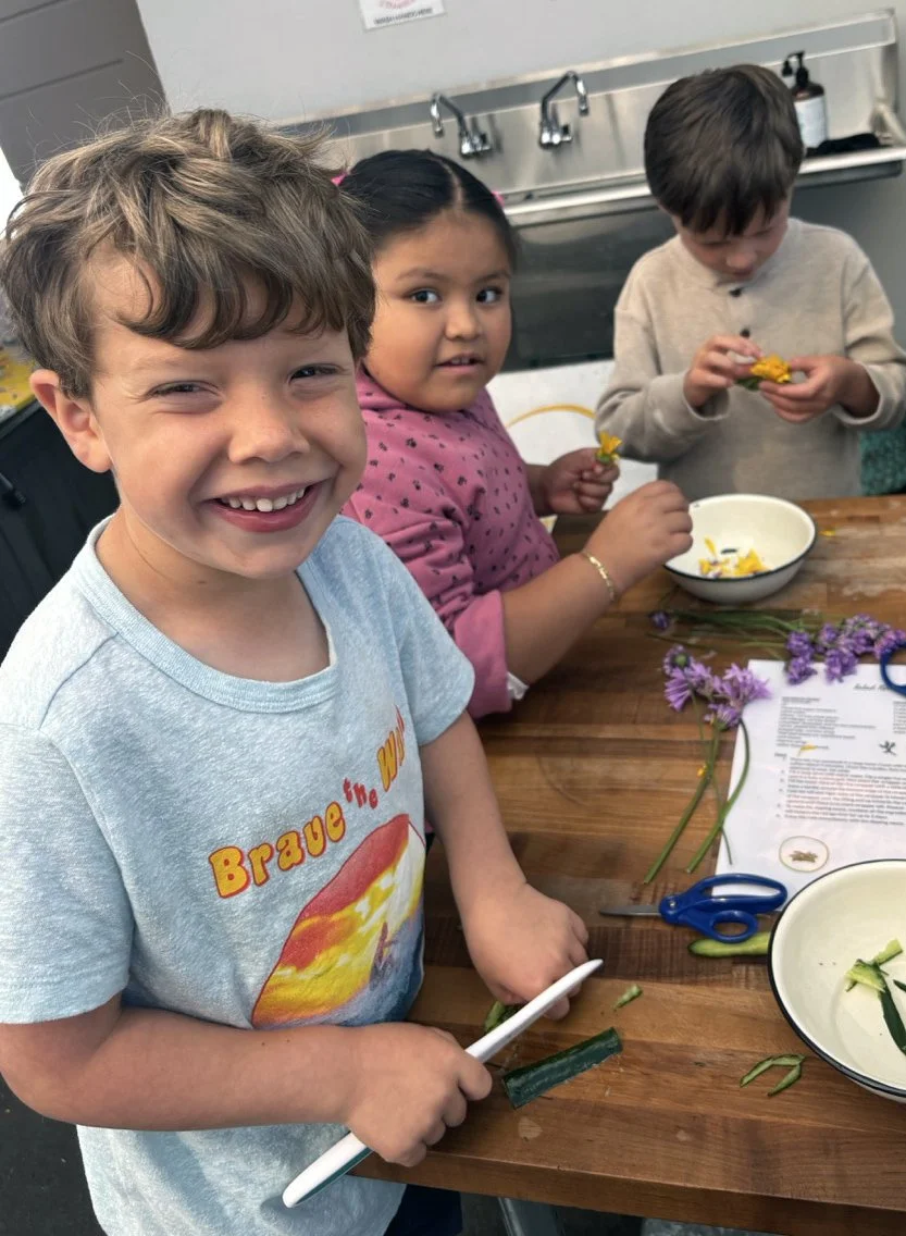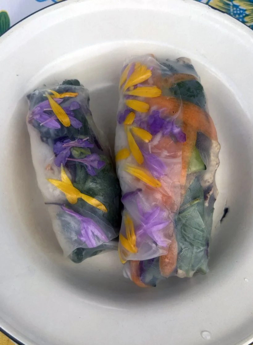 In the kitchen the first grade chefs made salad rolls featuring edible rice paper and rice vermicelli. Everyone got to make their own rolls filled with loads of colorful ingredients and enjoyed them with a nut-free dipping sauce. The edible flowers (calendula, society garlic, and pincushion flowers) were grown at the Dearborn Community Garden, which most of the first graders visited on a field trip last spring!