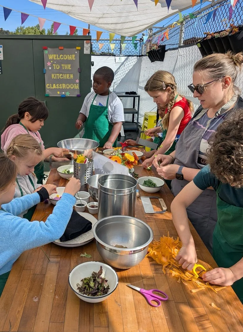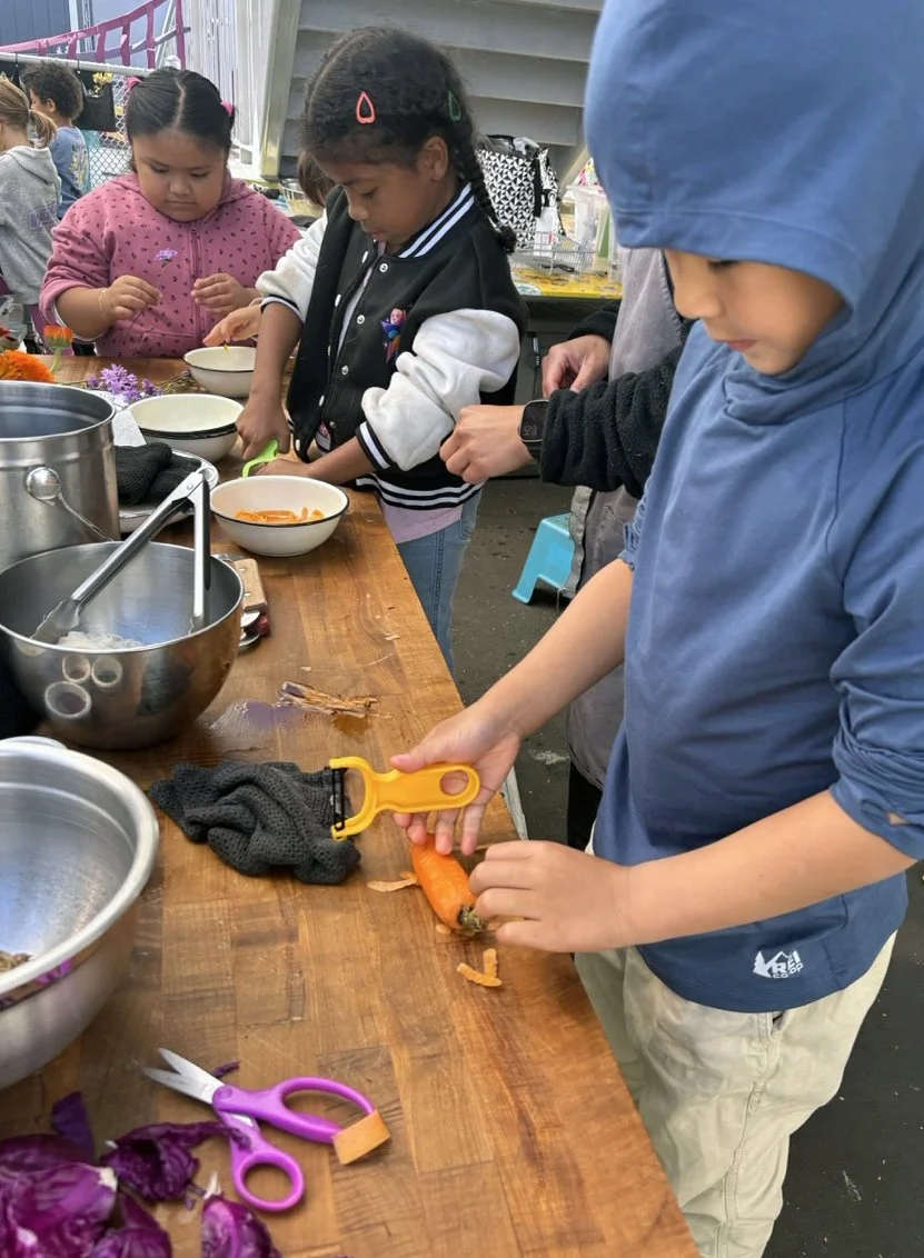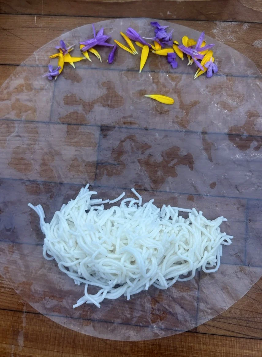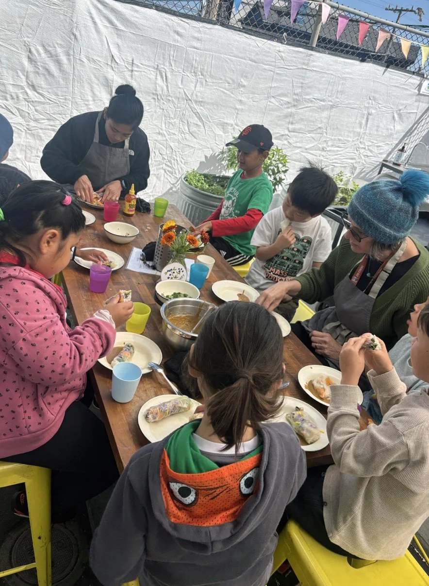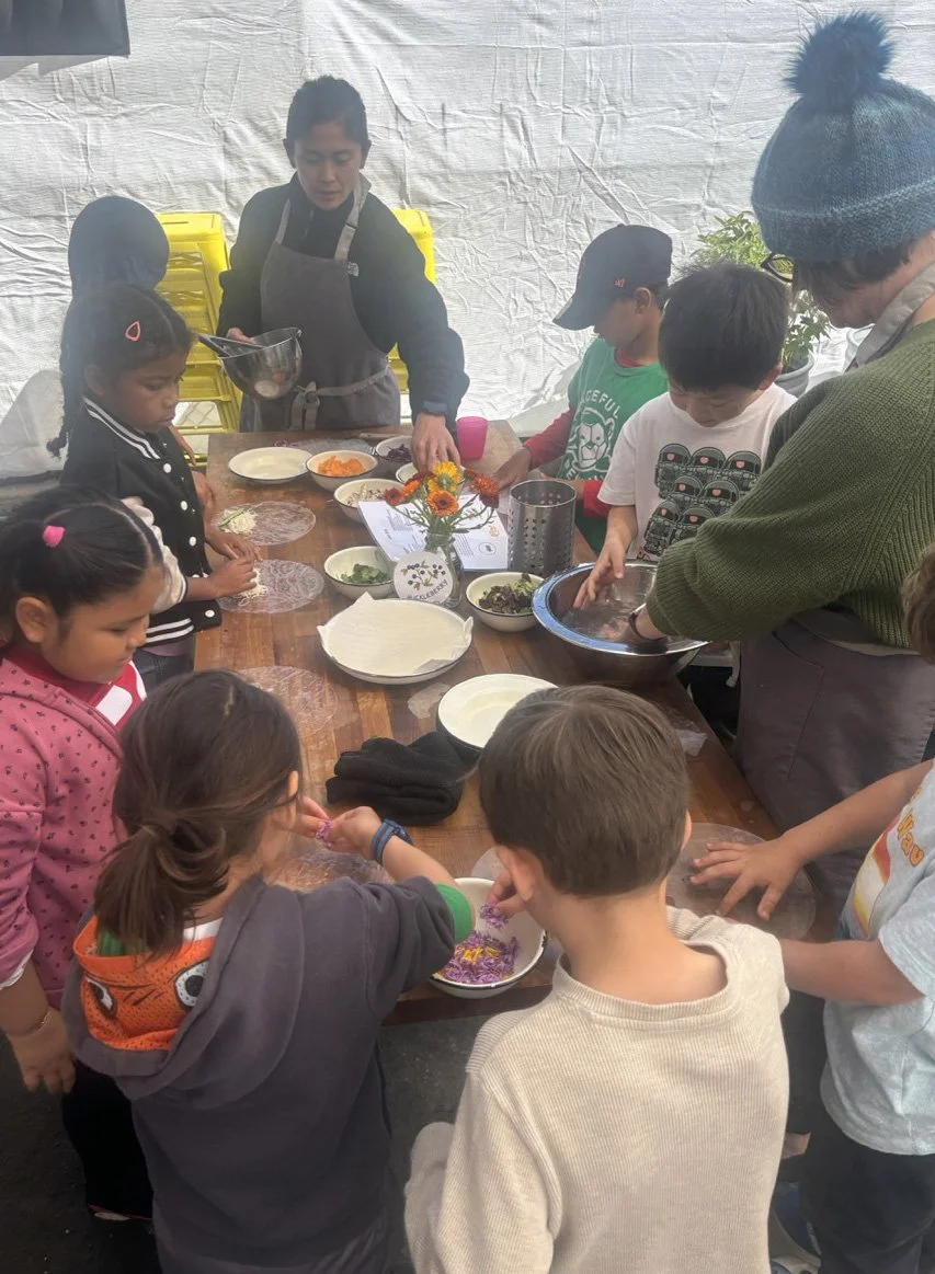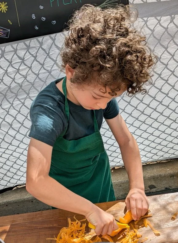In the kitchen the first grade chefs made salad rolls featuring edible rice paper and rice vermicelli. Everyone got to make their own rolls filled with loads of colorful ingredients and enjoyed them with a nut-free dipping sauce. The edible flowers (calendula, society garlic, and pincushion flowers) were grown at the Dearborn Community Garden, which most of the first graders visited on a field trip last spring!