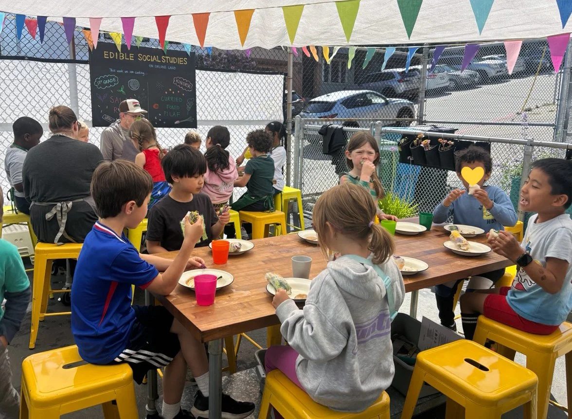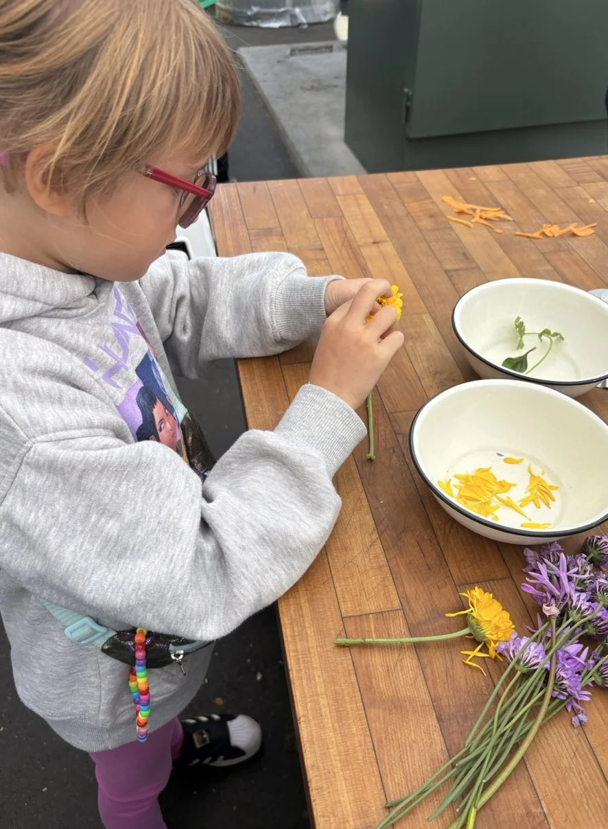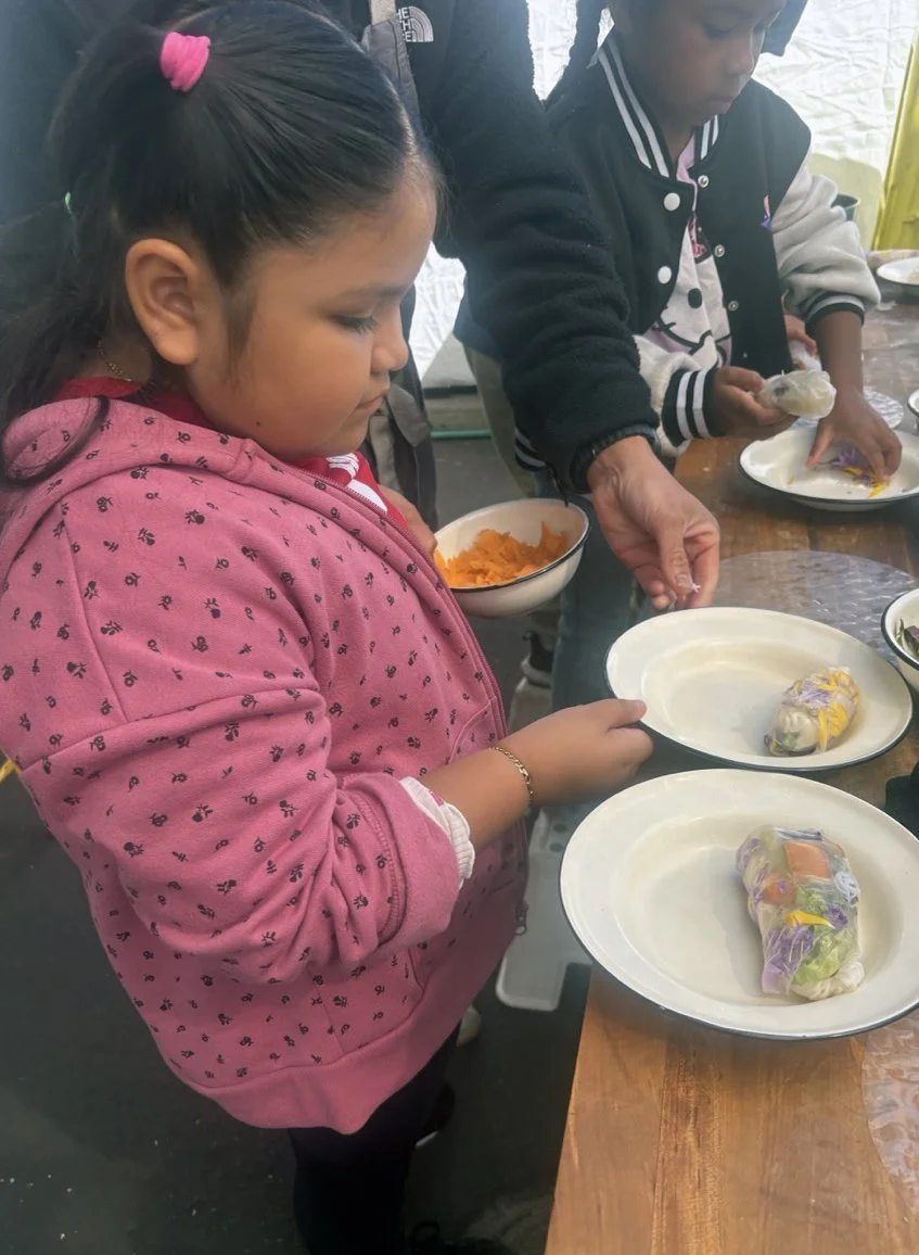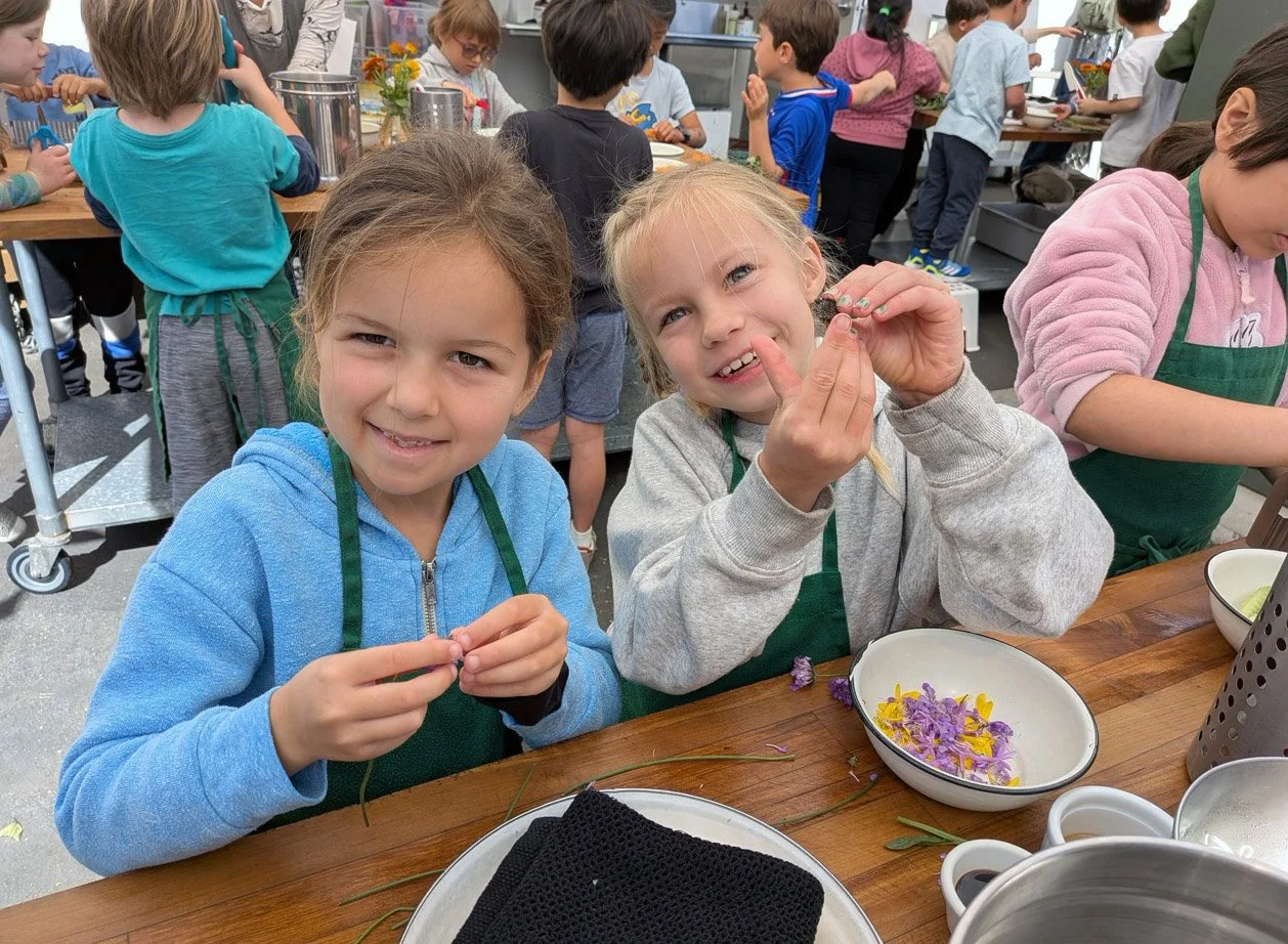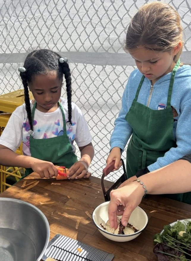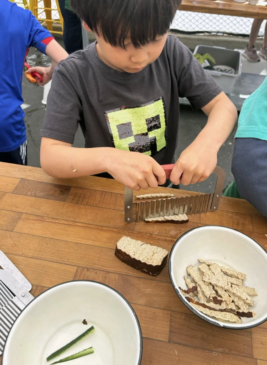 In the kitchen the first grade chefs made salad rolls featuring edible rice paper and rice vermicelli. Everyone got to make their own rolls filled with loads of colorful ingredients and enjoyed them with a nut-free dipping sauce. The edible flowers (calendula, society garlic, and pincushion flowers) were grown at the Dearborn Community Garden, which most of the first graders visited on a field trip last spring!