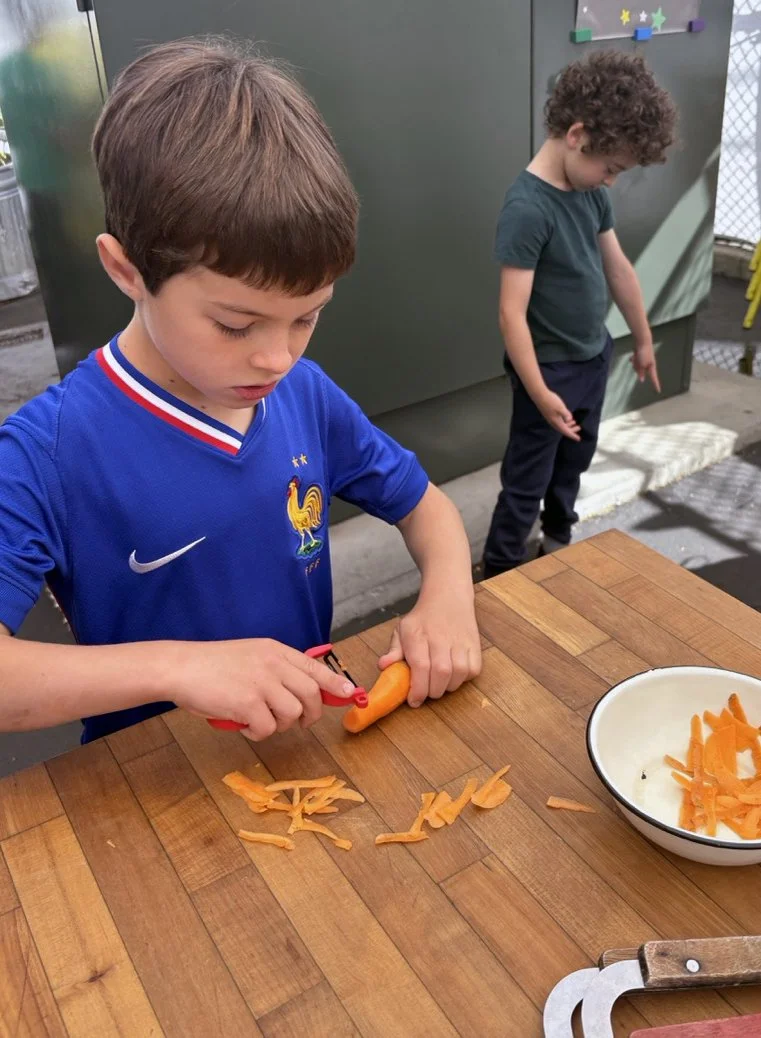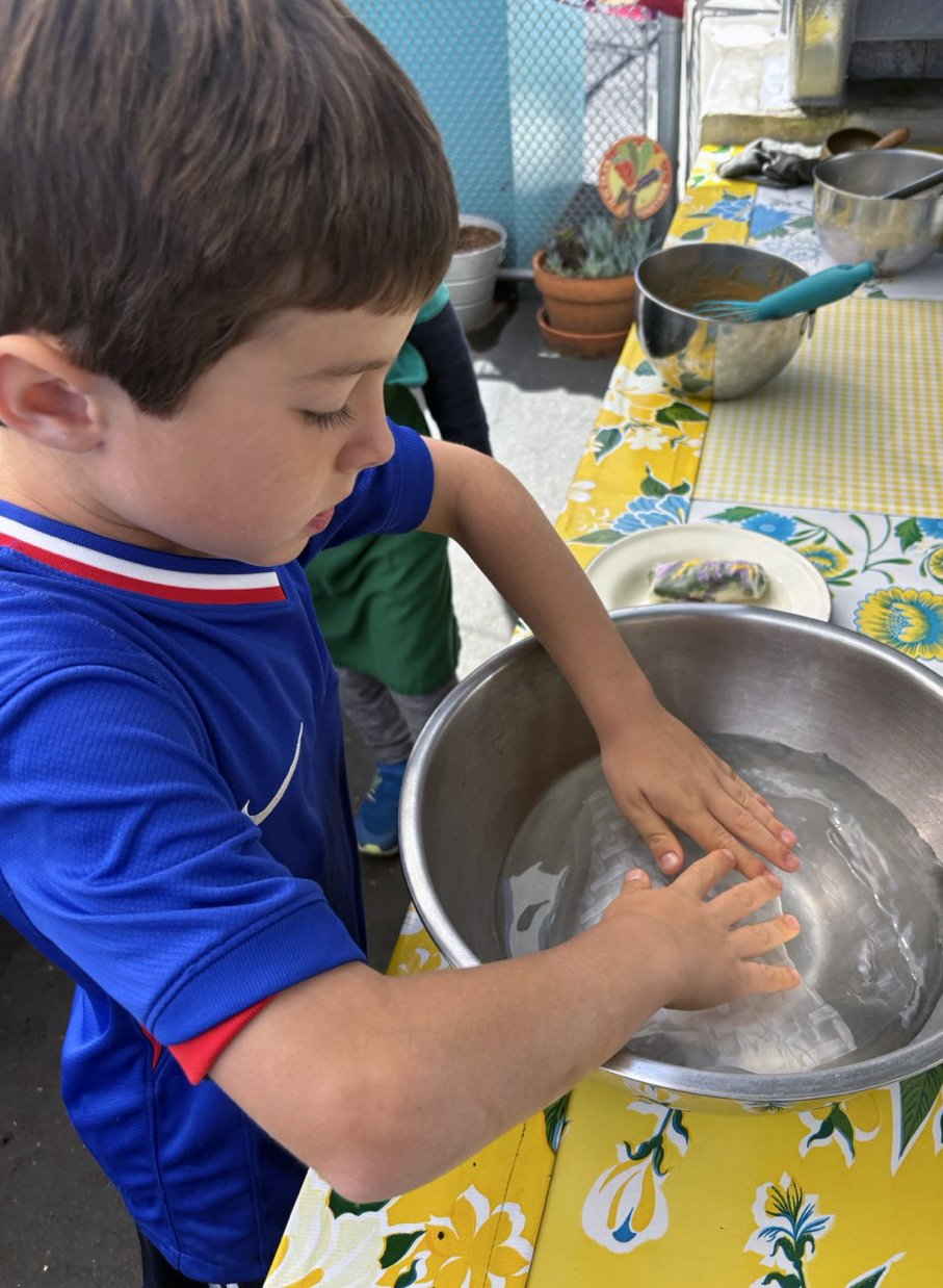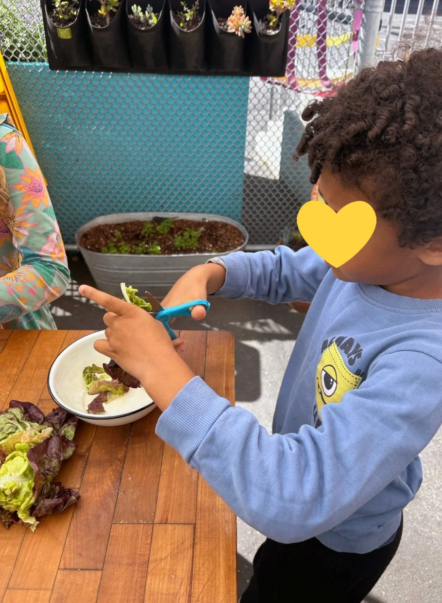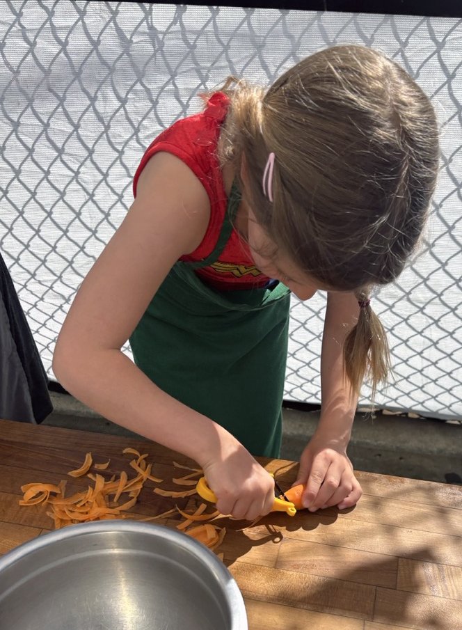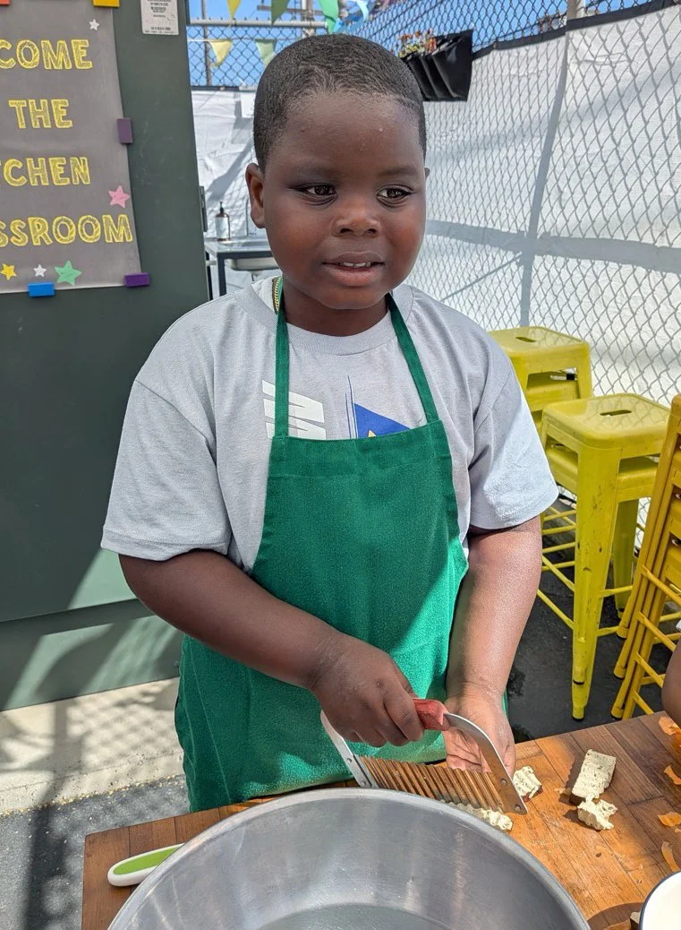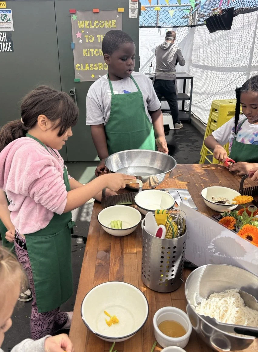In the kitchen the first grade chefs made salad rolls featuring edible rice paper and rice vermicelli. Everyone got to make their own rolls filled with loads of colorful ingredients and enjoyed them with a nut-free dipping sauce. The edible flowers (calendula, society garlic, and pincushion flowers) were grown at the Dearborn Community Garden, which most of the first graders visited on a field trip last spring!