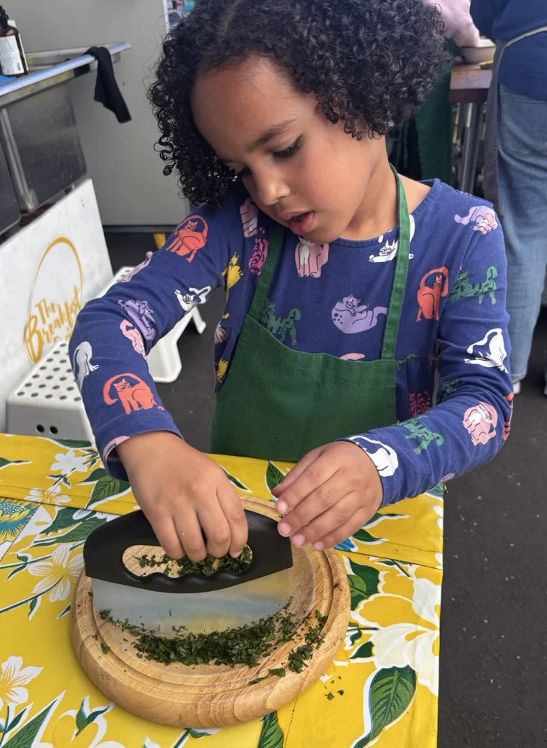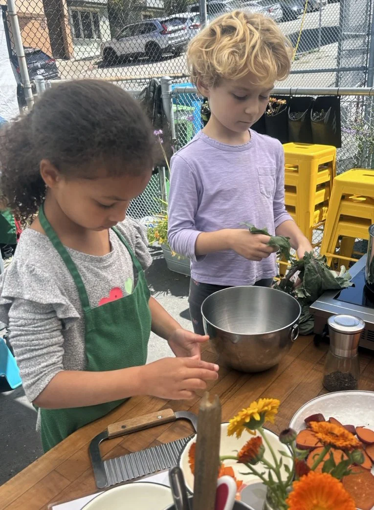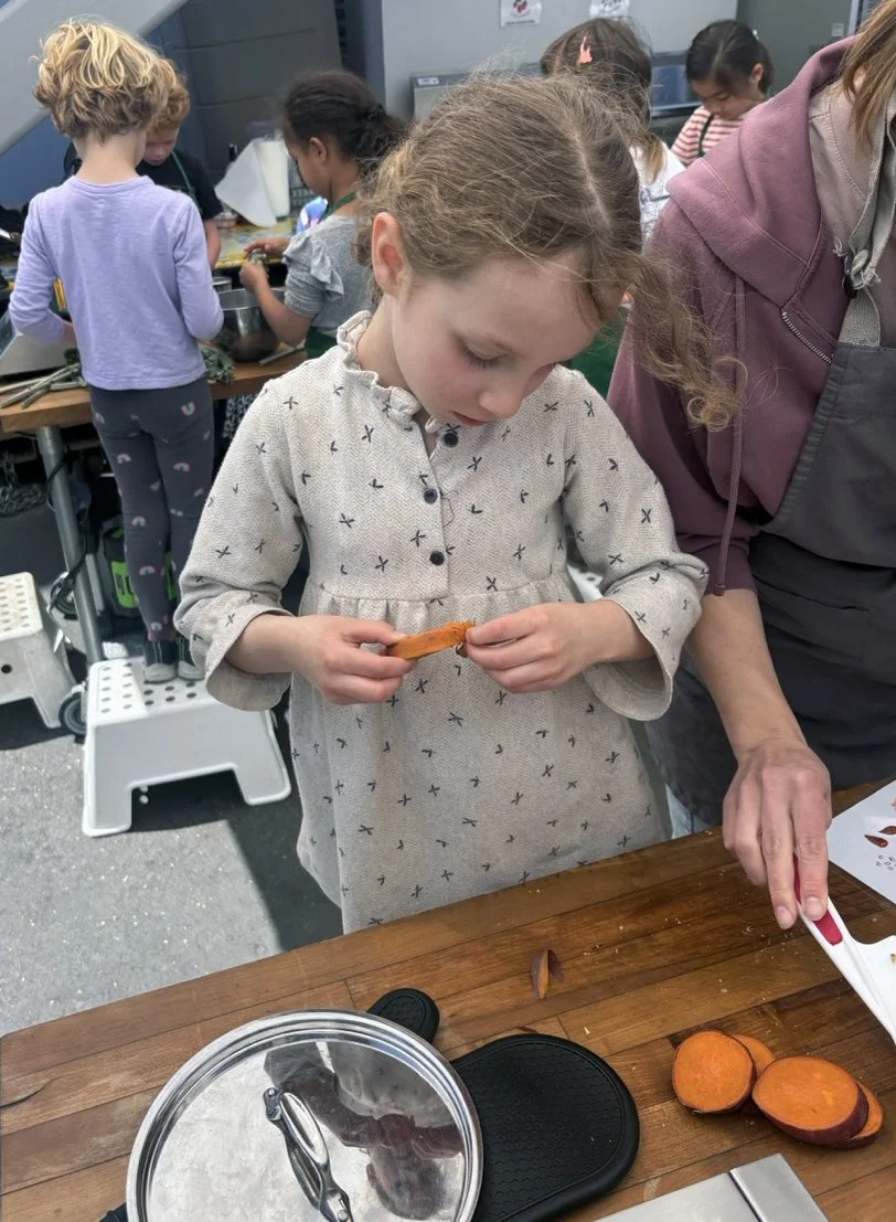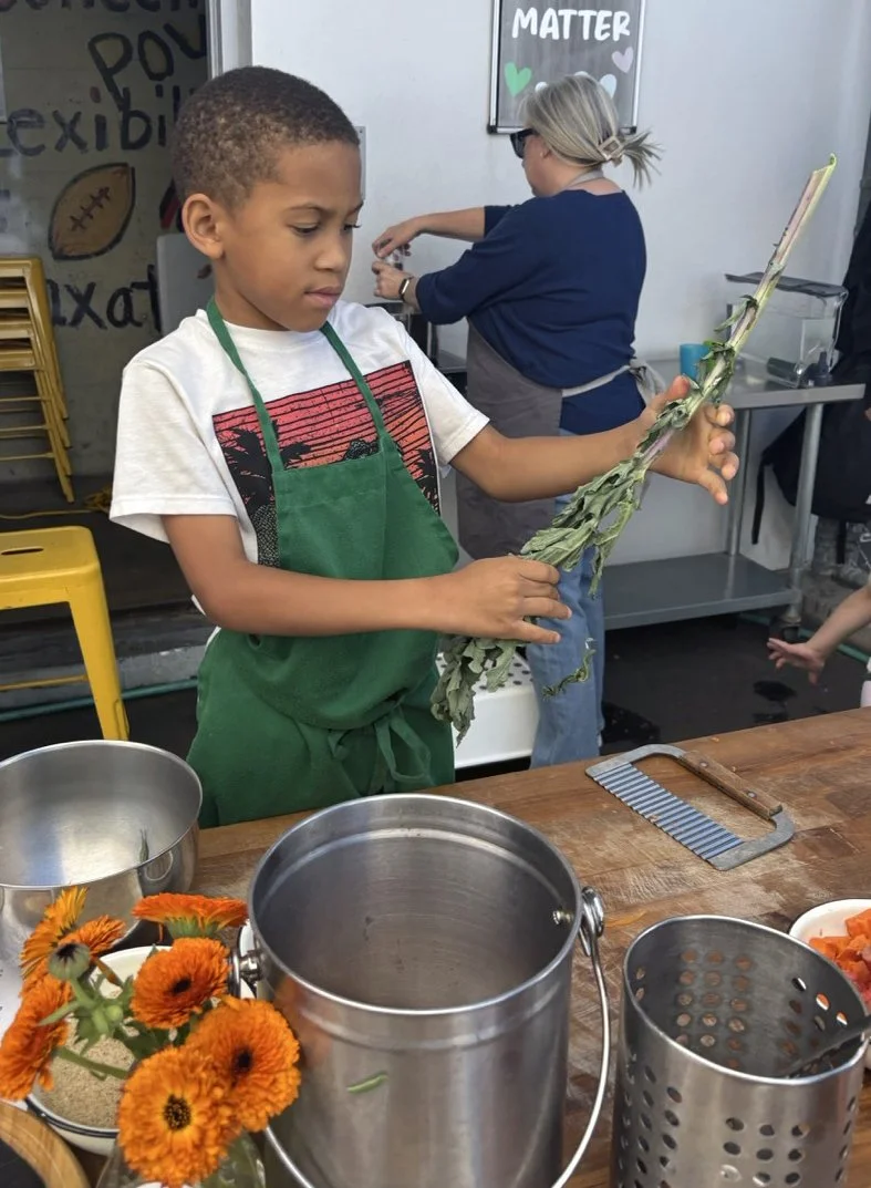 In the kitchen we worked with a West African staple grain called fonio and made a pilaf featuring native African ingredients black-eyed peas and harissa. Our recipe incorporated sweet potato as a substitute for yams, which are native to the African continent, and the Red Russian kale Ms. Meri has helped students grow on the schoolyard (leafy greens native to Harvey Milk)! Every chef had a chance to try a new food this week.