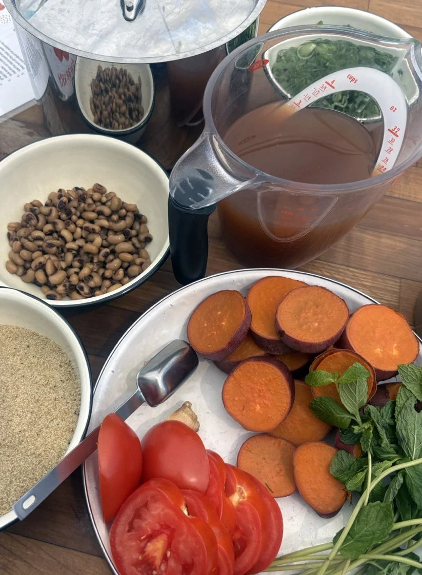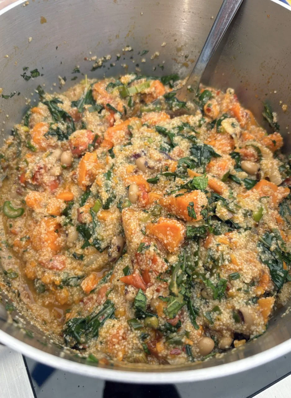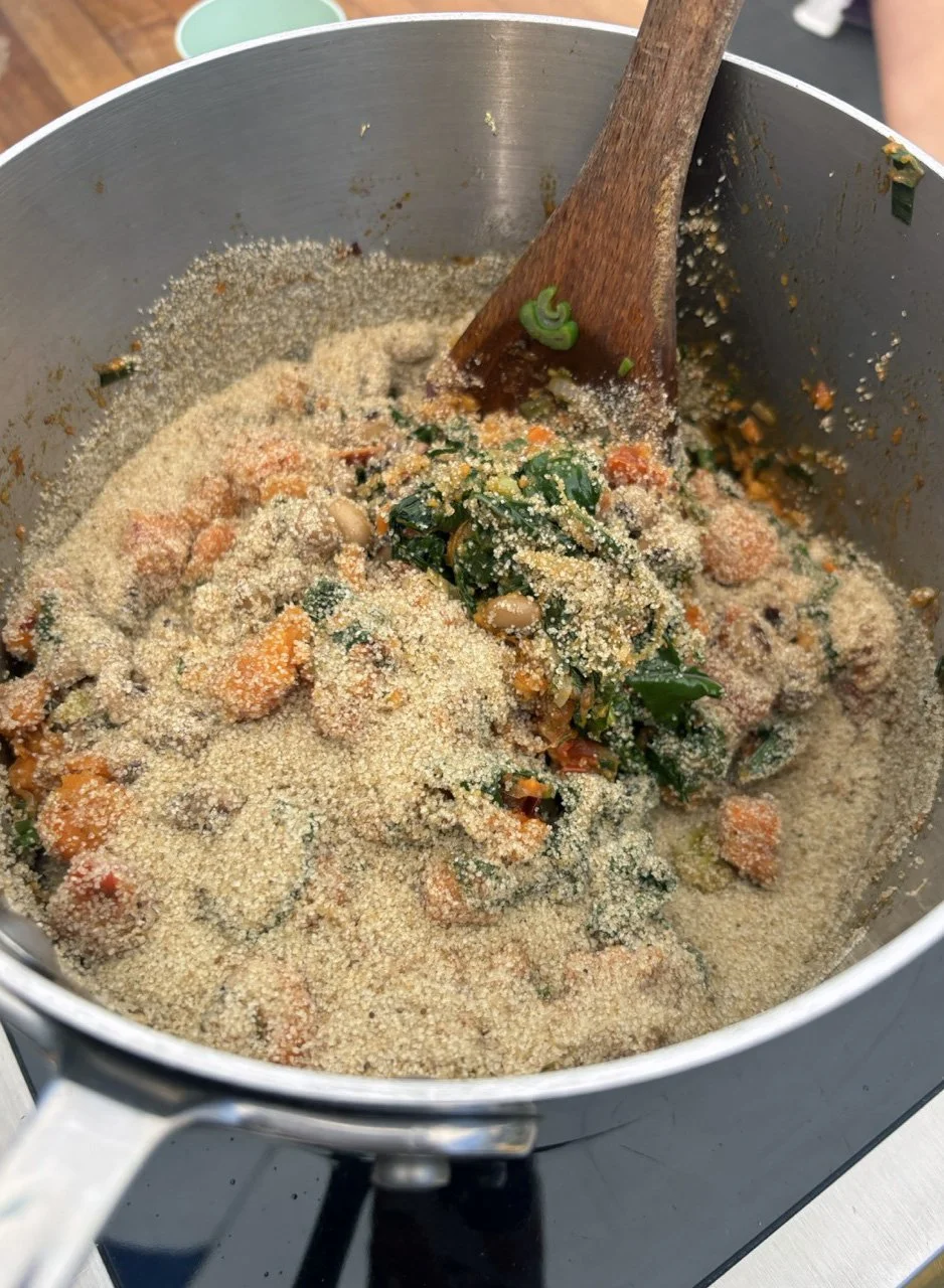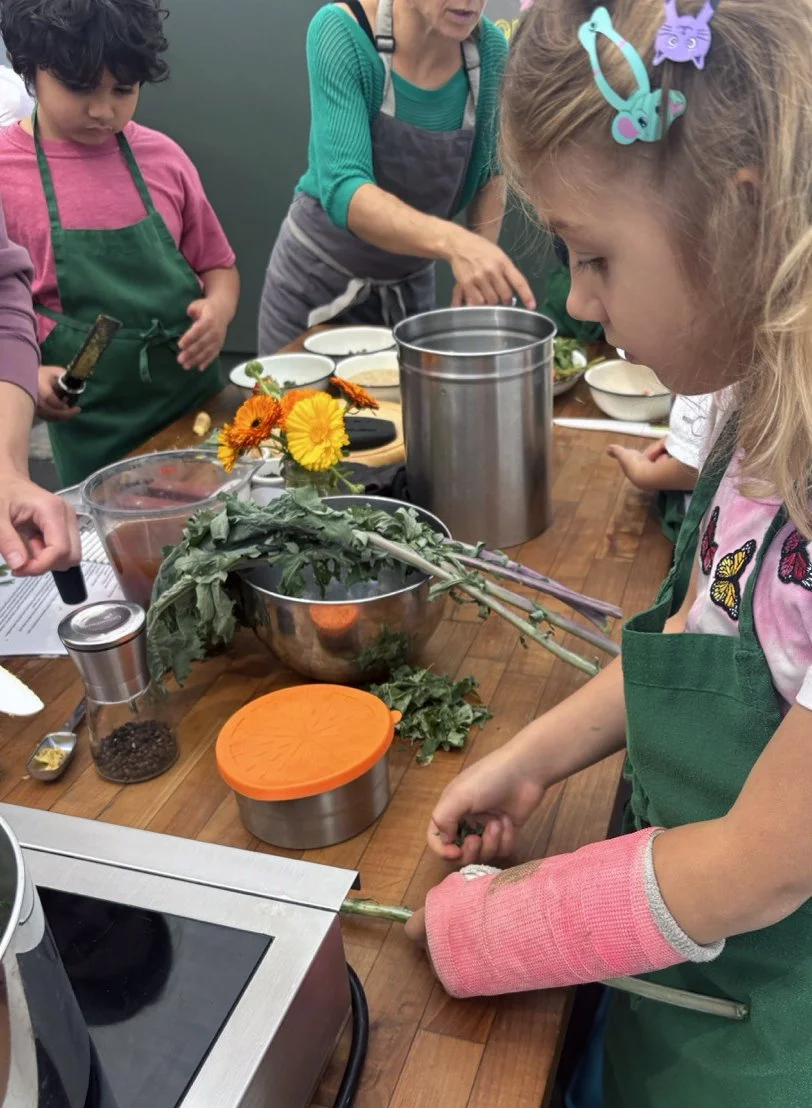 In the kitchen we worked with a West African staple grain called fonio and made a pilaf featuring native African ingredients black-eyed peas and harissa. Our recipe incorporated sweet potato as a substitute for yams, which are native to the African continent, and the Red Russian kale Ms. Meri has helped students grow on the schoolyard (leafy greens native to Harvey Milk)! Every chef had a chance to try a new food this week.